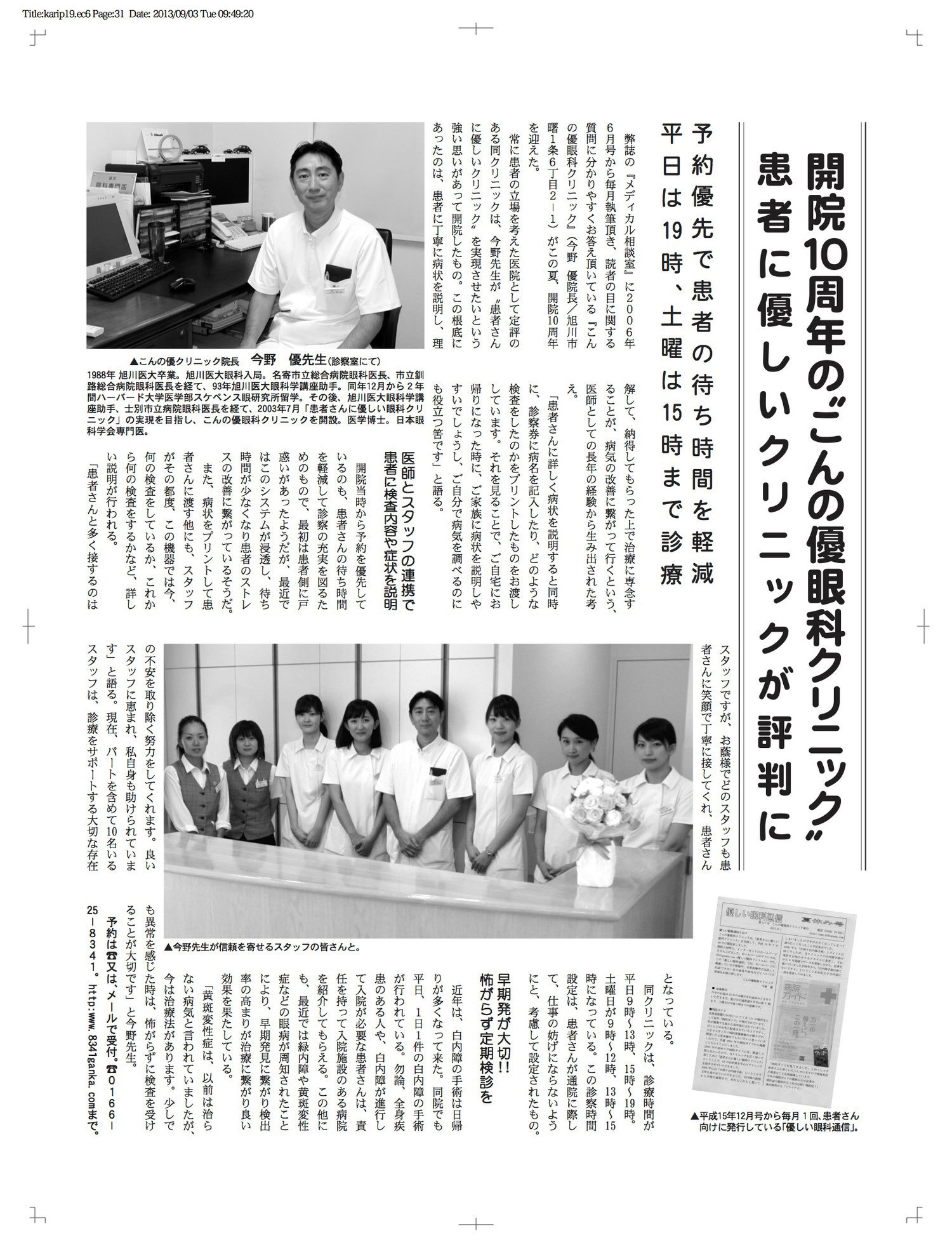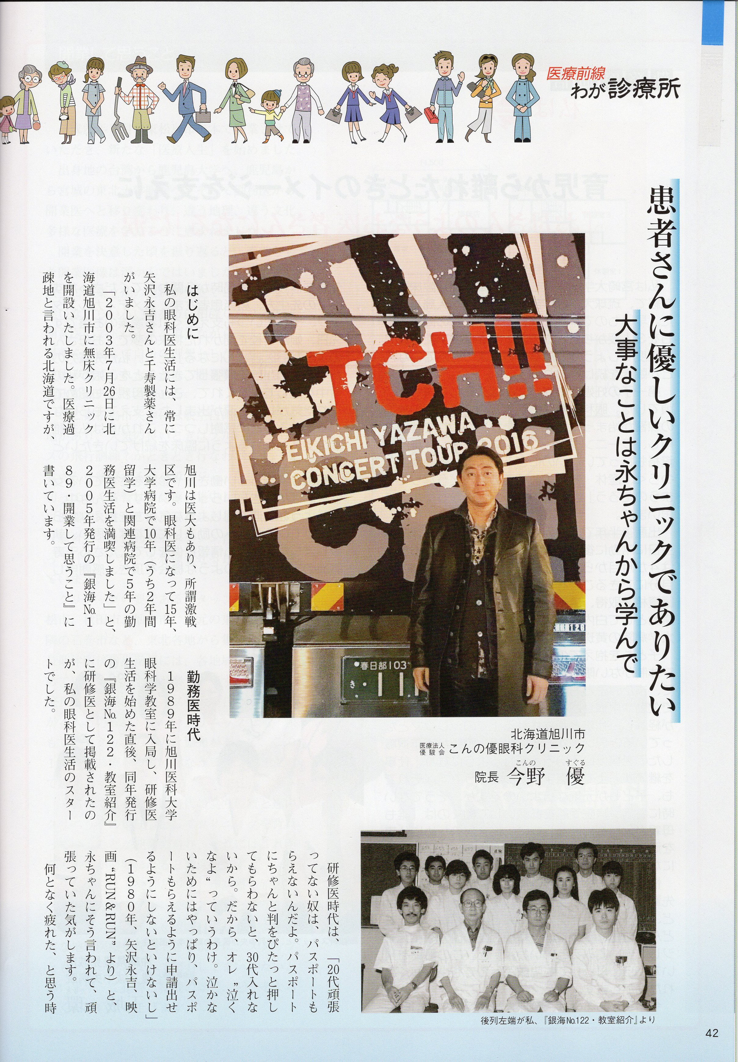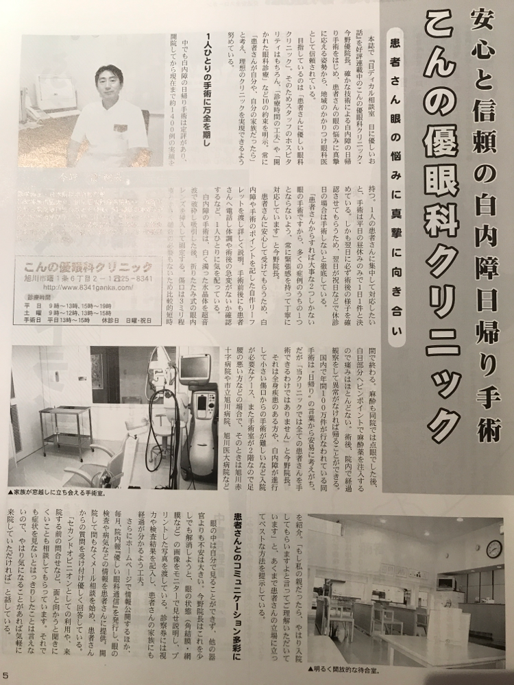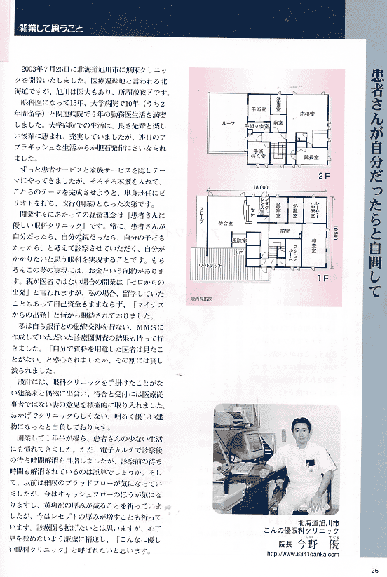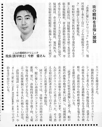 新年あけましておめでとうございます。本年もご指導ご鞭撻のほど何とぞよろしくお願い申し上げます。申し遅れました。私、旭川で開業しております今野優でございます。私のことを知らないほとんどの方は「フーン」という感じで、左目から右目に受け流していたことと思います(古いかっ)。旭川市医師会、眼科医会の方は「へエー、48歳になるんだね」といった感じでしょうか。しかし、「エッ」と違和感をお持ちになった方もいらっしゃると思います。