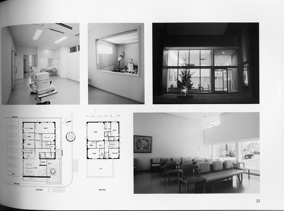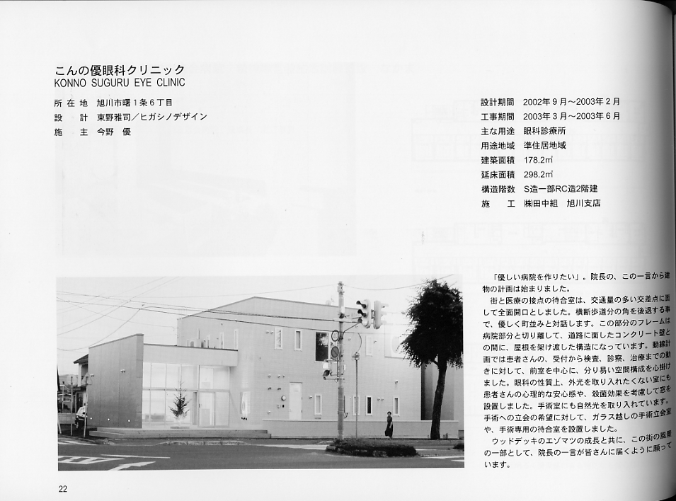 今回の旭川建築作品発表会作品集には26作品が収載されています。22ページ・23ページの見開きに東野先生がこんの優眼科クリニックを紹介して下さいました。