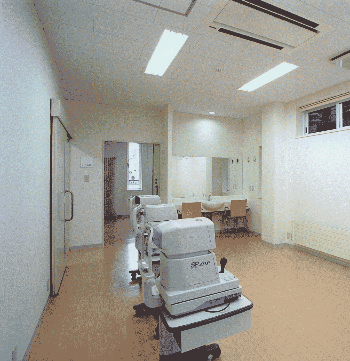 街と医療の接点の待合室は、交通量の多い交差点に面して全面開口としました。横断歩道分の角を後退する事で、優しく町並みと対話します。この部分のフレームは病院部分と切り離して、道路に面したコンクリート壁との間に、屋根を架け渡した構造になっています。動線計画では患者さんの、受付から検査、診察、治療までの動きに対して、前室を中心に、分り易い空間構成を心掛けました。眼科の性質上、外光を取り入れたくない室にも患者さんの心理的な安心感や、殺菌効果を考慮して窓を設置しました。手術室にも自然光を取り入れています。手術への立会の希望に対して、ガラス越しの手術立会室や、手術専用の待合室を設置しました。