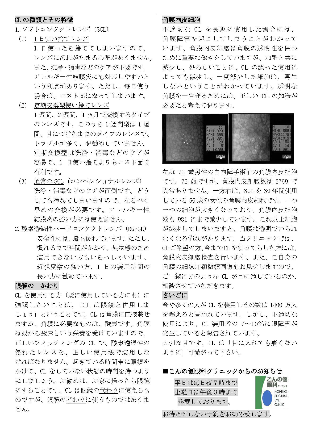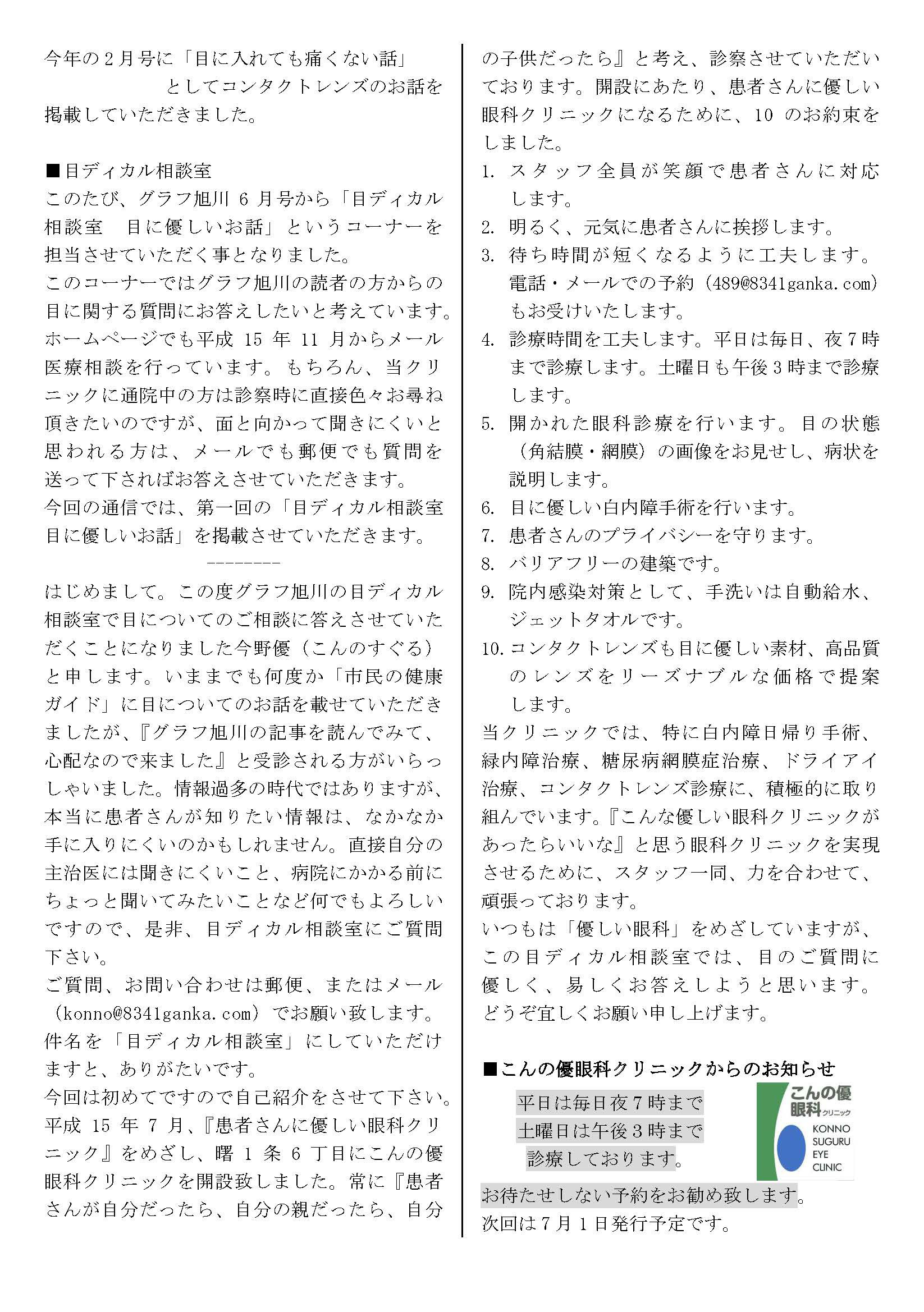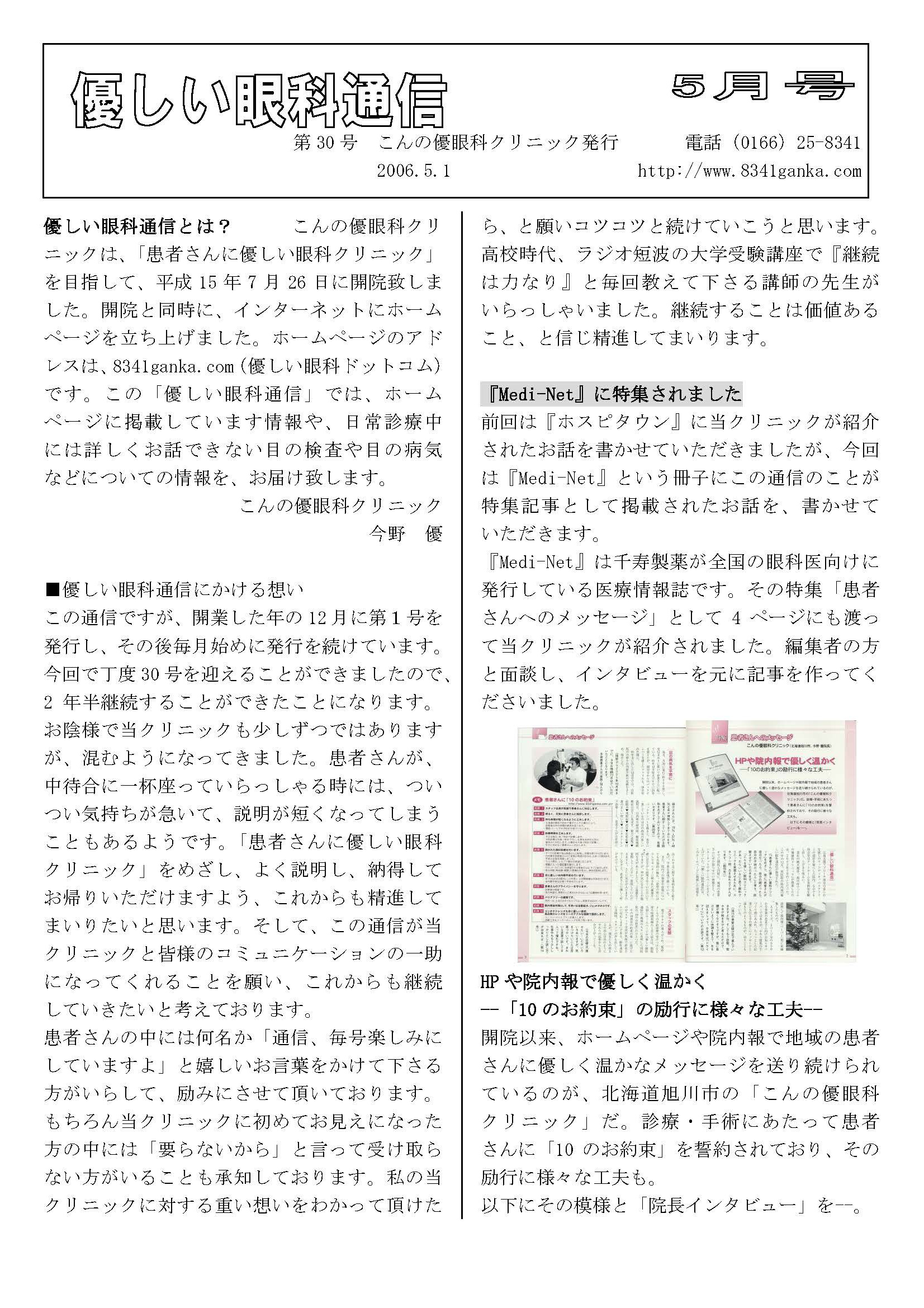 こんの優眼科クリニックは、「患者さんに優しい眼科クリニック」を目指して、平成15年7月26日に開院致しました。開院と同時に、インターネットにホームページを立ち上げました。ホームページのアドレスは8341ganka.com(優しい眼科ドットコム)です。この「優しい眼科通信」では、ホームページに掲載しています情報や、日常診療中には詳しくお話できない目の検査や目の病気などについての情報を、お届けいたします。