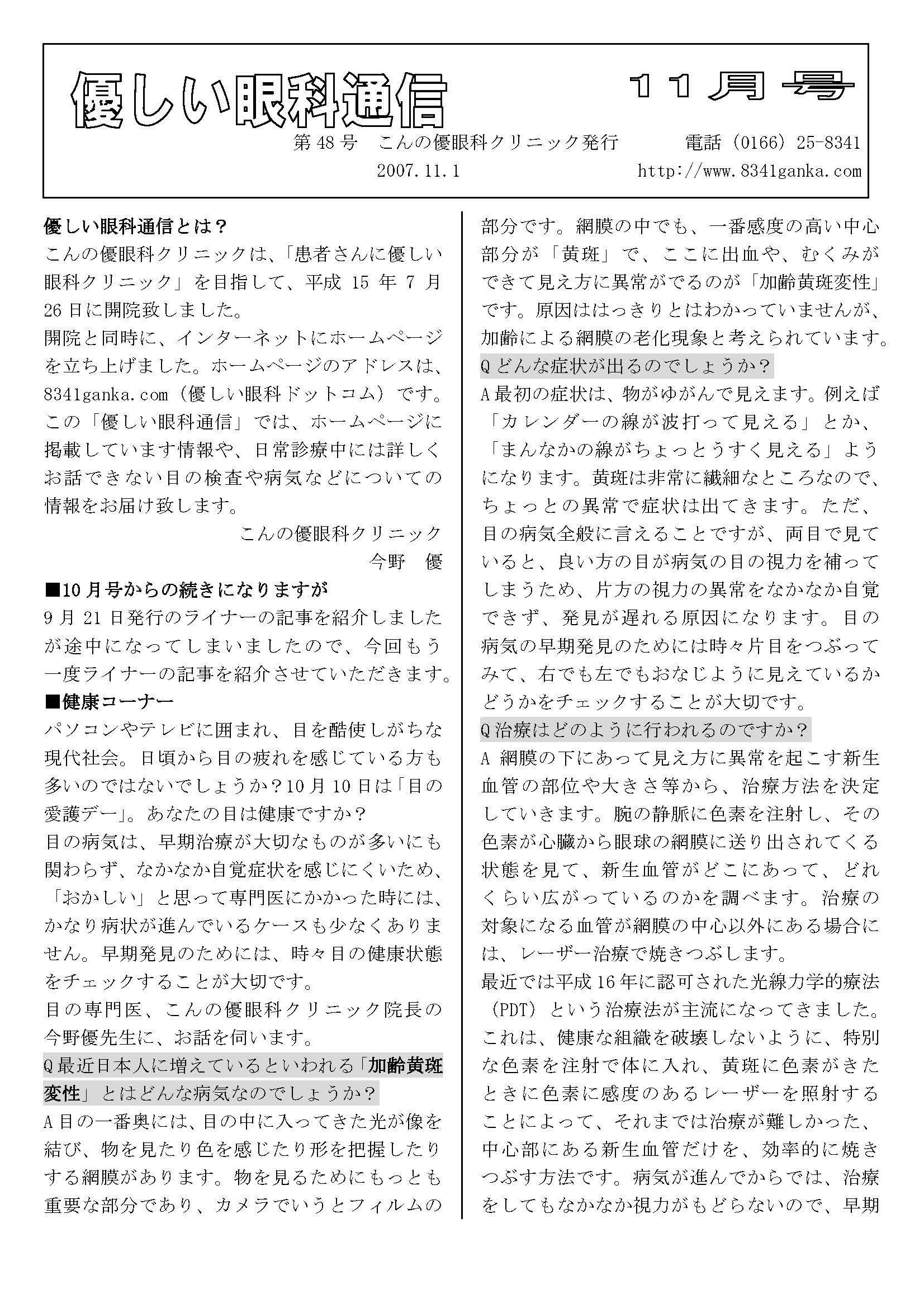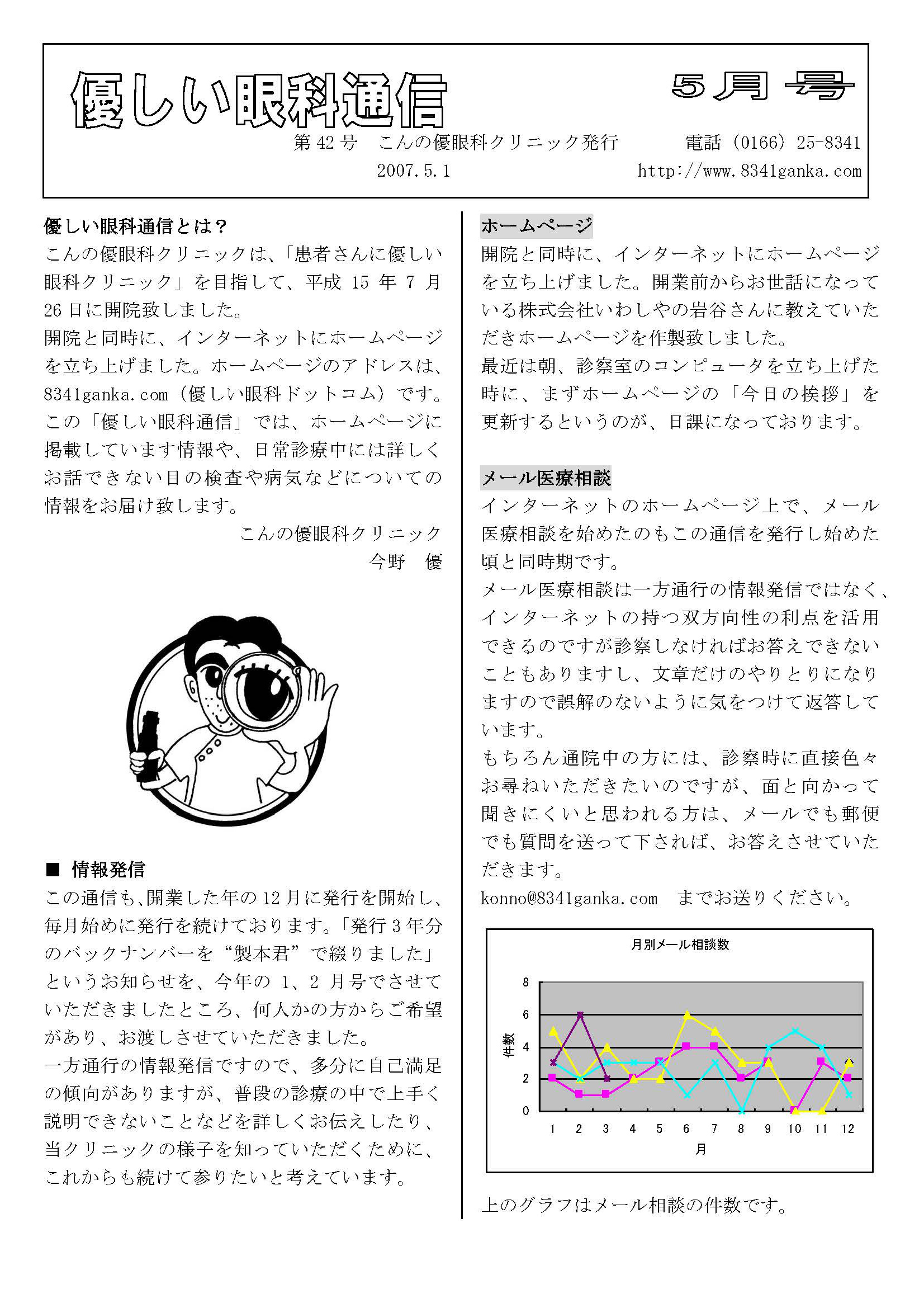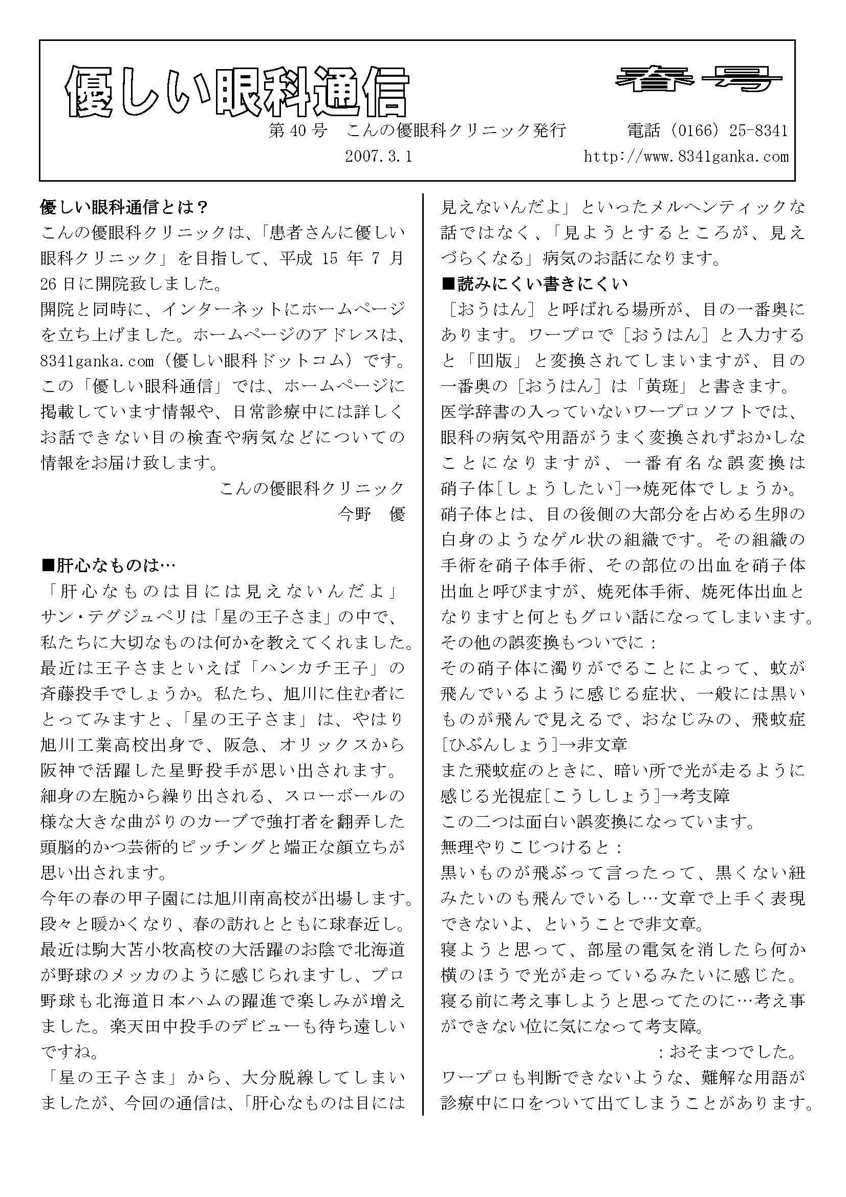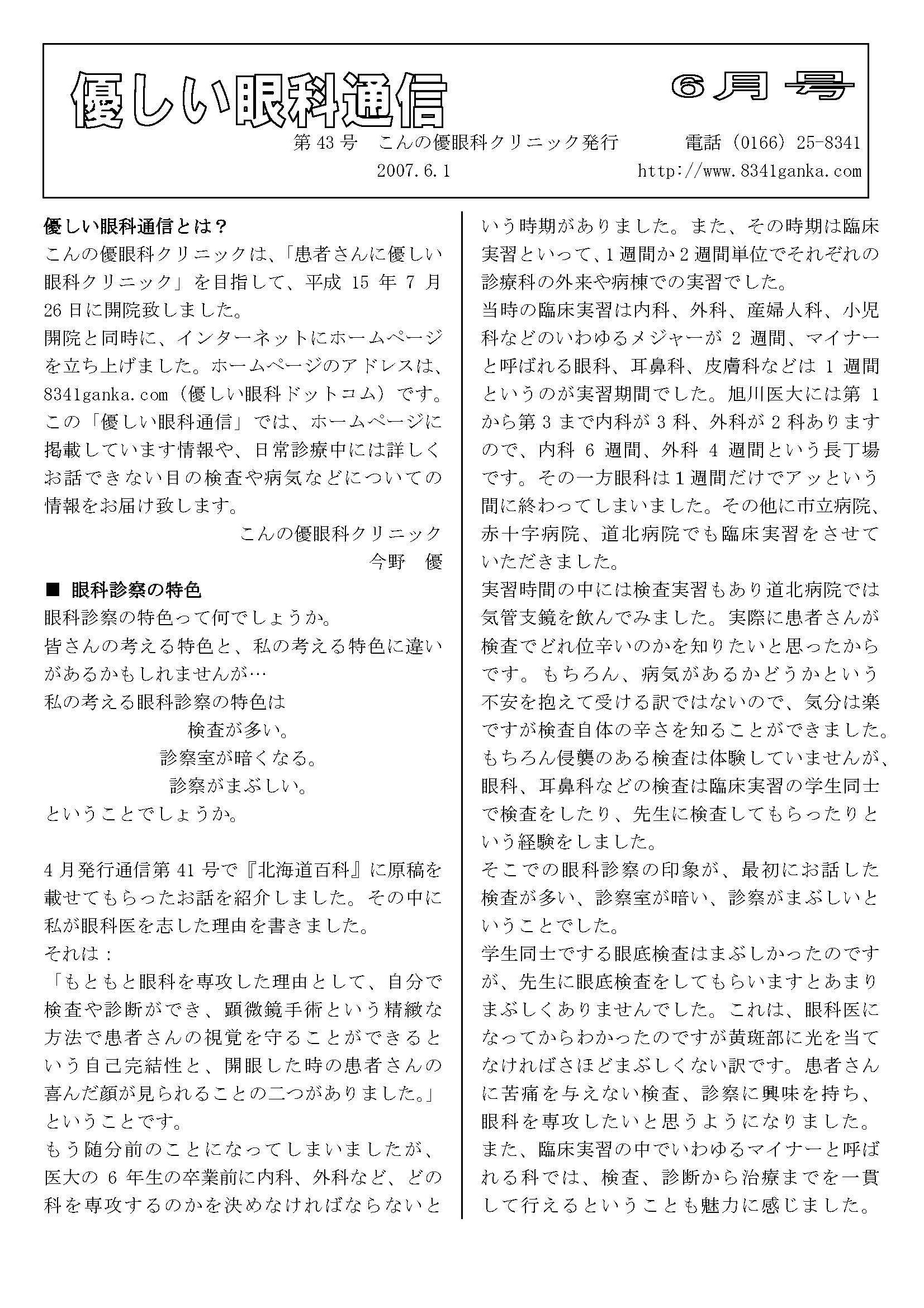 こんの優眼科クリニックは、「患者さんに優しい眼科クリニック」を目指して、平成15年7月26日に開院致しました。開院と同時に、インターネットにホームページを立ち上げました。ホームページのアドレスは8341ganka.com(優しい眼科ドットコム)です。この「優しい眼科通信」では、ホームページに掲載しています情報や、日常診療中には詳しくお話できない目の検査や目の病気などについての情報を、お届けいたします。