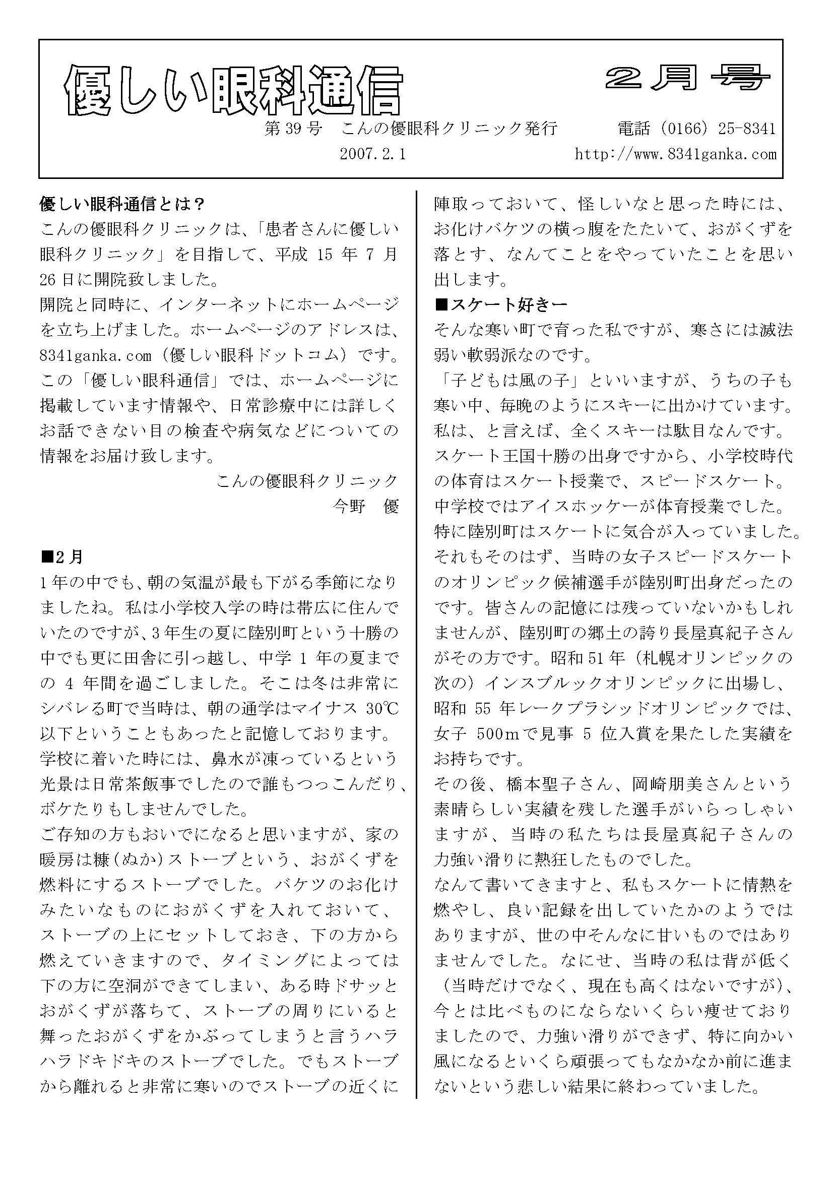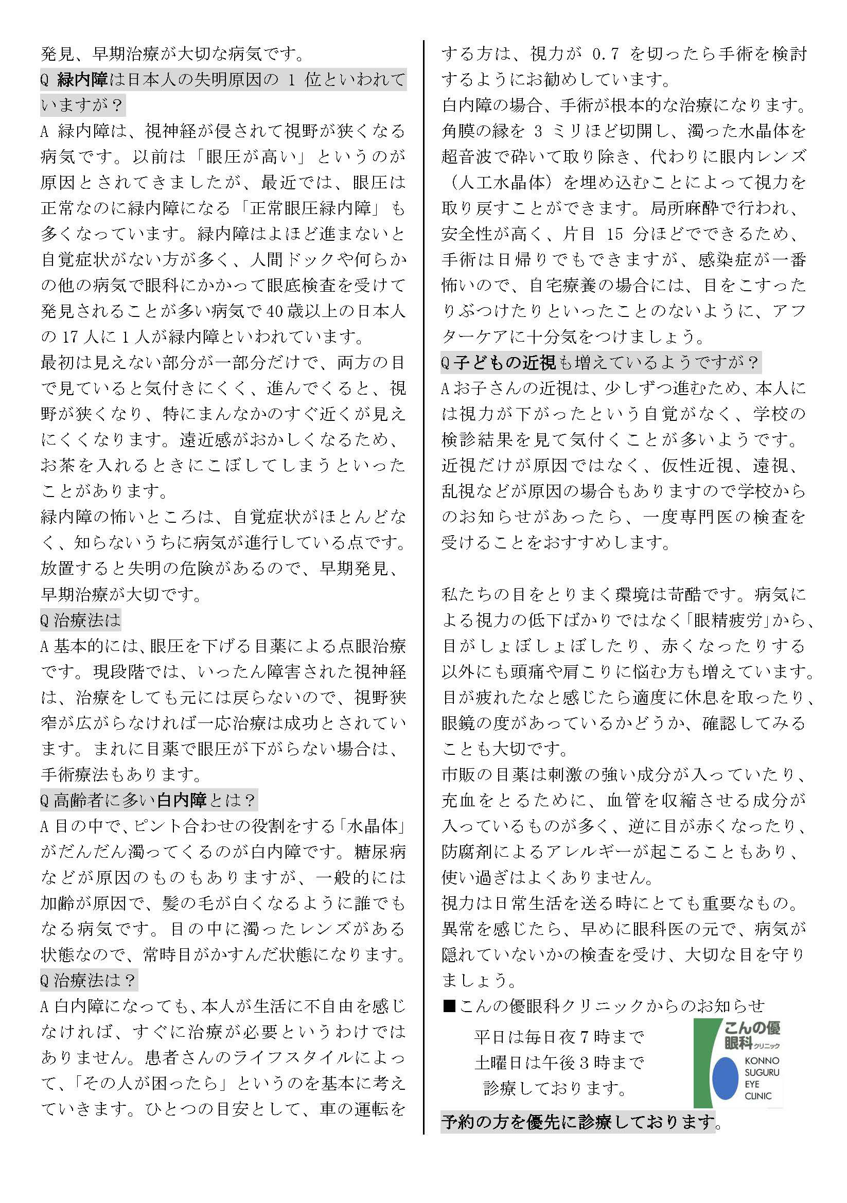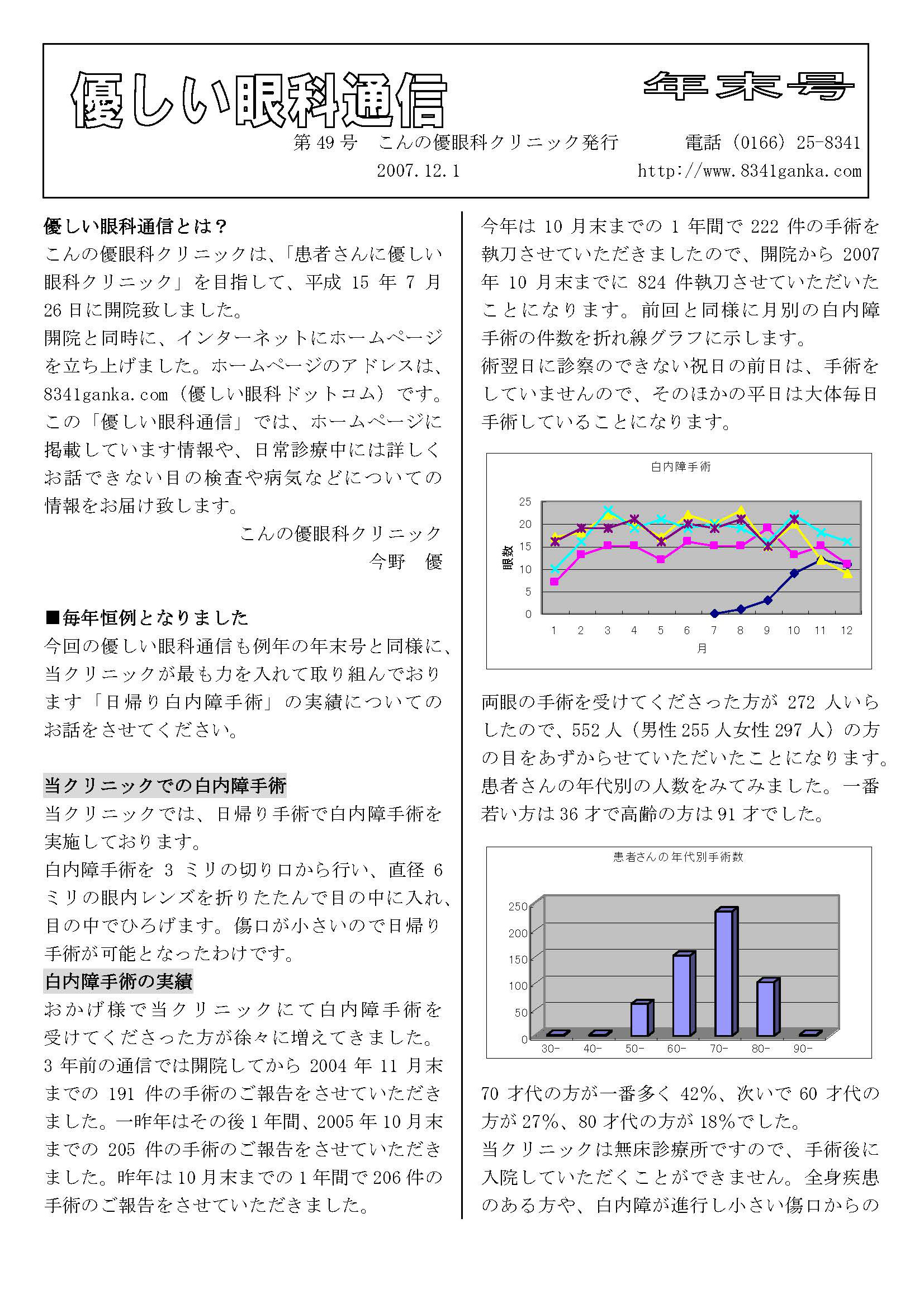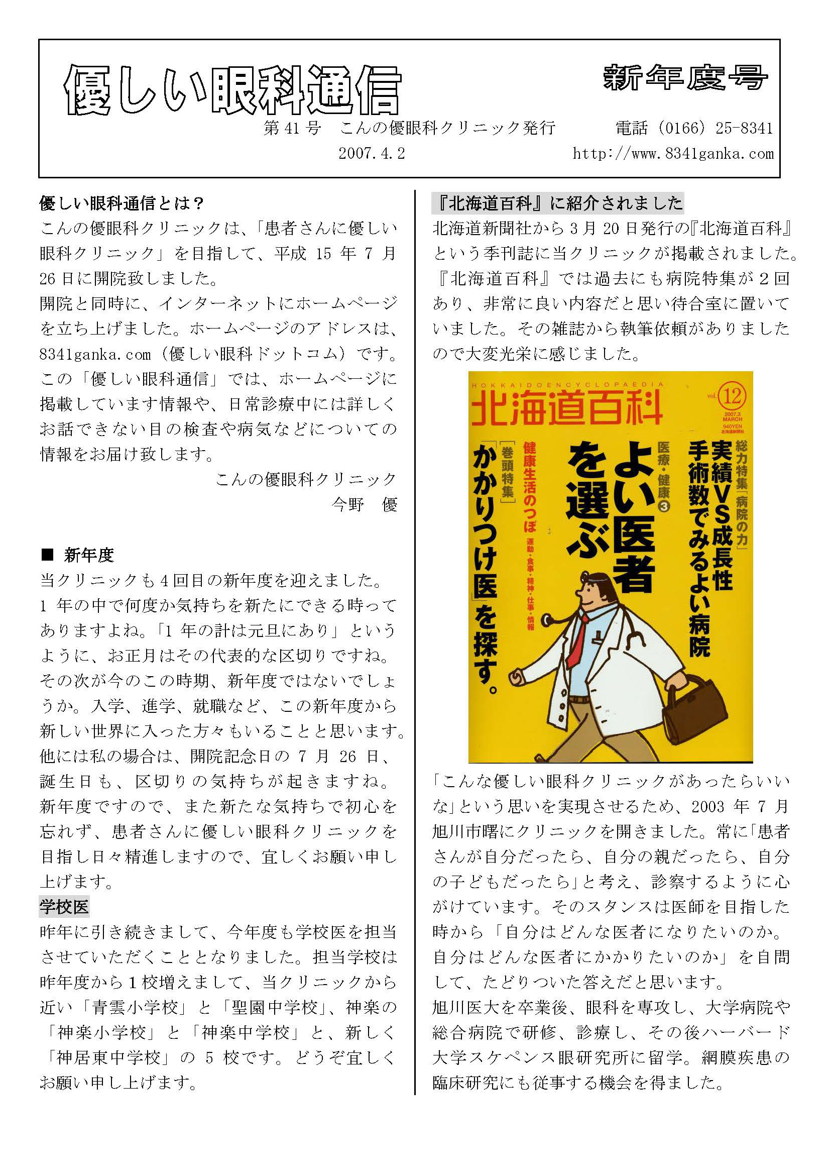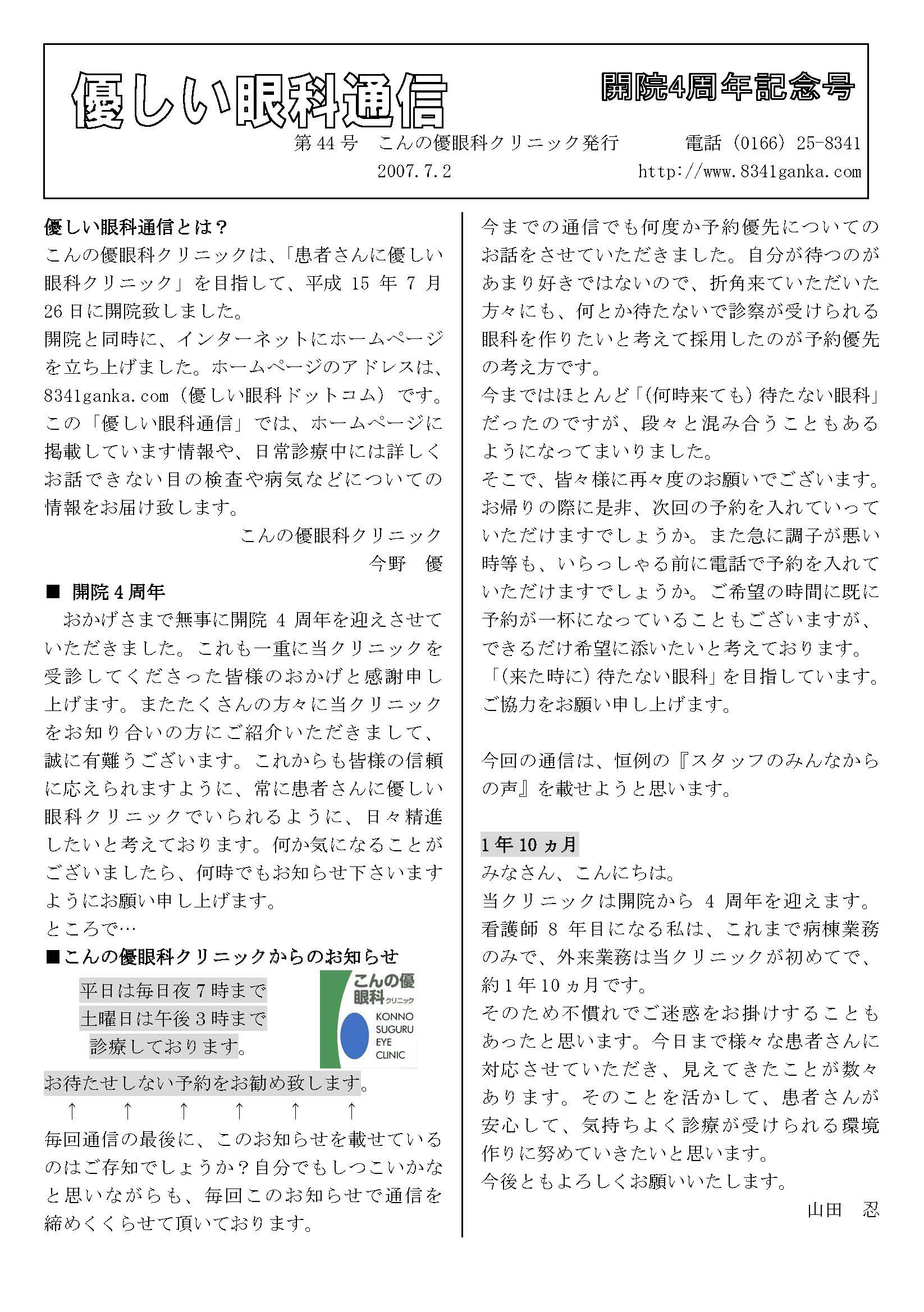 こんの優眼科クリニックは、「患者さんに優しい眼科クリニック」を目指して、平成15年7月26日に開院致しました。開院と同時に、インターネットにホームページを立ち上げました。ホームページのアドレスは8341ganka.com(優しい眼科ドットコム)です。この「優しい眼科通信」では、ホームページに掲載しています情報や、日常診療中には詳しくお話できない目の検査や目の病気などについての情報を、お届けいたします。