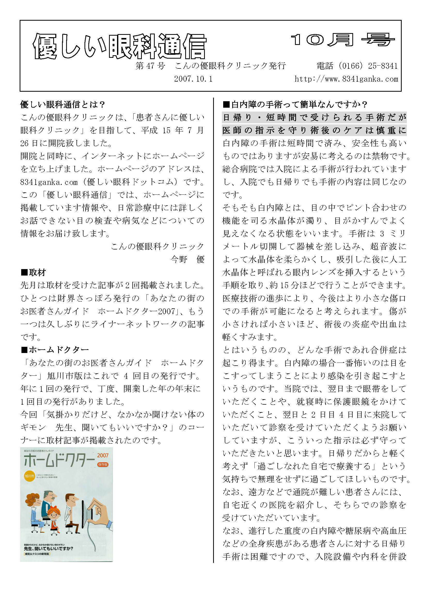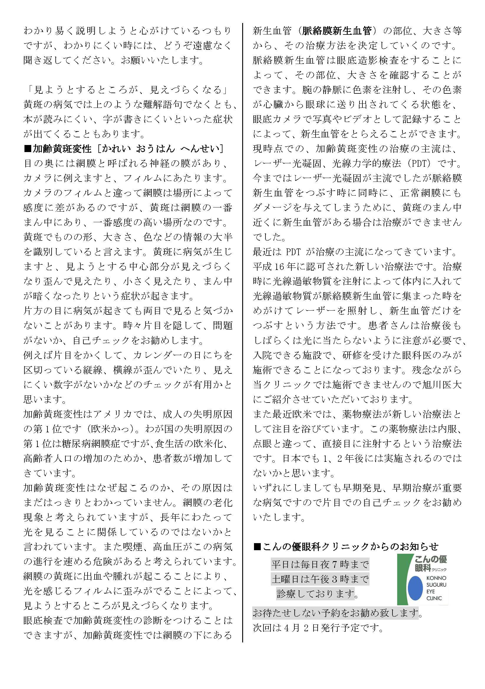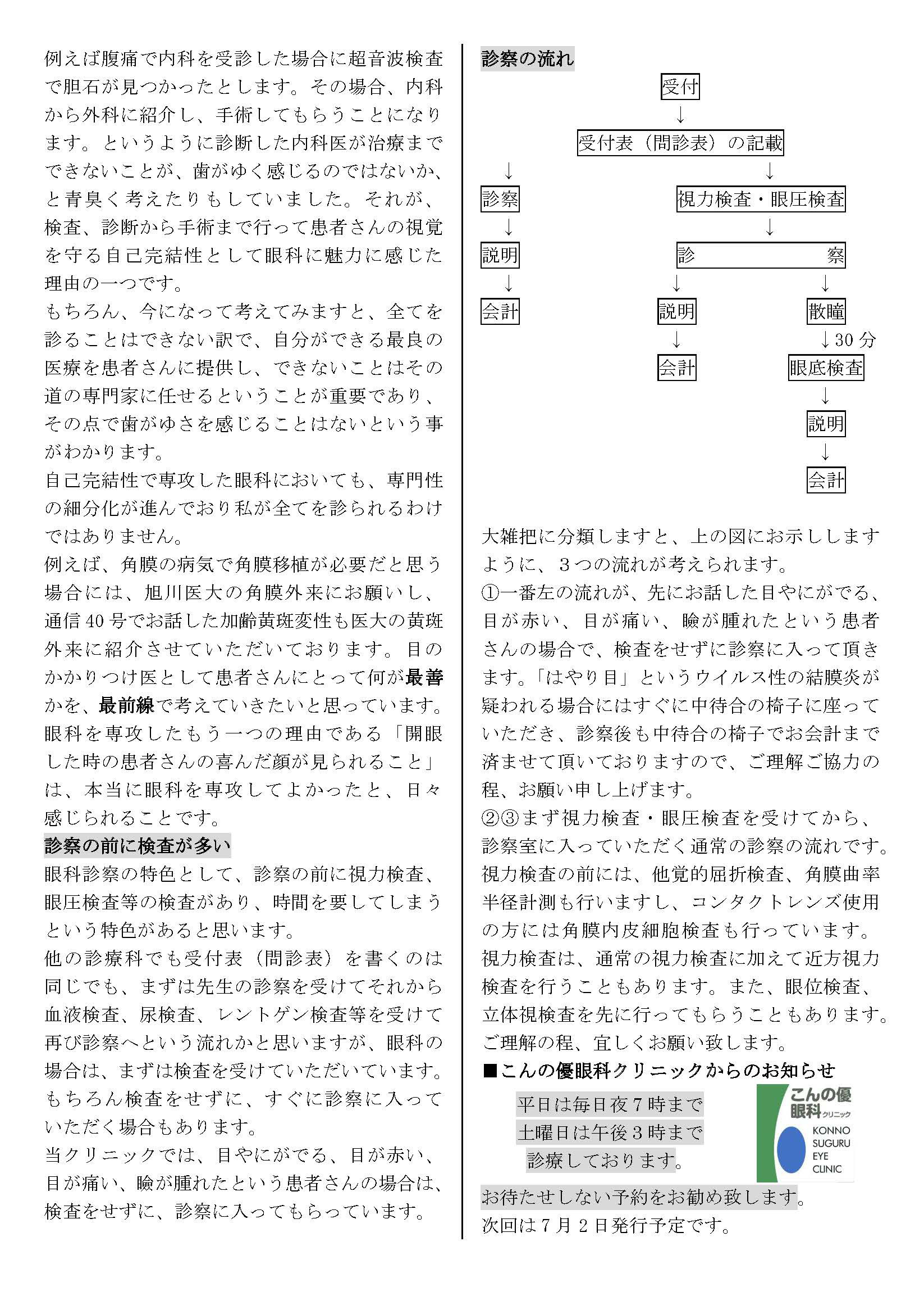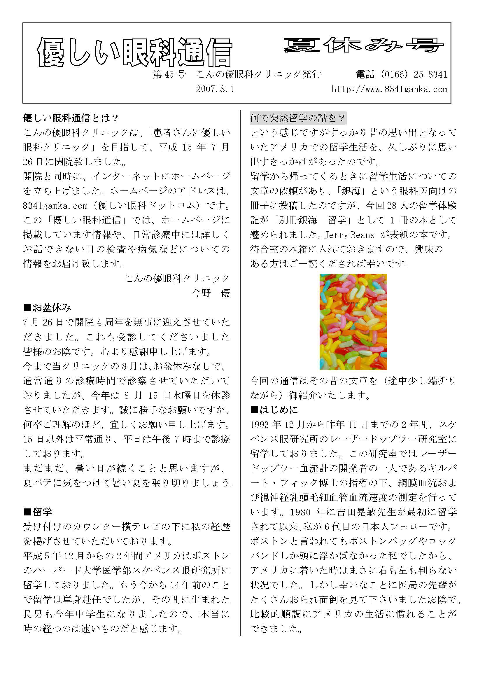 こんの優眼科クリニックは、「患者さんに優しい眼科クリニック」を目指して、平成15年7月26日に開院致しました。開院と同時に、インターネットにホームページを立ち上げました。ホームページのアドレスは8341ganka.com(優しい眼科ドットコム)です。この「優しい眼科通信」では、ホームページに掲載しています情報や、日常診療中には詳しくお話できない目の検査や目の病気などについての情報を、お届けいたします。