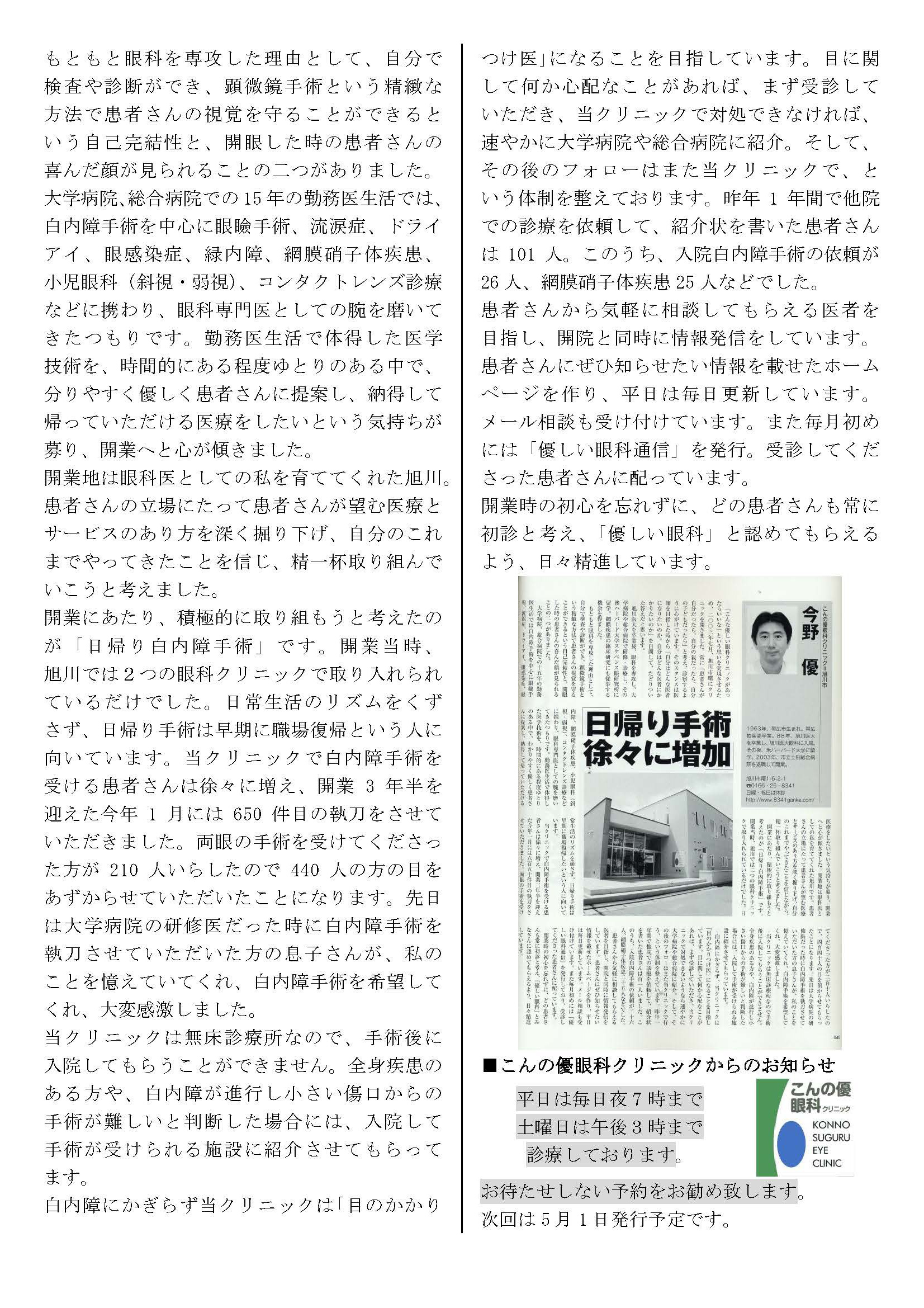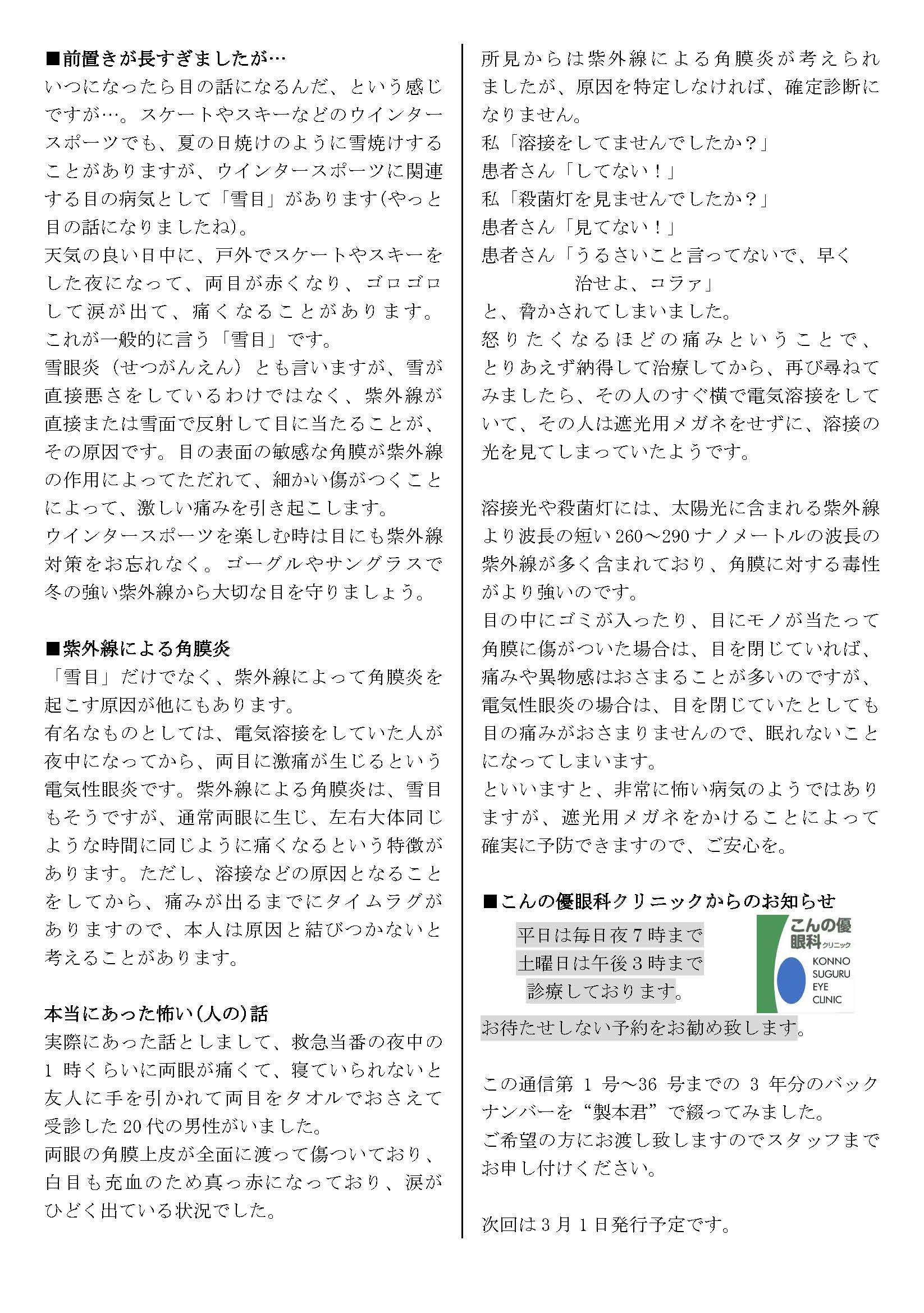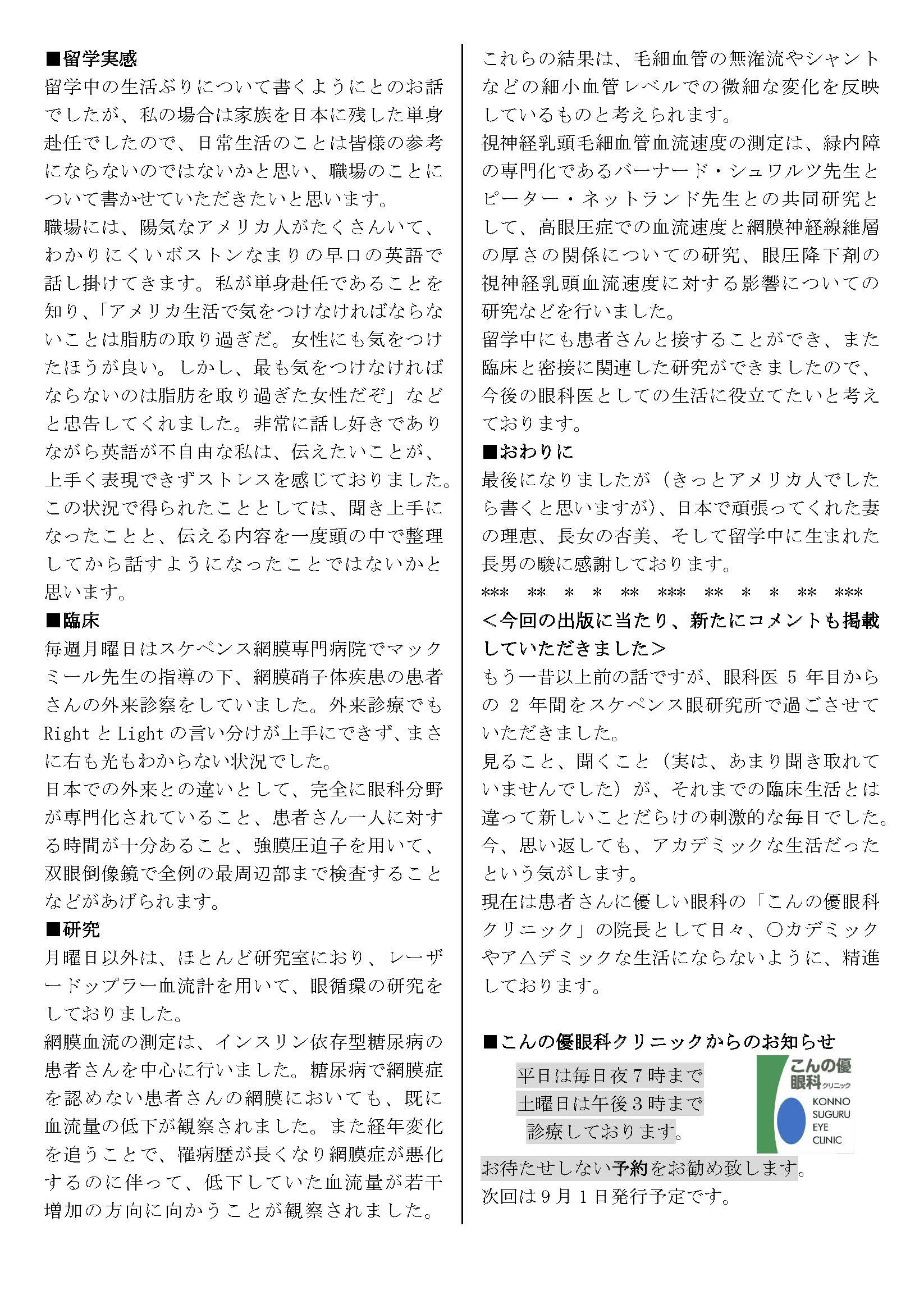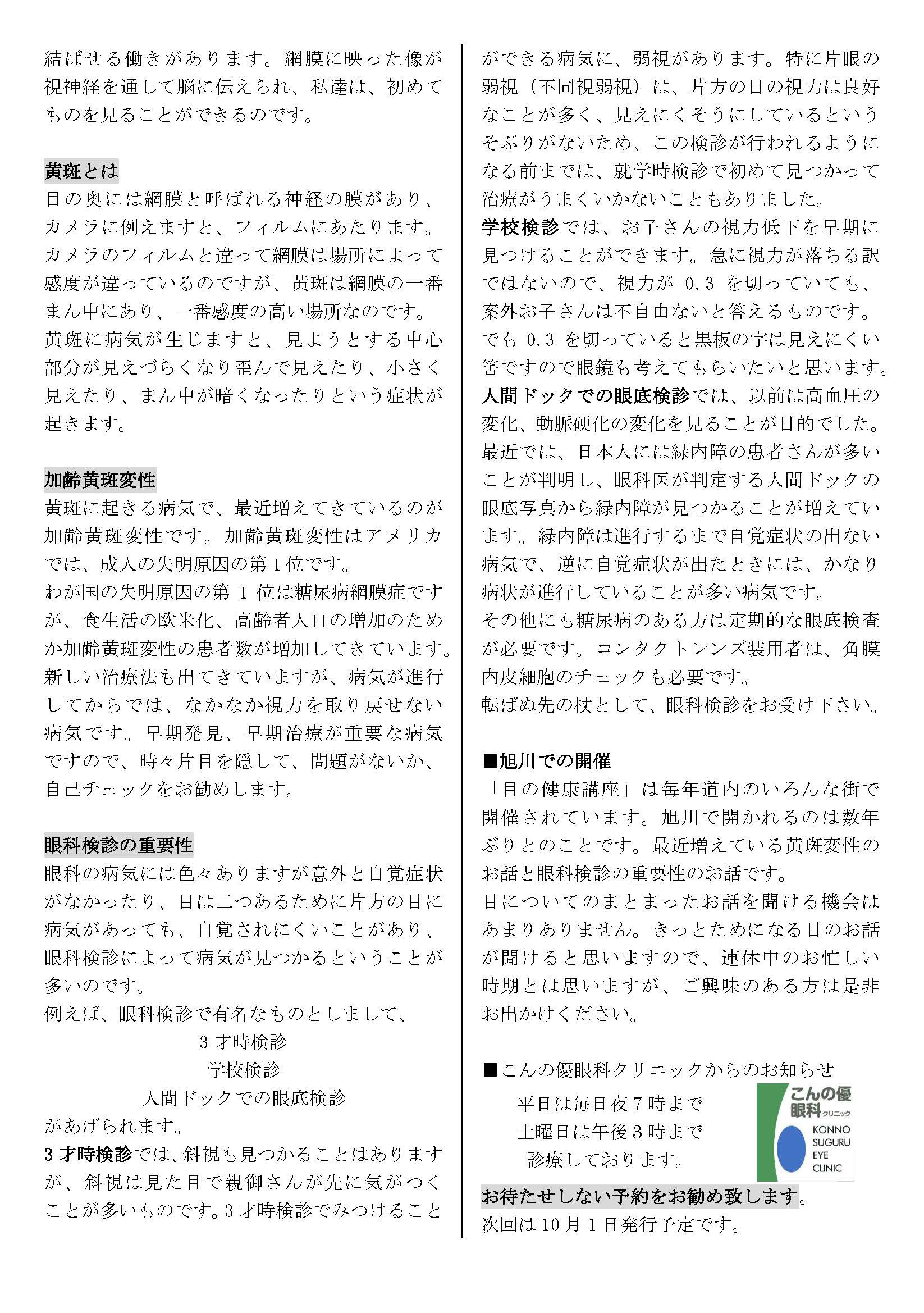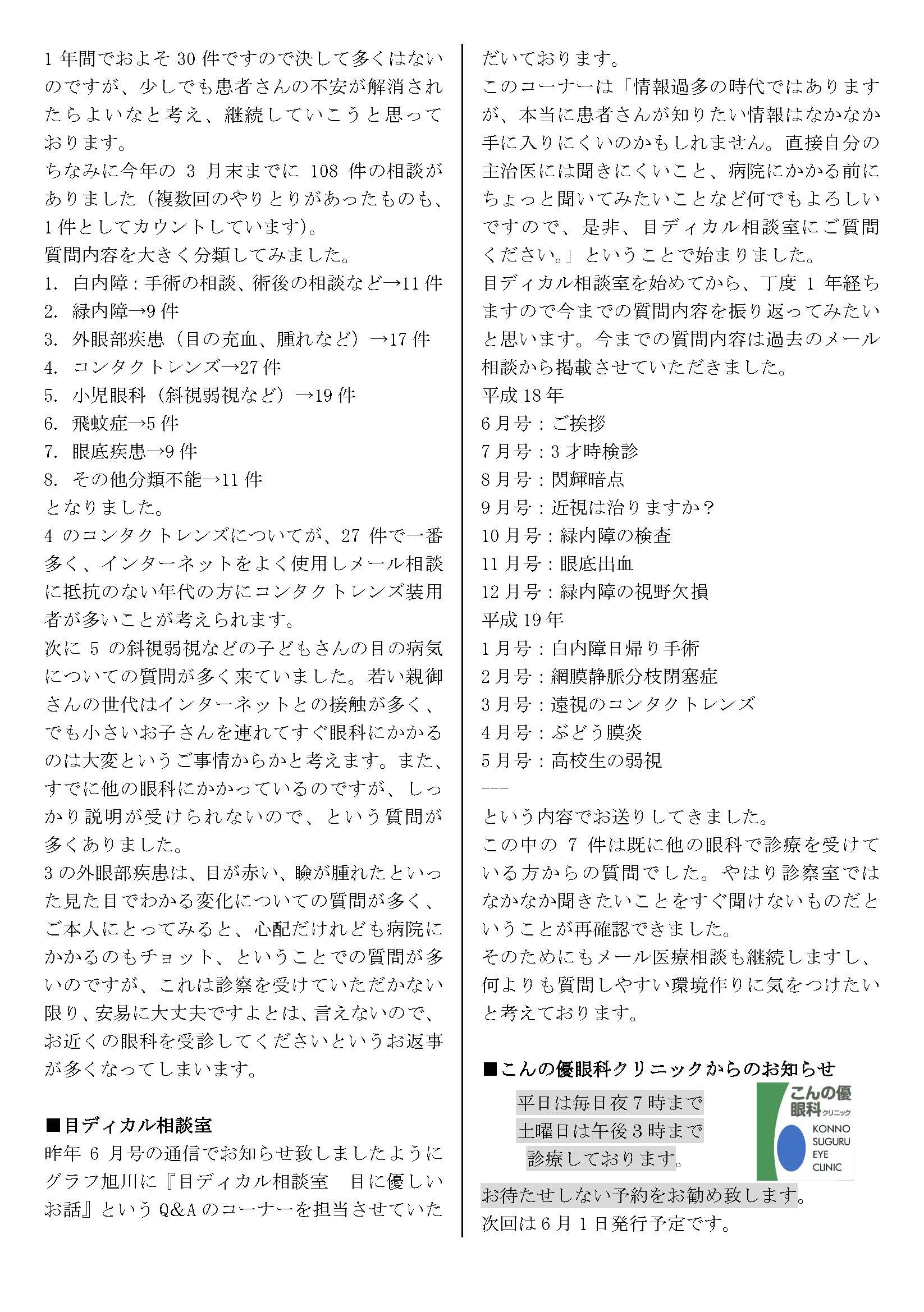 こんの優眼科クリニックは、「患者さんに優しい眼科クリニック」を目指して、平成15年7月26日に開院致しました。開院と同時に、インターネットにホームページを立ち上げました。ホームページのアドレスは8341ganka.com(優しい眼科ドットコム)です。この「優しい眼科通信」では、ホームページに掲載しています情報や、日常診療中には詳しくお話できない目の検査や目の病気などについての情報を、お届けいたします。