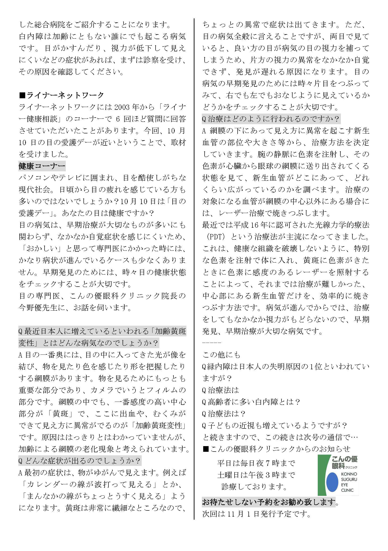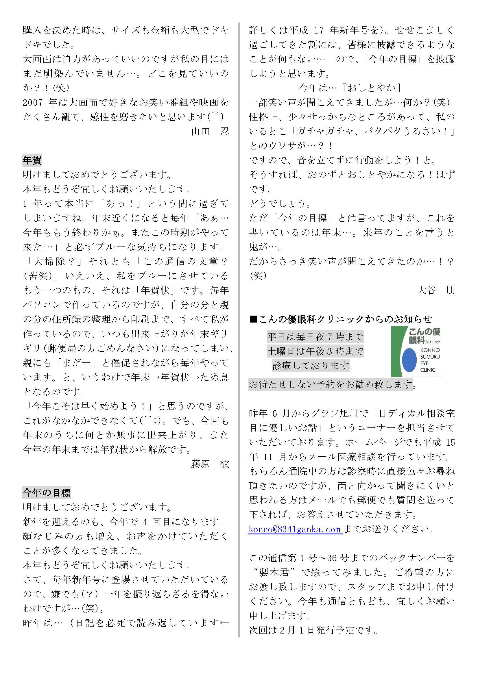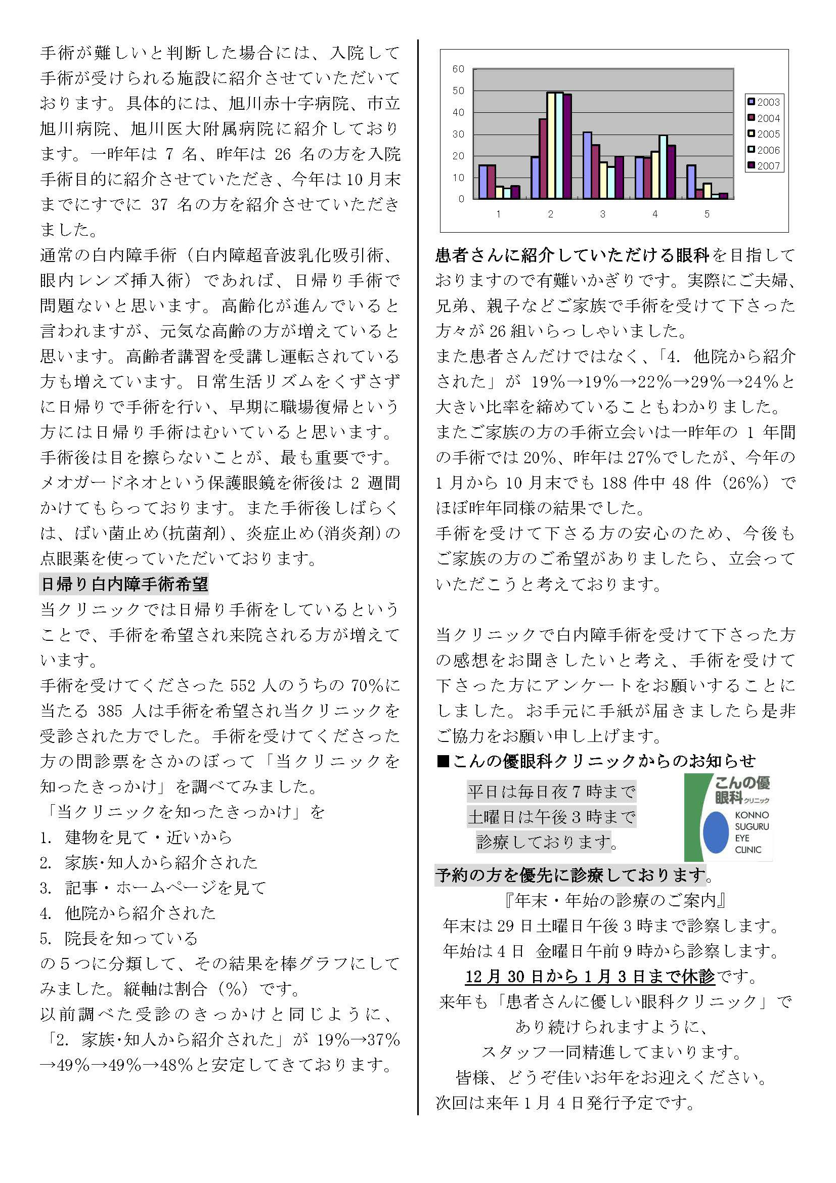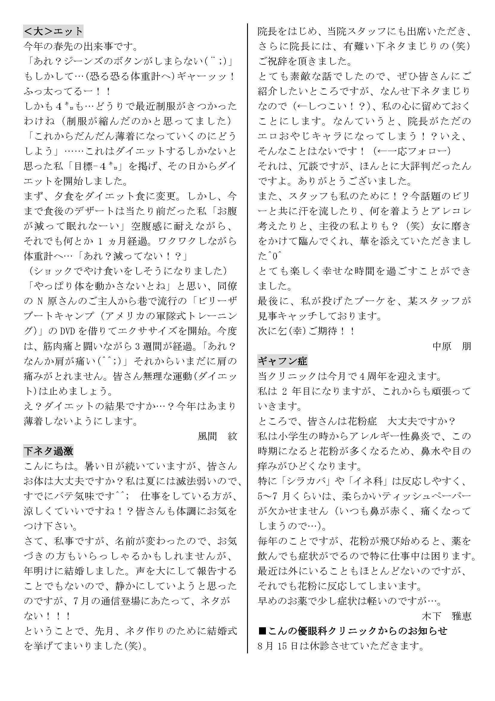 こんの優眼科クリニックは、「患者さんに優しい眼科クリニック」を目指して、平成15年7月26日に開院致しました。開院と同時に、インターネットにホームページを立ち上げました。ホームページのアドレスは8341ganka.com(優しい眼科ドットコム)です。この「優しい眼科通信」では、ホームページに掲載しています情報や、日常診療中には詳しくお話できない目の検査や目の病気などについての情報を、お届けいたします。