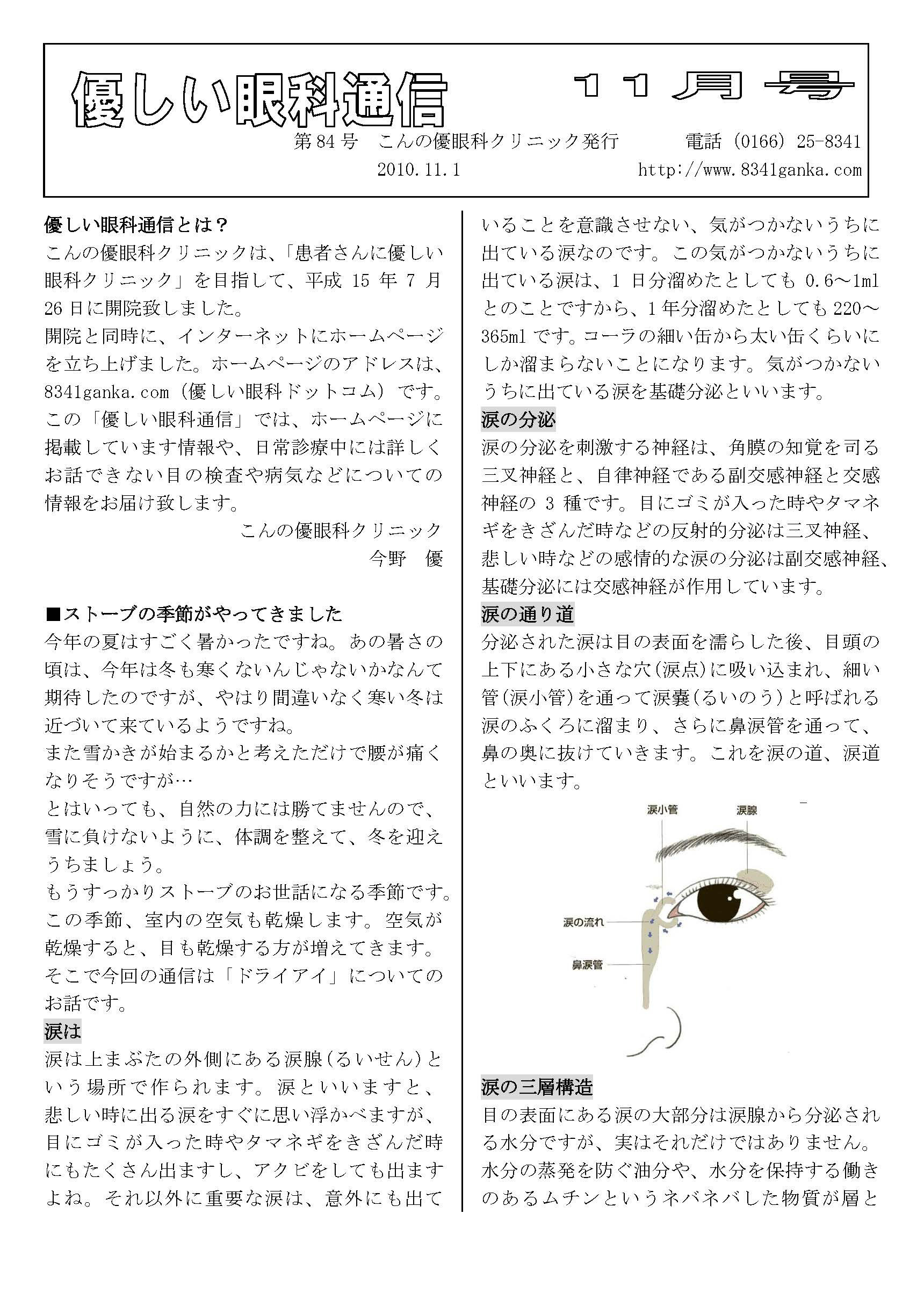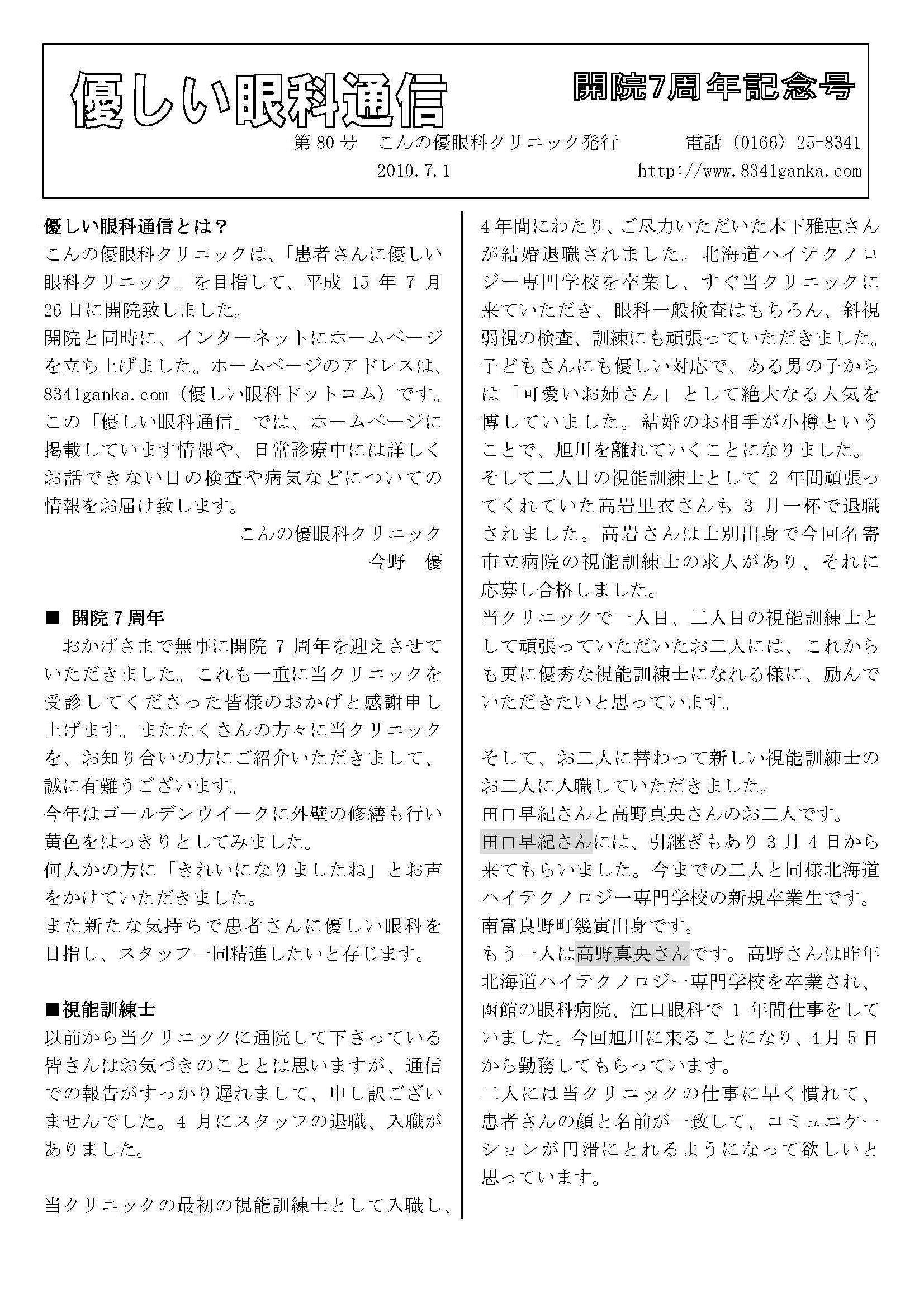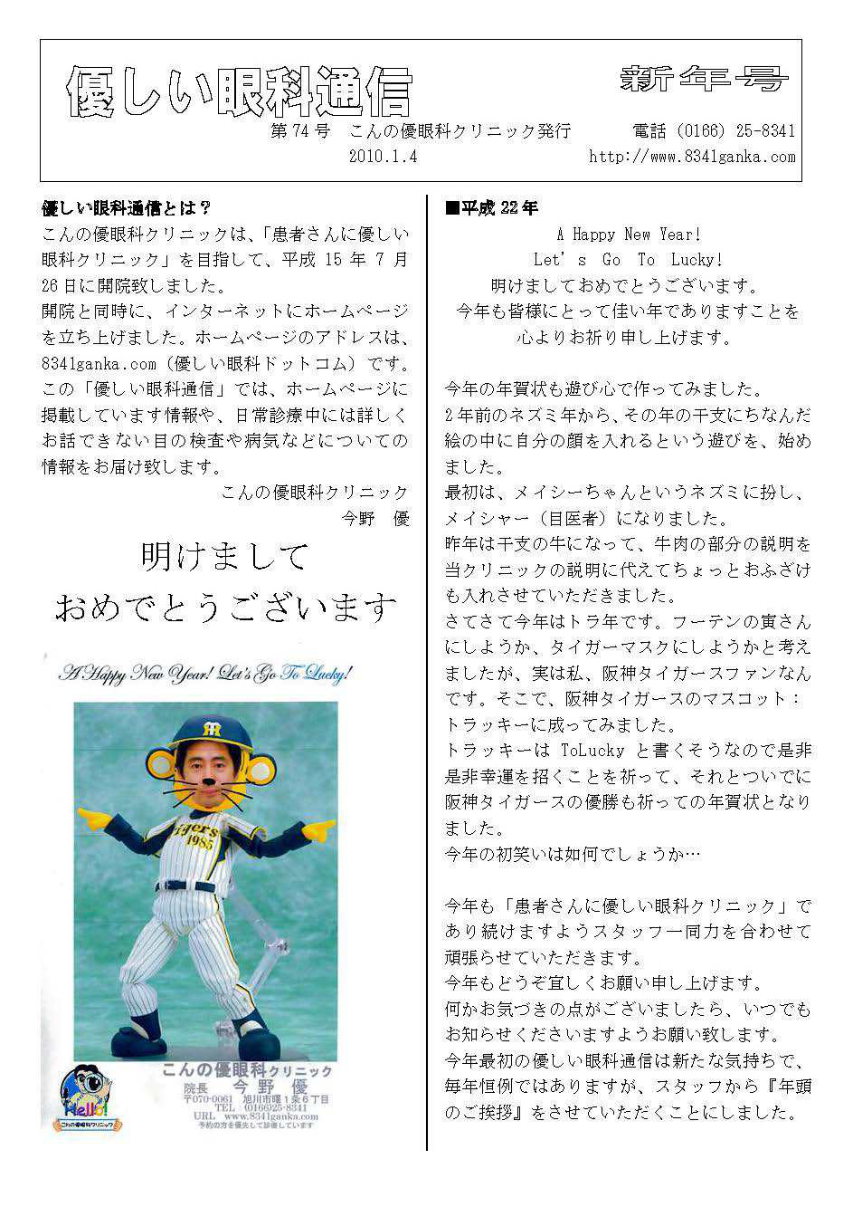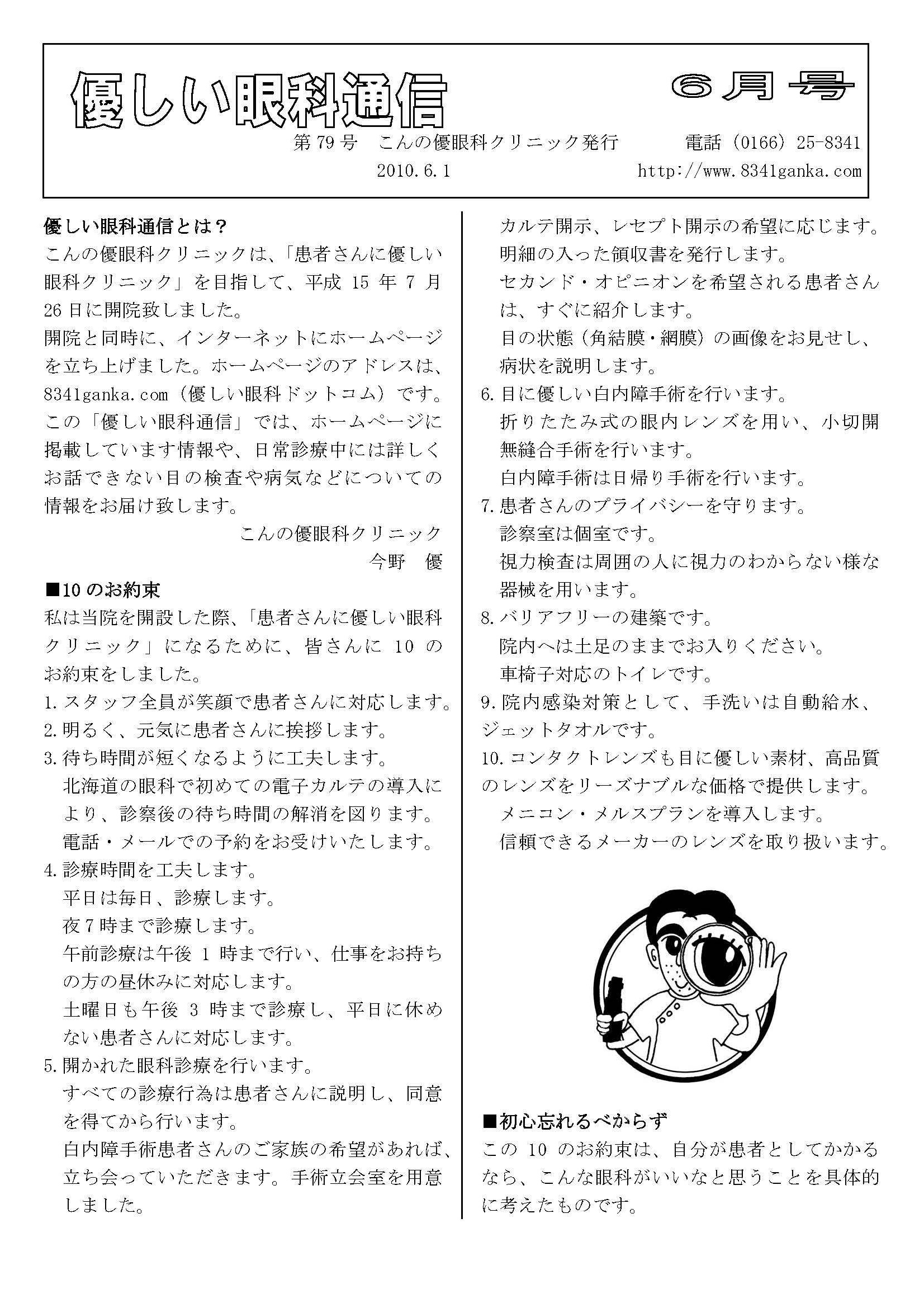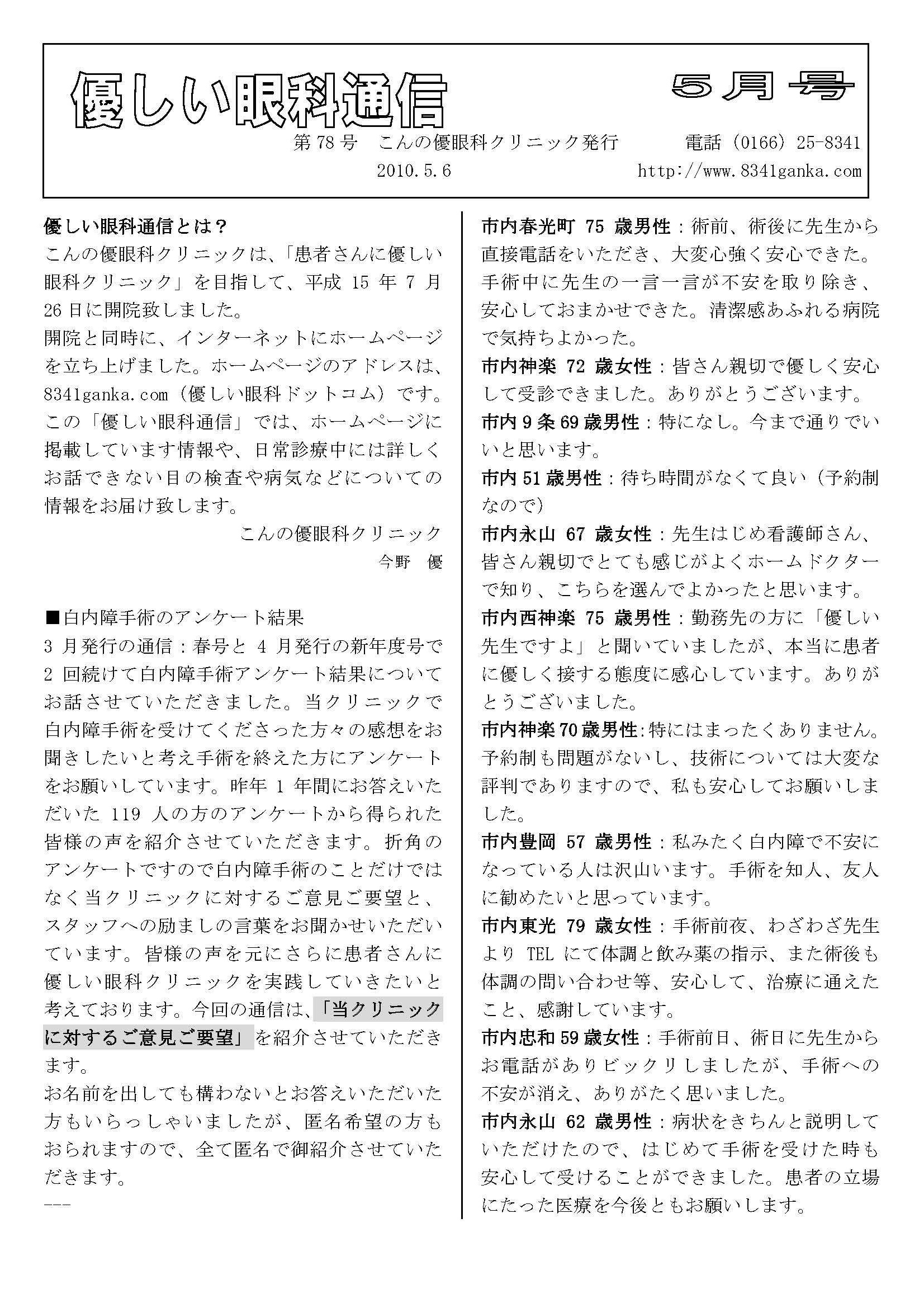 こんの優眼科クリニックは、「患者さんに優しい眼科クリニック」を目指して、平成15年7月26日に開院致しました。開院と同時に、インターネットにホームページを立ち上げました。ホームページのアドレスは8341ganka.com(優しい眼科ドットコム)です。この「優しい眼科通信」では、ホームページに掲載しています情報や、日常診療中には詳しくお話できない目の検査や目の病気などについての情報を、お届けいたします。