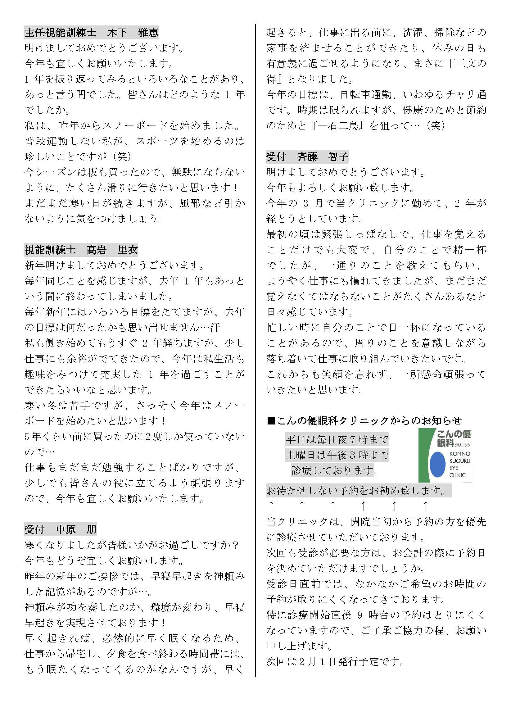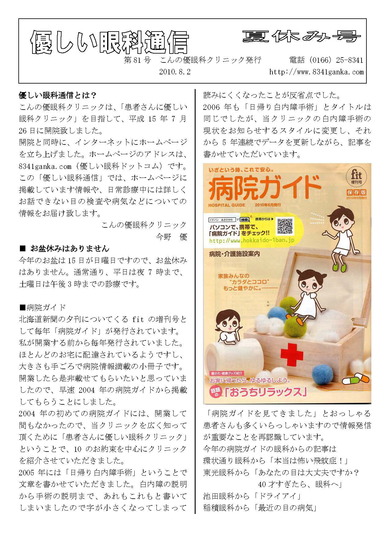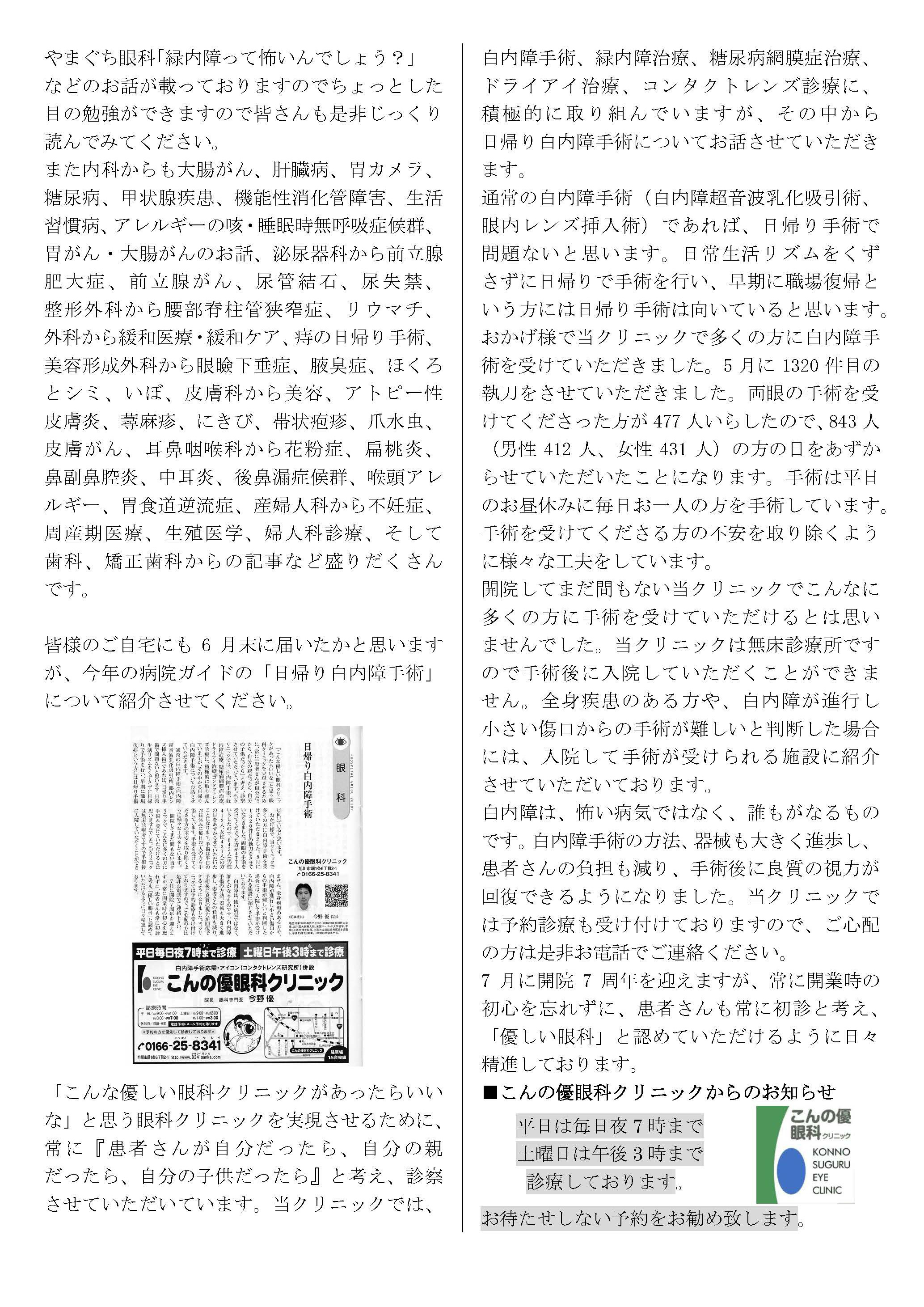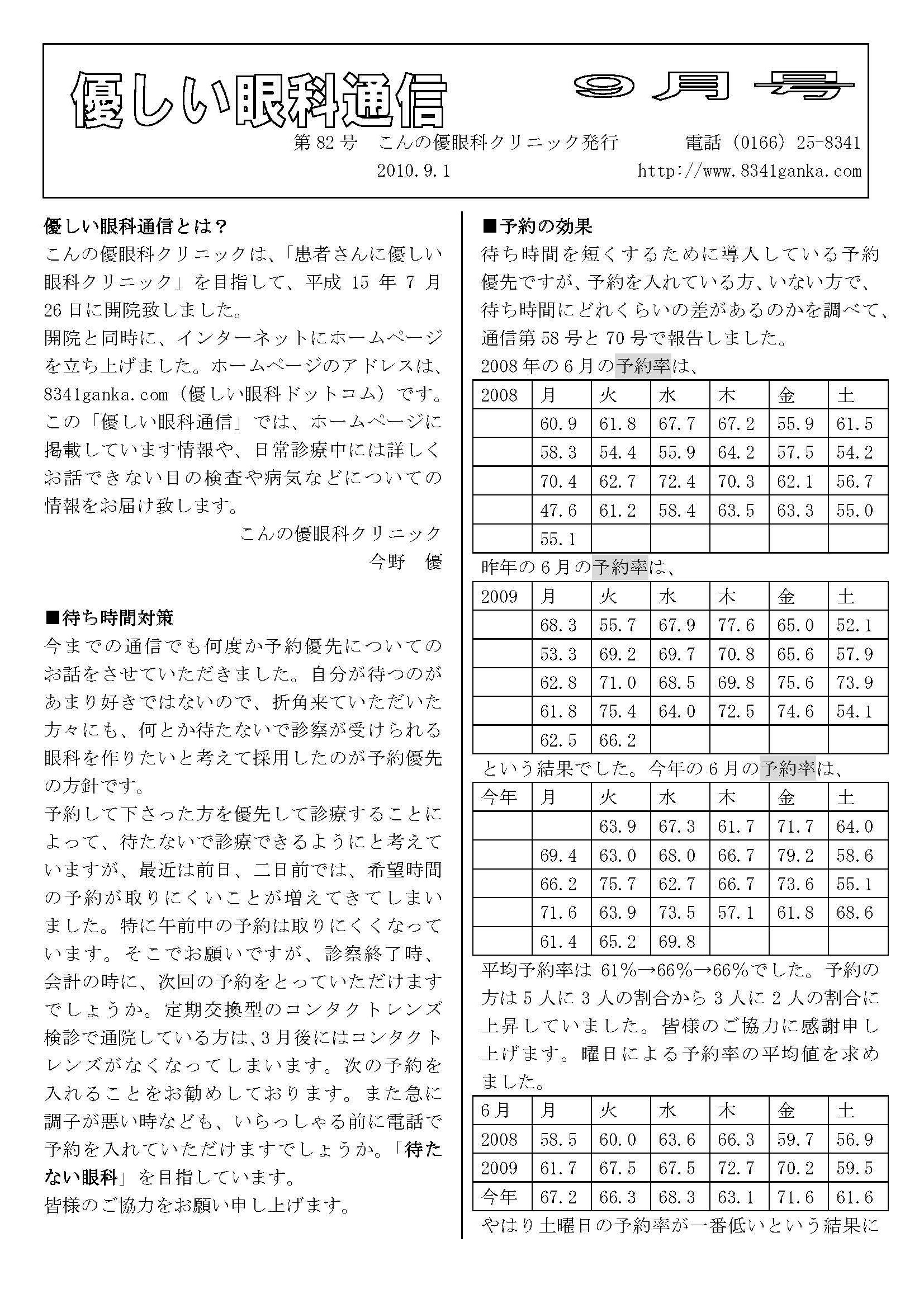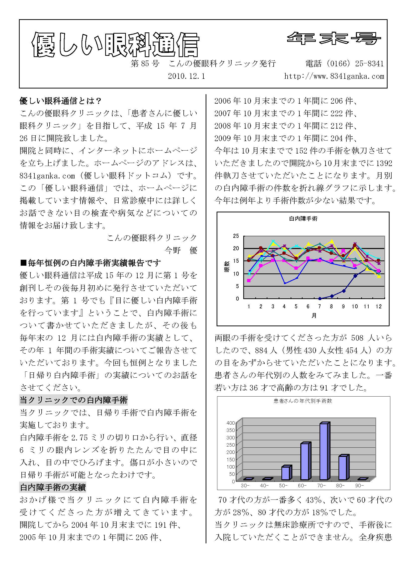 こんの優眼科クリニックは、「患者さんに優しい眼科クリニック」を目指して、平成15年7月26日に開院致しました。開院と同時に、インターネットにホームページを立ち上げました。ホームページのアドレスは8341ganka.com(優しい眼科ドットコム)です。この「優しい眼科通信」では、ホームページに掲載しています情報や、日常診療中には詳しくお話できない目の検査や目の病気などについての情報を、お届けいたします。
