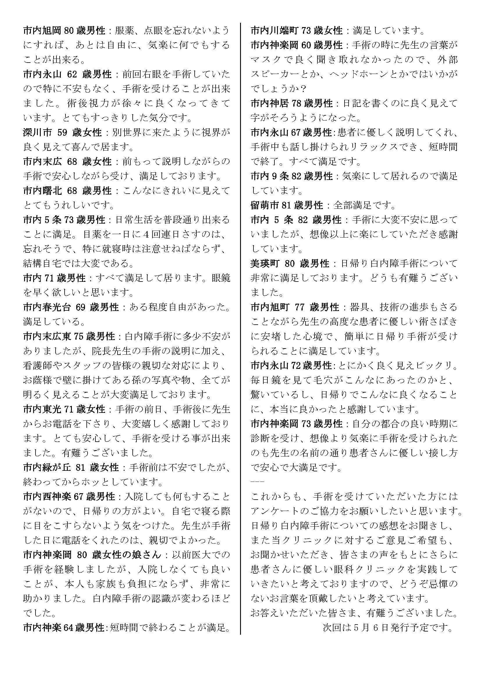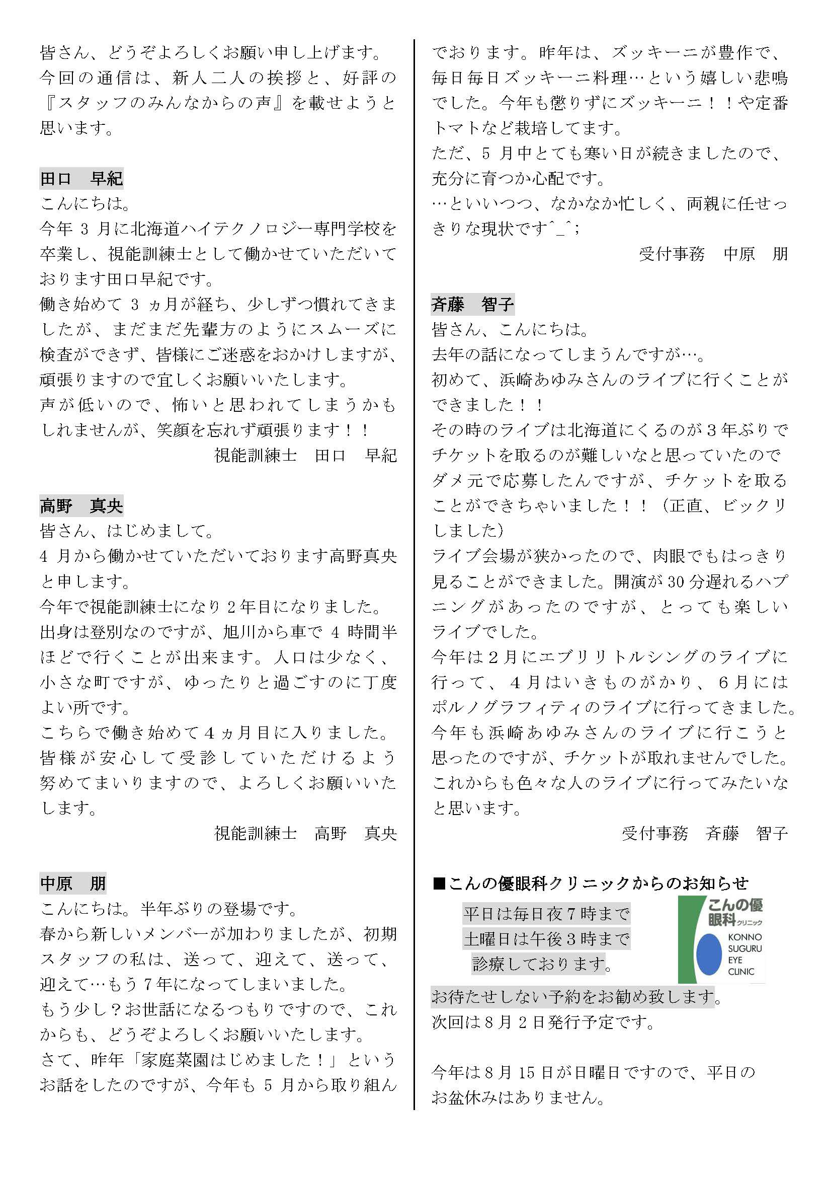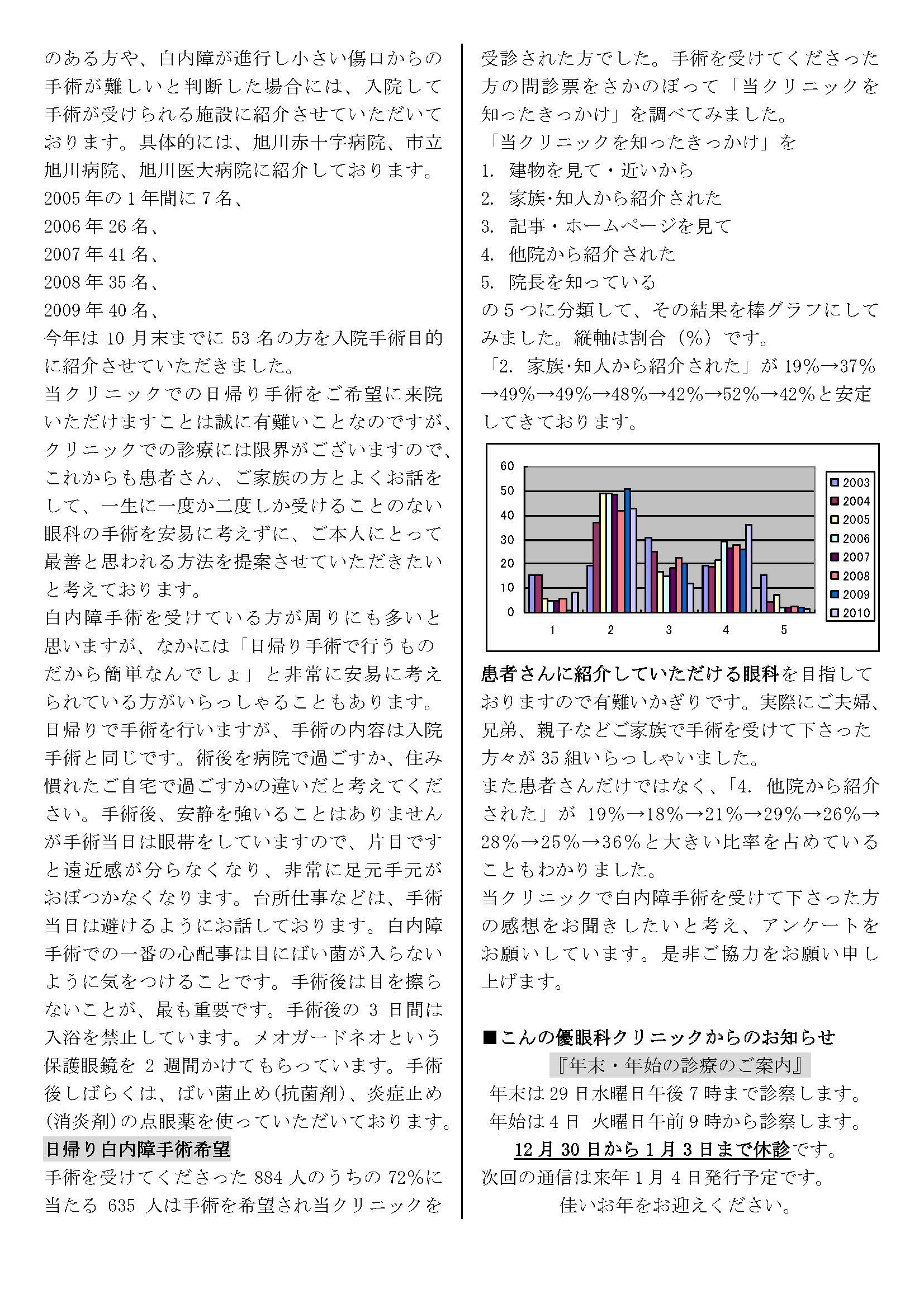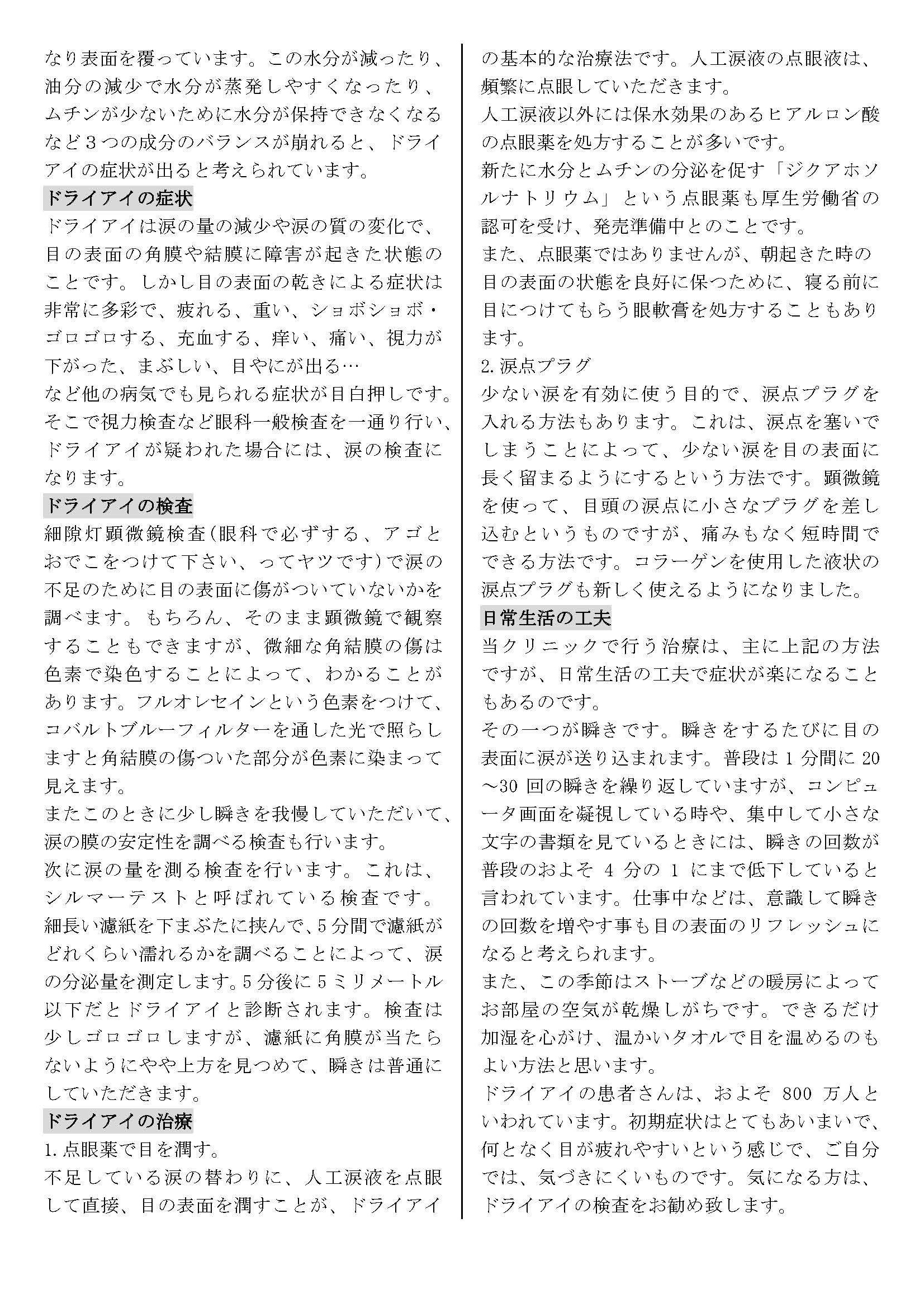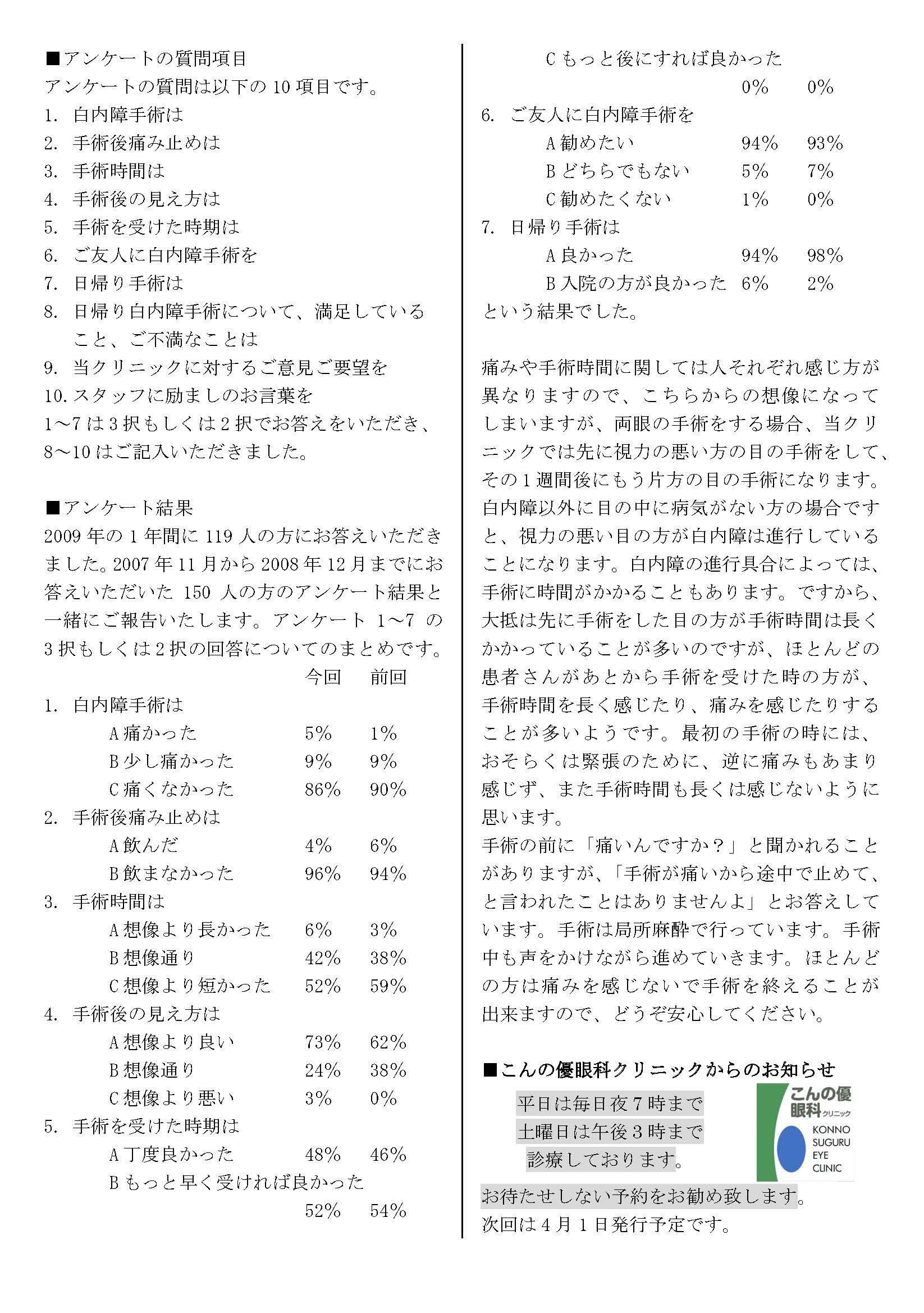 こんの優眼科クリニックは、「患者さんに優しい眼科クリニック」を目指して、平成15年7月26日に開院致しました。開院と同時に、インターネットにホームページを立ち上げました。ホームページのアドレスは8341ganka.com(優しい眼科ドットコム)です。この「優しい眼科通信」では、ホームページに掲載しています情報や、日常診療中には詳しくお話できない目の検査や目の病気などについての情報を、お届けいたします。