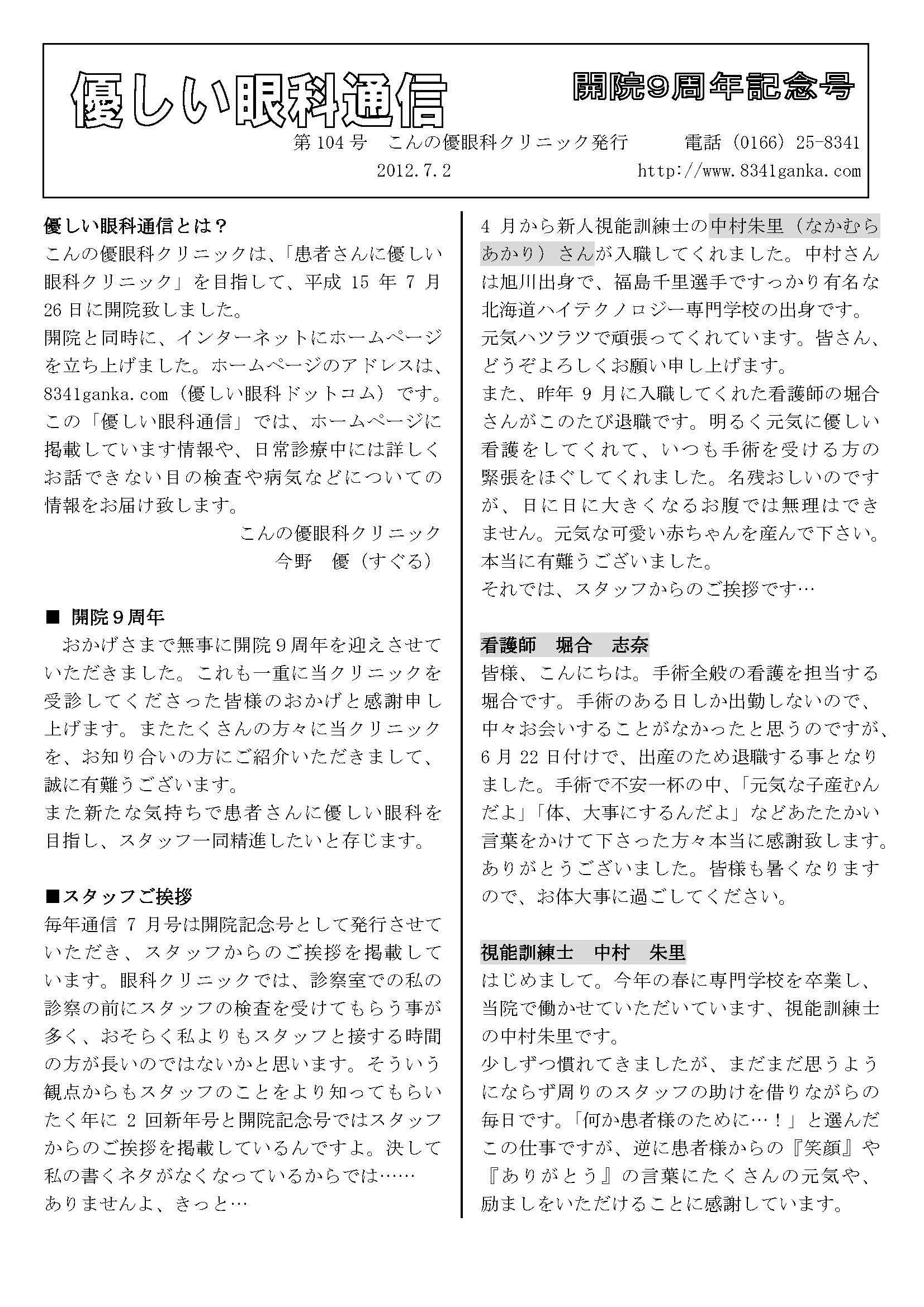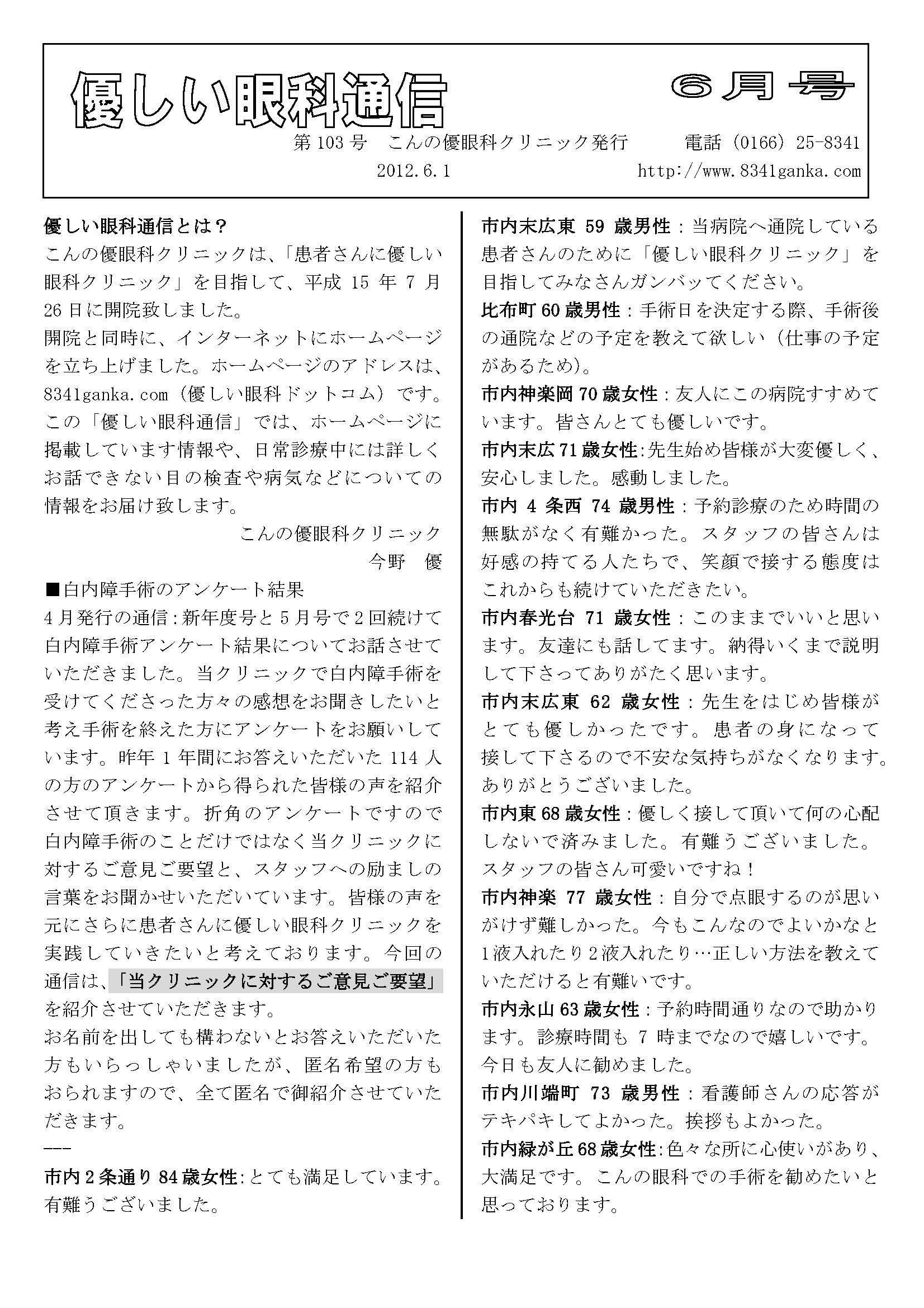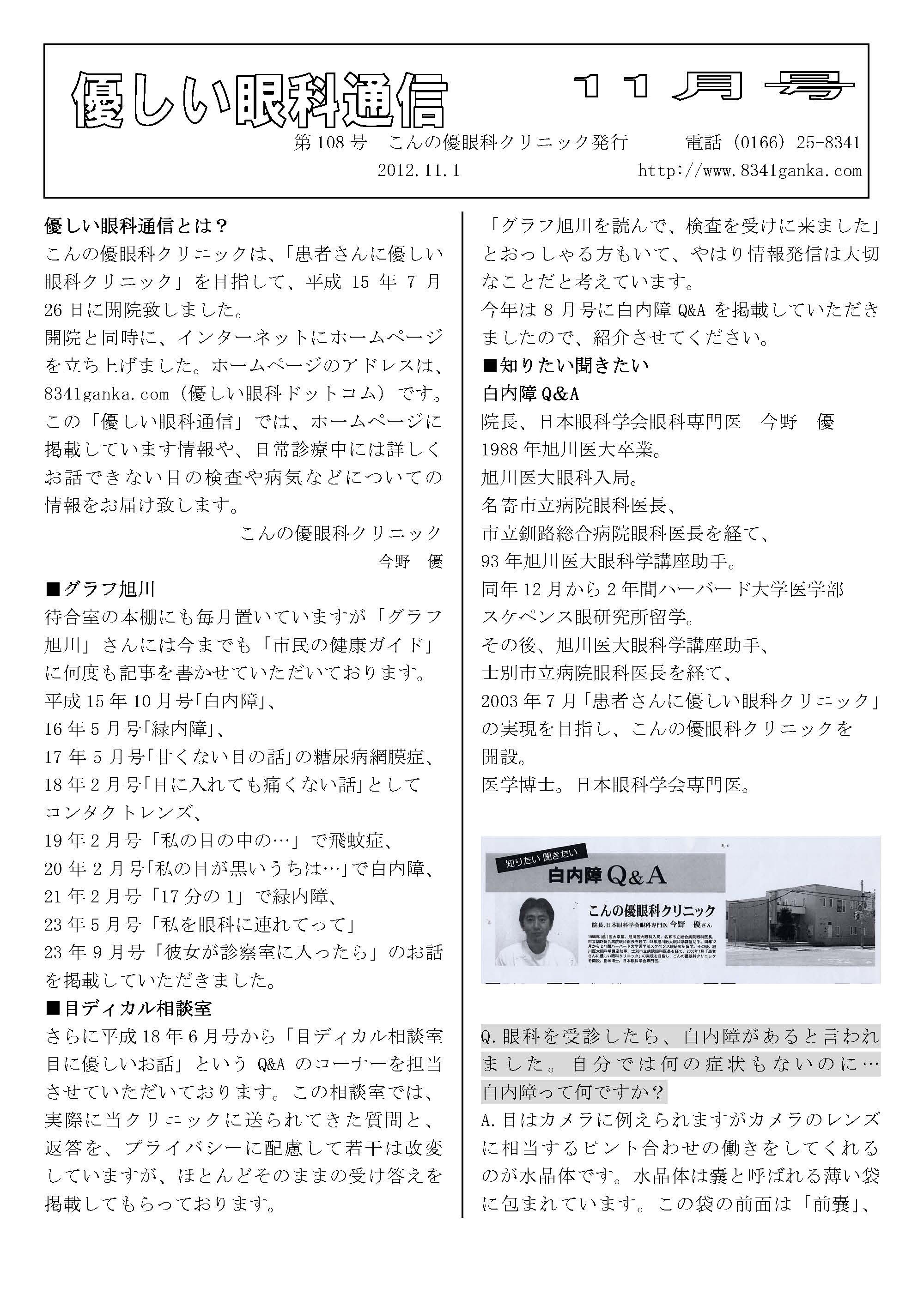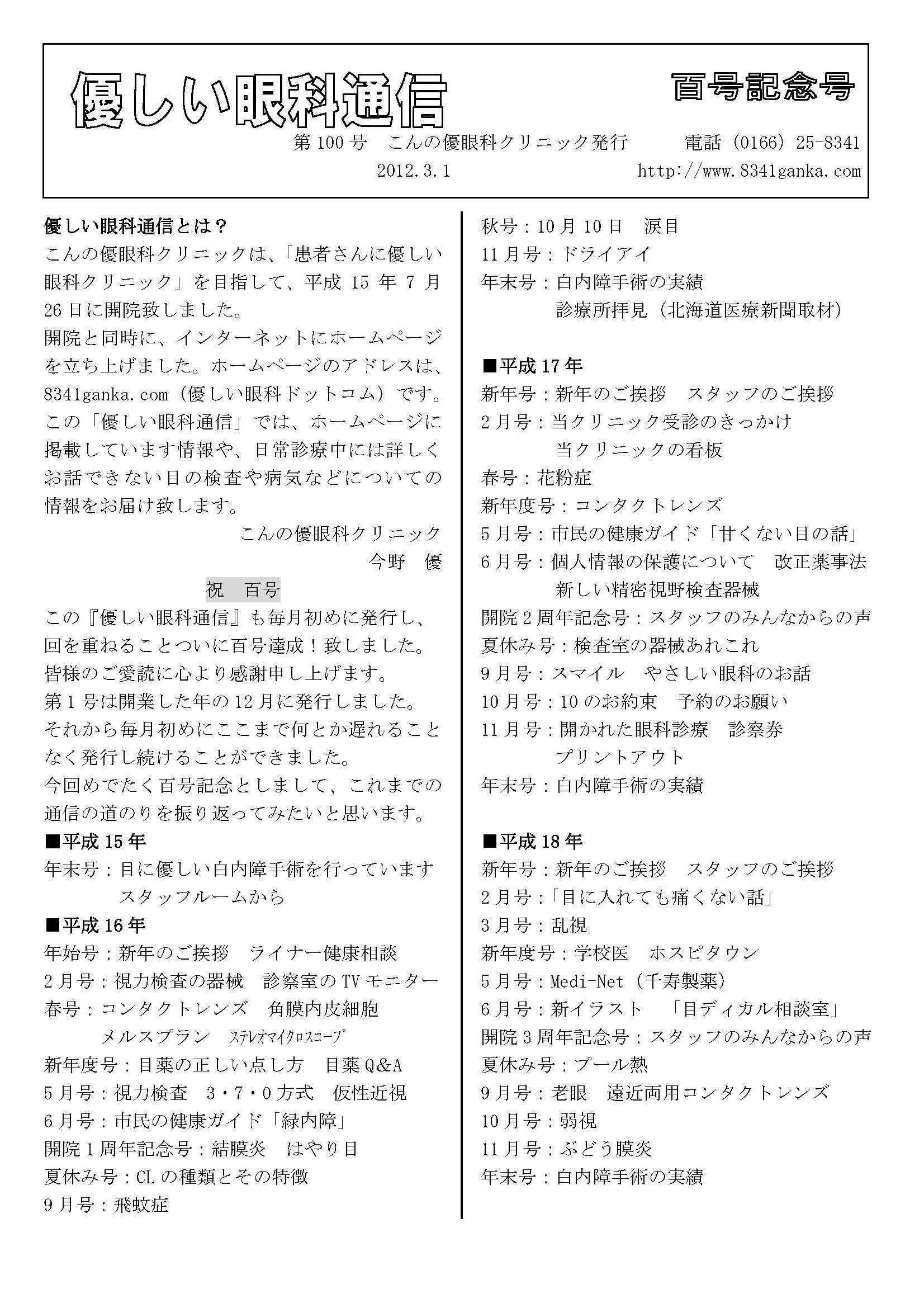 こんの優眼科クリニックは、「患者さんに優しい眼科クリニック」を目指して、平成15年7月26日に開院致しました。開院と同時に、インターネットにホームページを立ち上げました。ホームページのアドレスは8341ganka.com(優しい眼科ドットコム)です。この「優しい眼科通信」では、ホームページに掲載しています情報や、日常診療中には詳しくお話できない目の検査や目の病気などについての情報を、お届けいたします。
