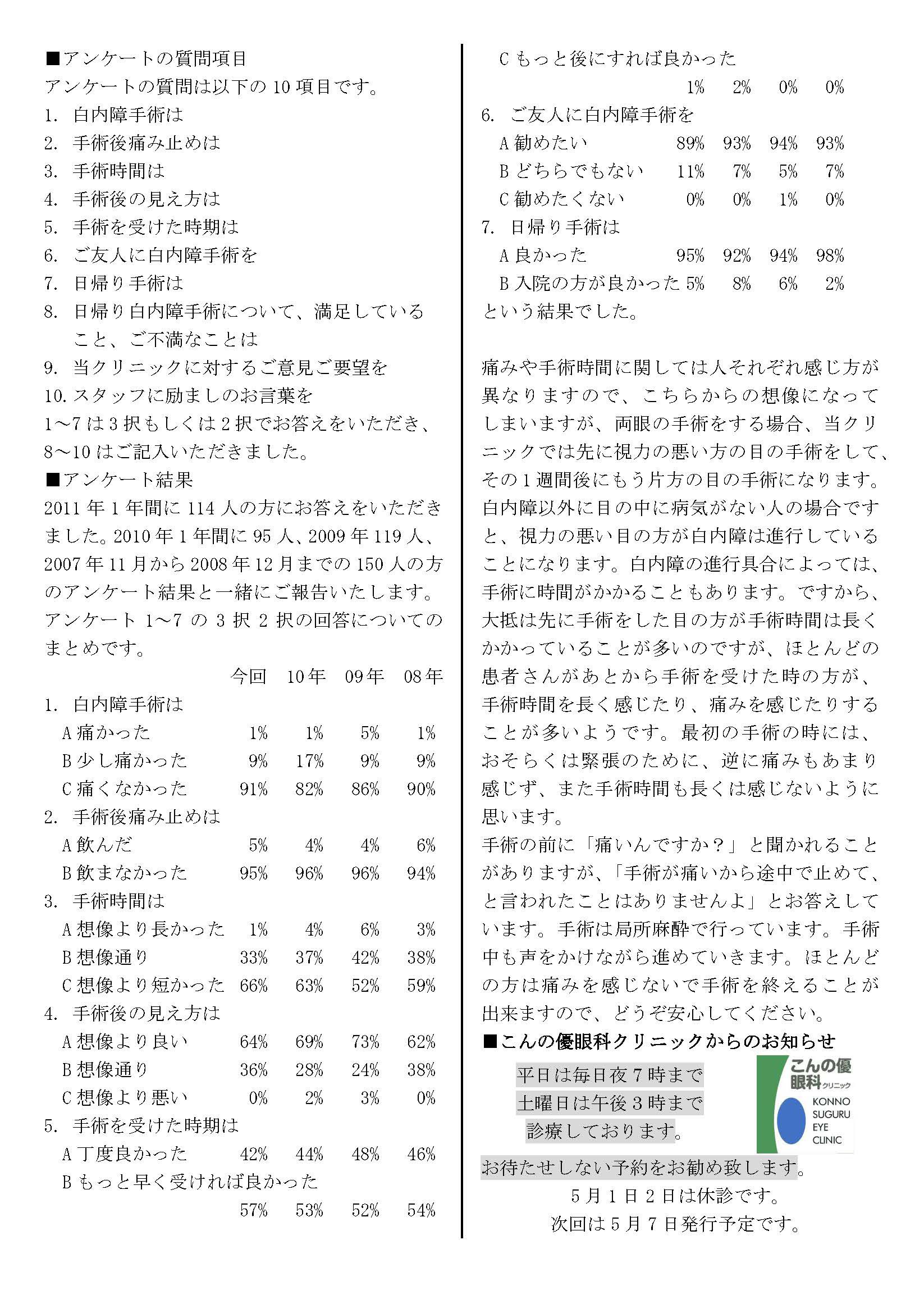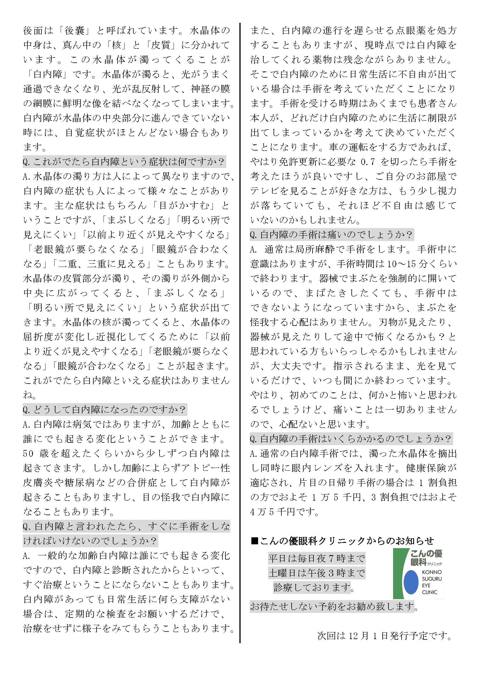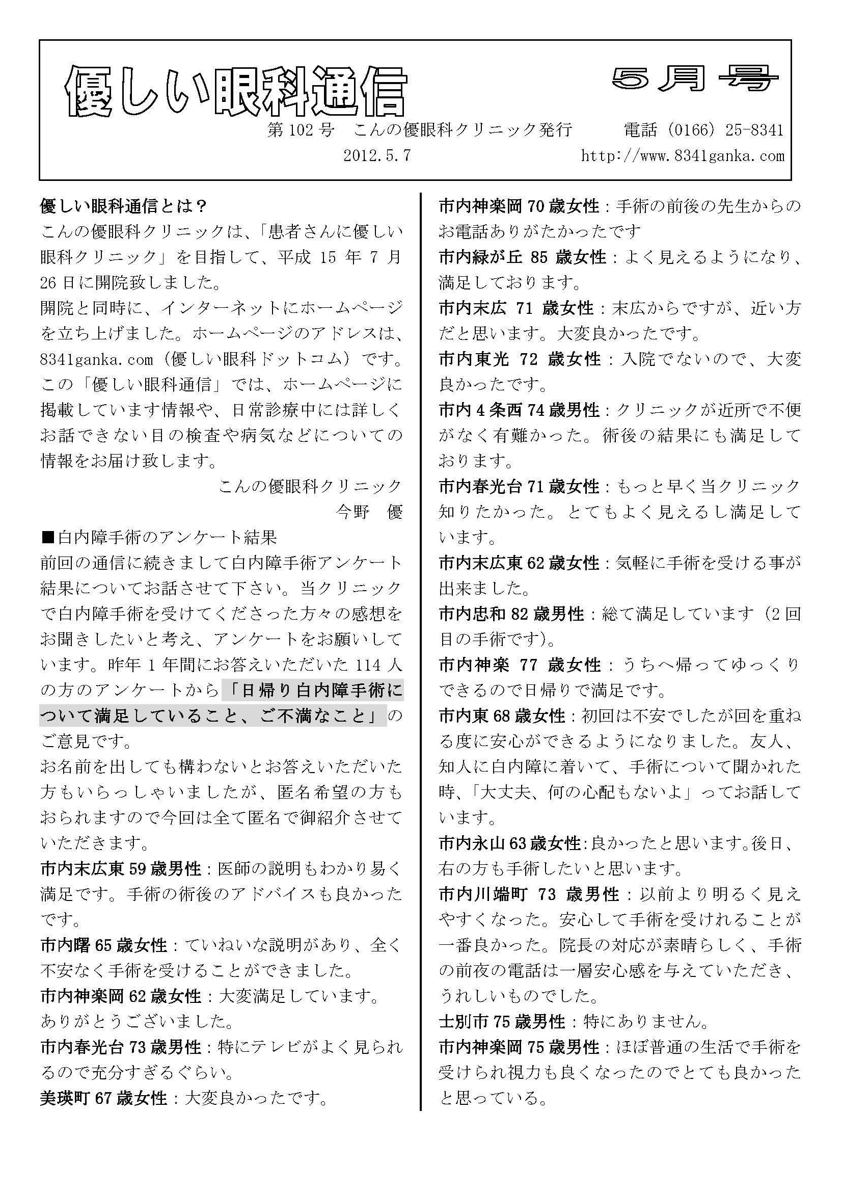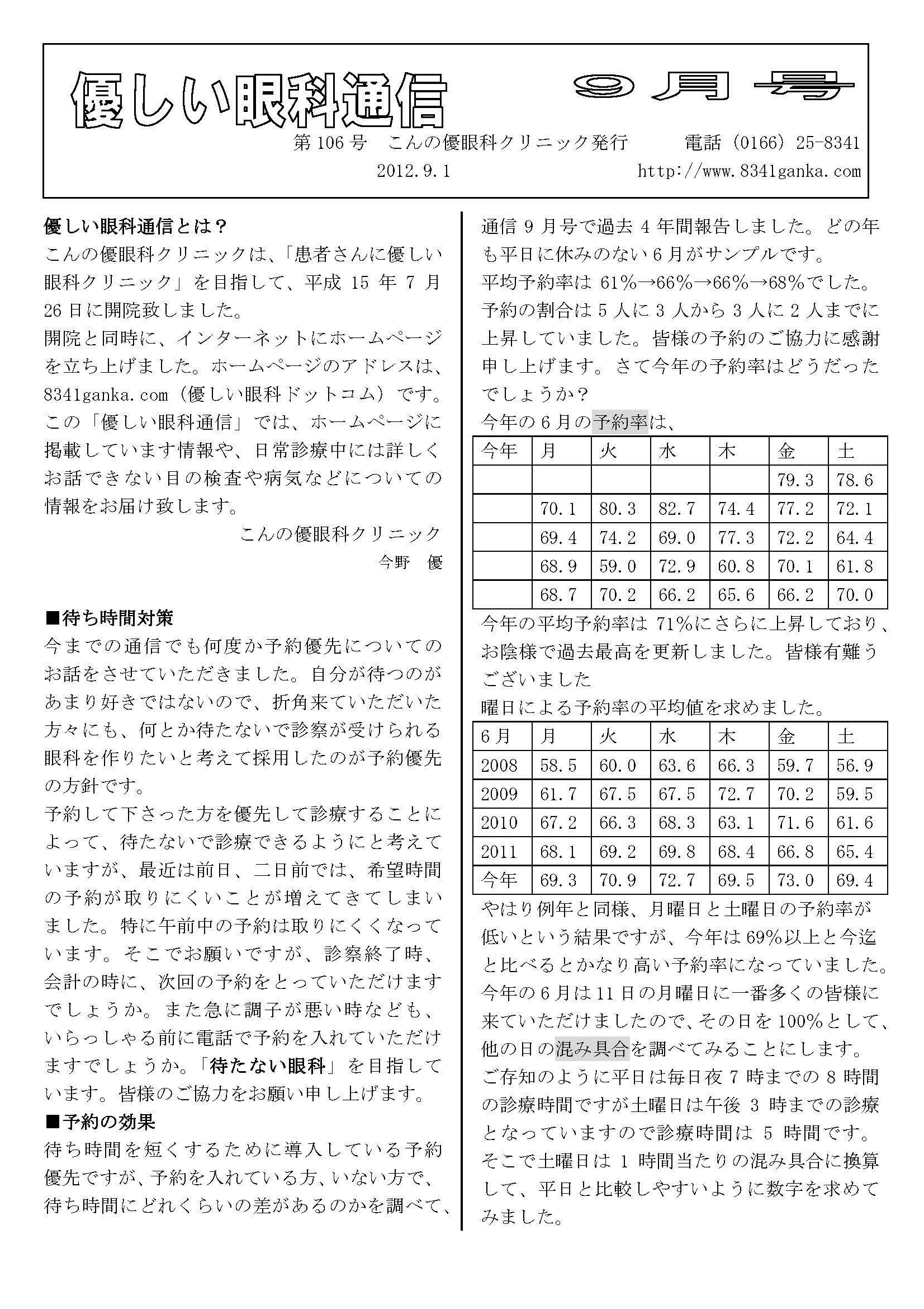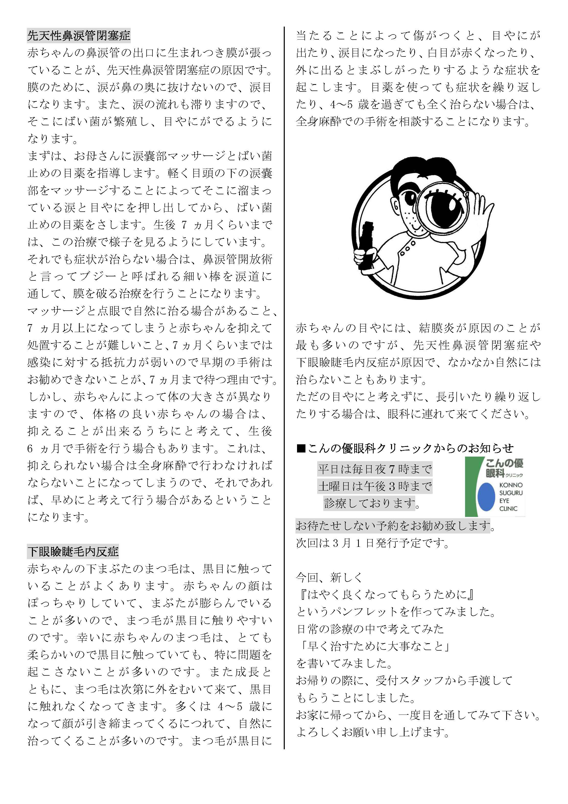 こんの優眼科クリニックは、「患者さんに優しい眼科クリニック」を目指して、平成15年7月26日に開院致しました。開院と同時に、インターネットにホームページを立ち上げました。ホームページのアドレスは8341ganka.com(優しい眼科ドットコム)です。この「優しい眼科通信」では、ホームページに掲載しています情報や、日常診療中には詳しくお話できない目の検査や目の病気などについての情報を、お届けいたします。