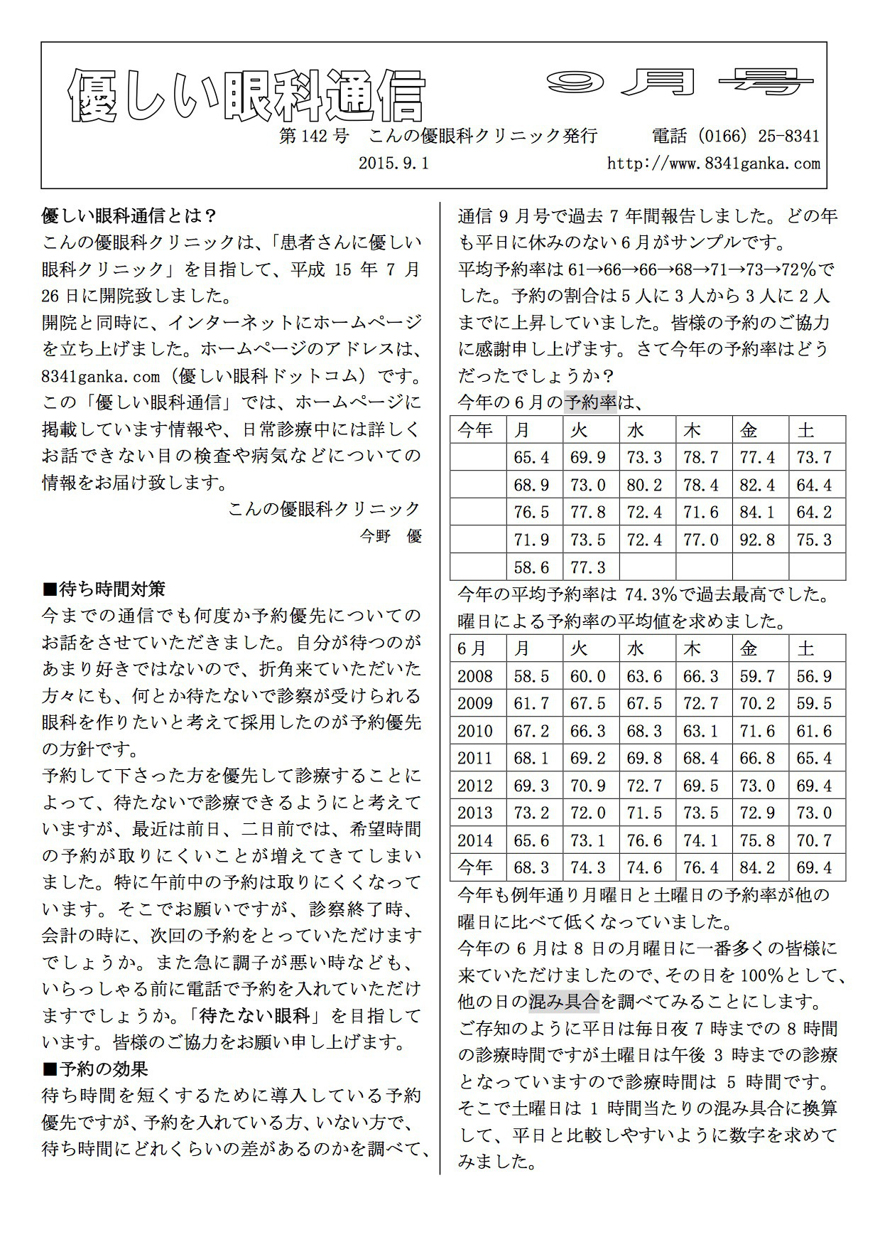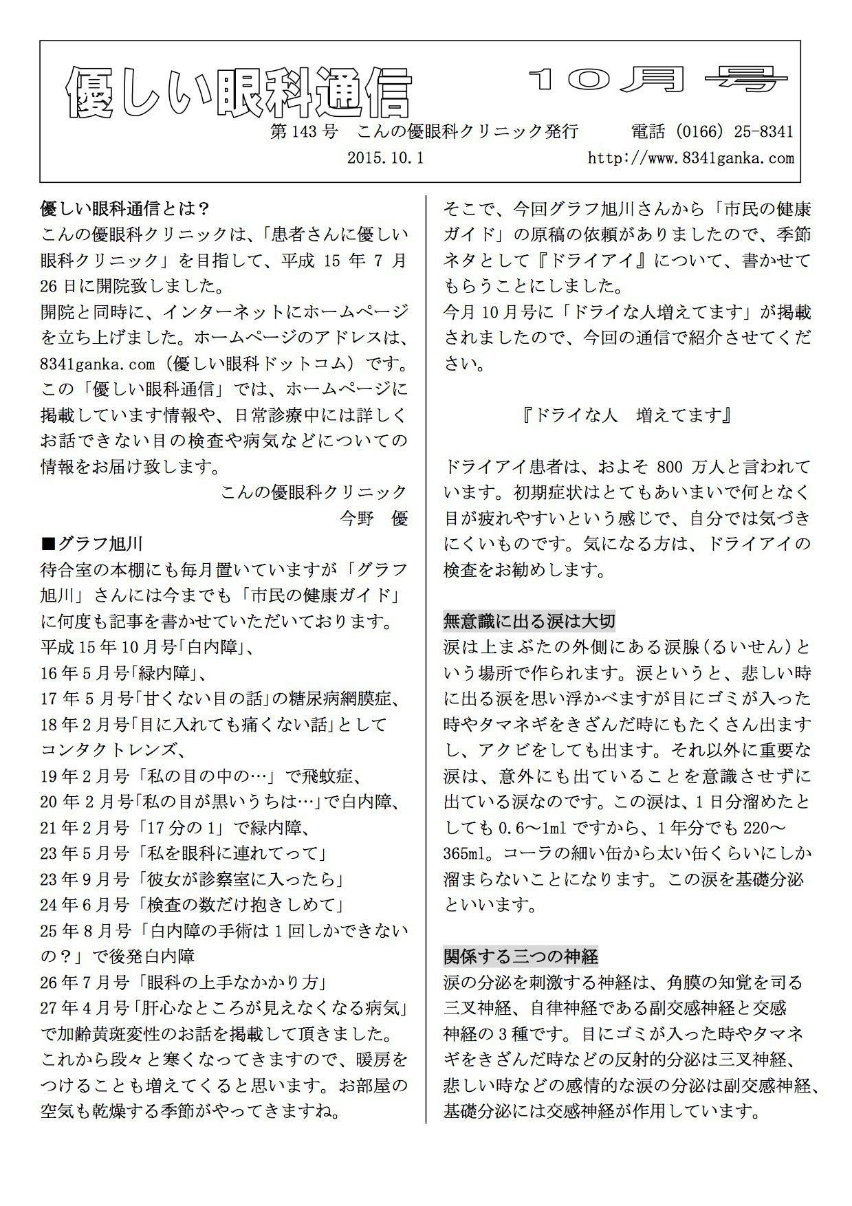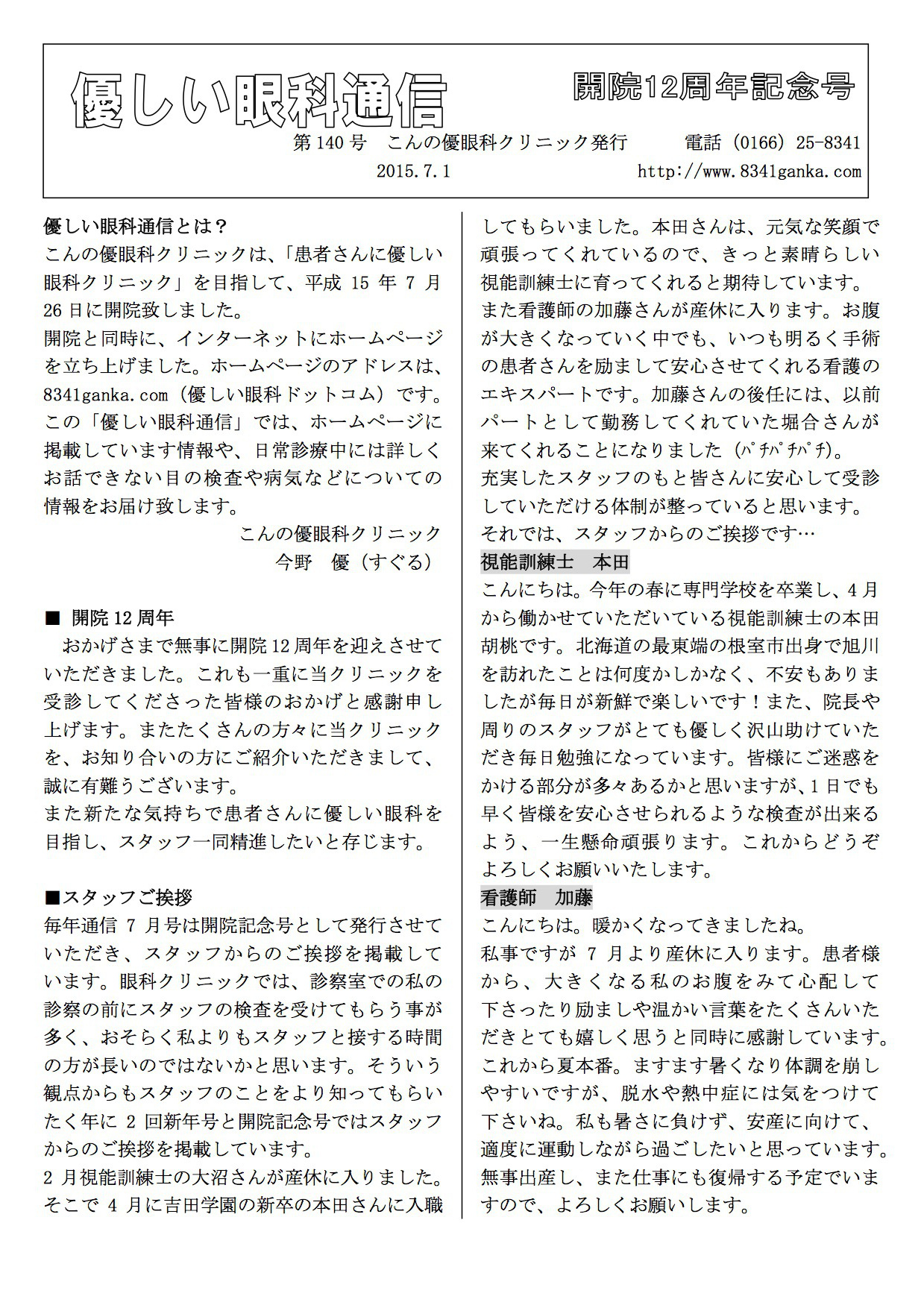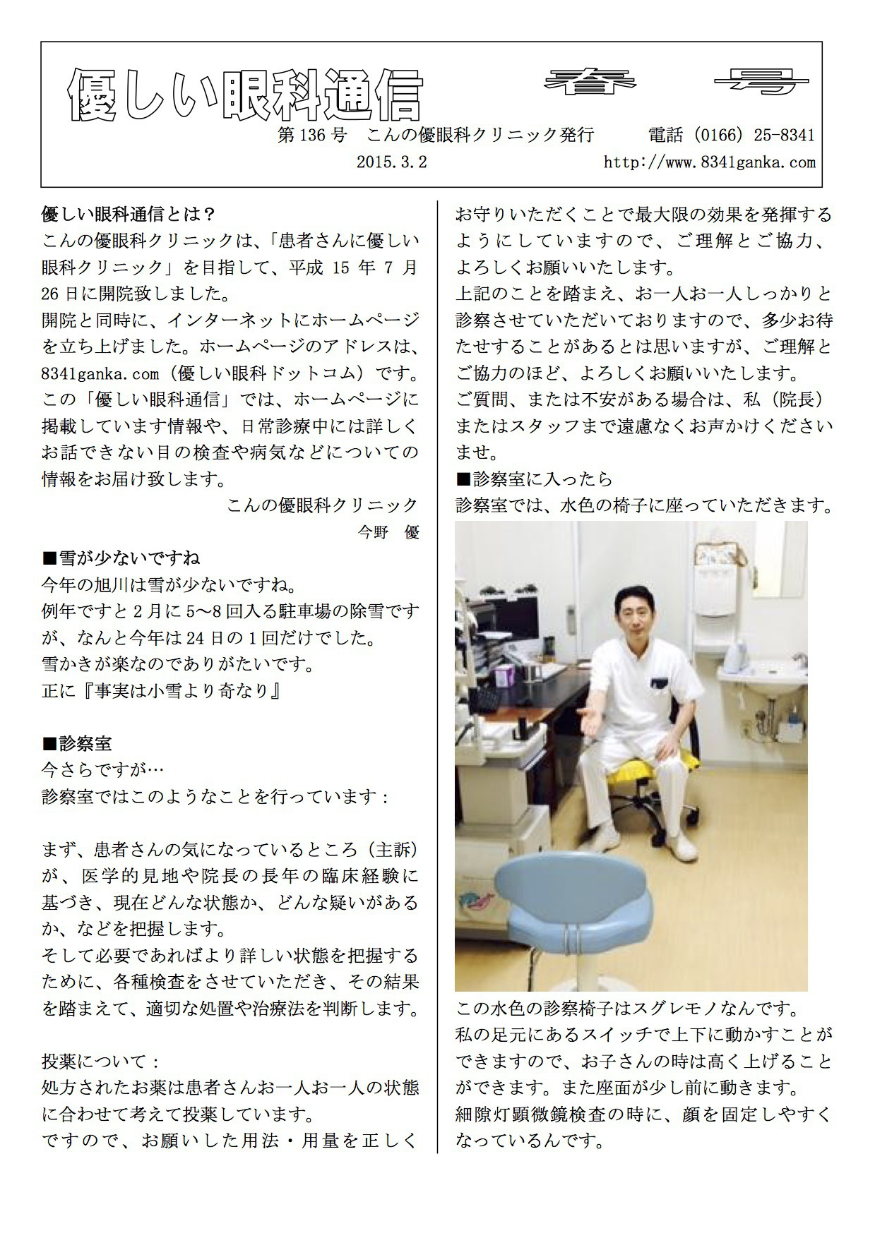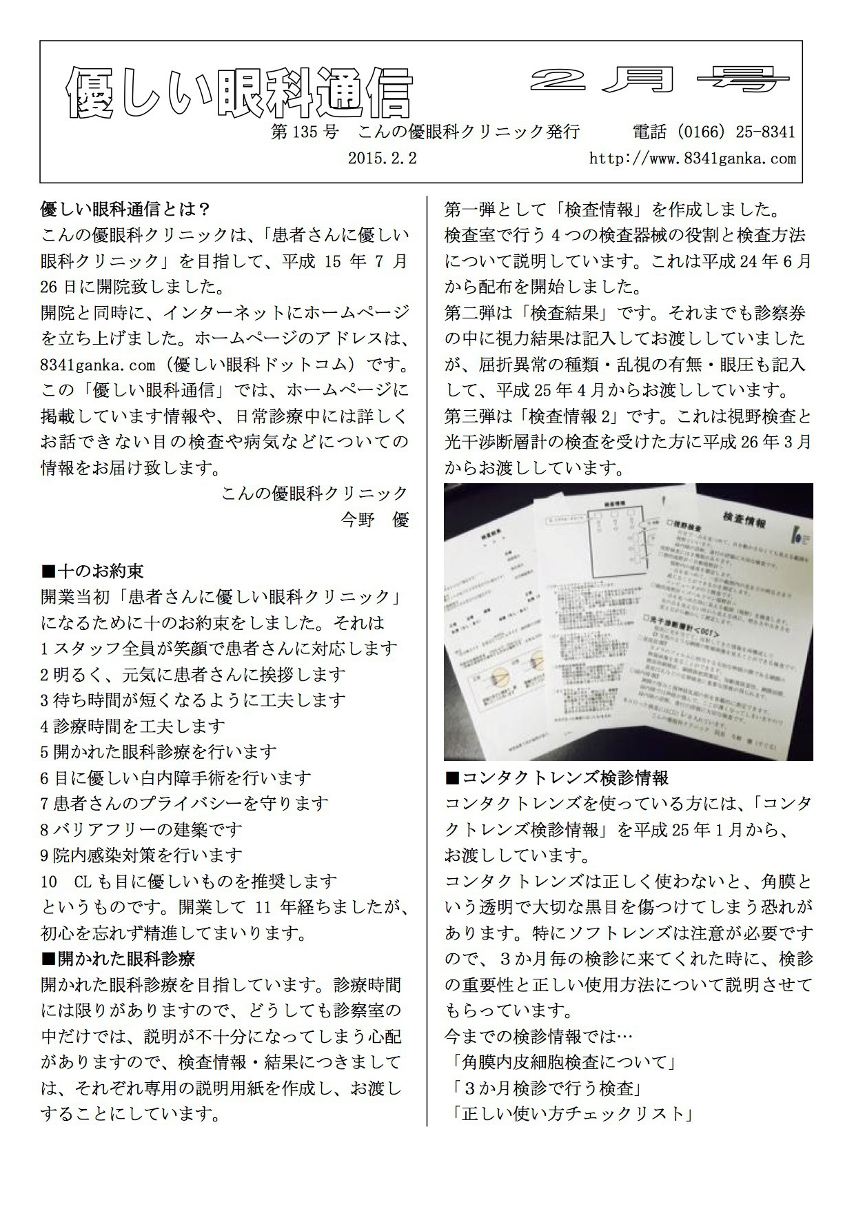 こんの優眼科クリニックは、「患者さんに優しい眼科クリニック」を目指して、平成15年7月26日に開院致しました。開院と同時に、インターネットにホームページを立ち上げました。ホームページのアドレスは8341ganka.com(優しい眼科ドットコム)です。この「優しい眼科通信」では、ホームページに掲載しています情報や、日常診療中には詳しくお話できない目の検査や目の病気などについての情報を、お届けいたします。
