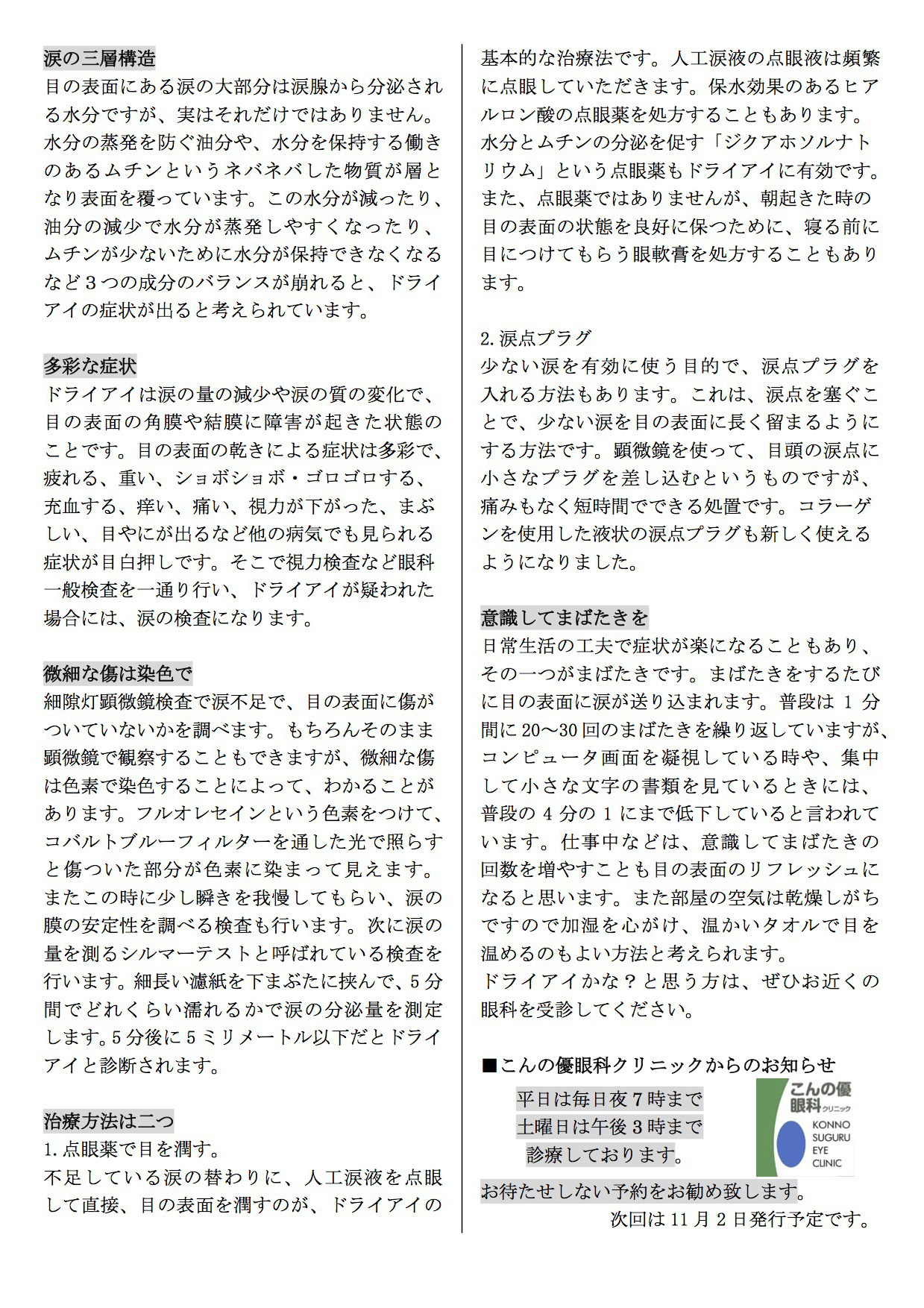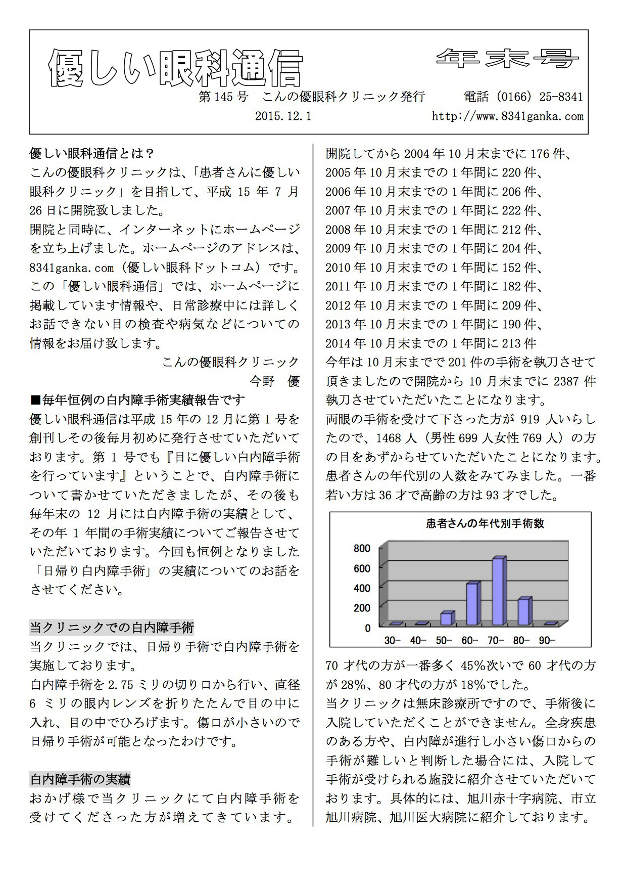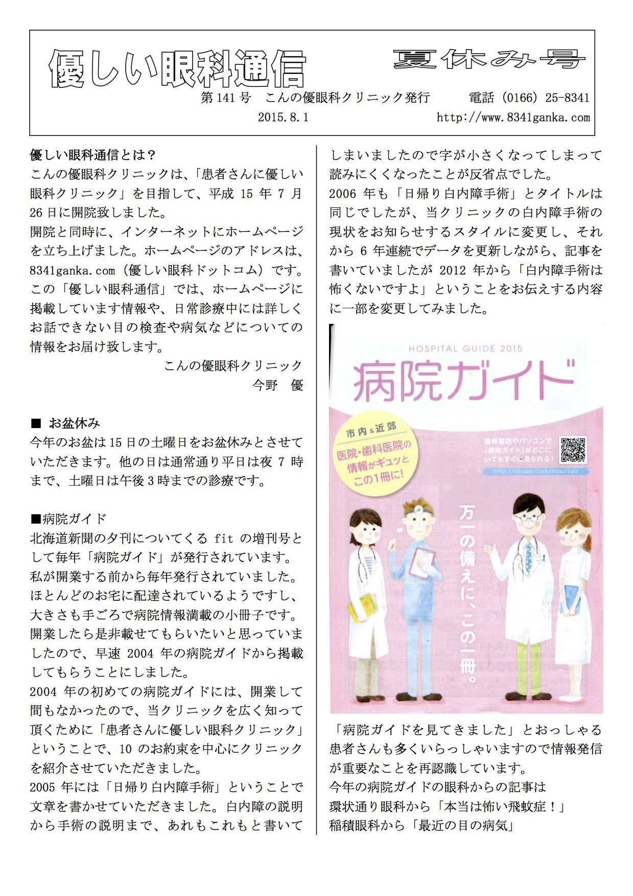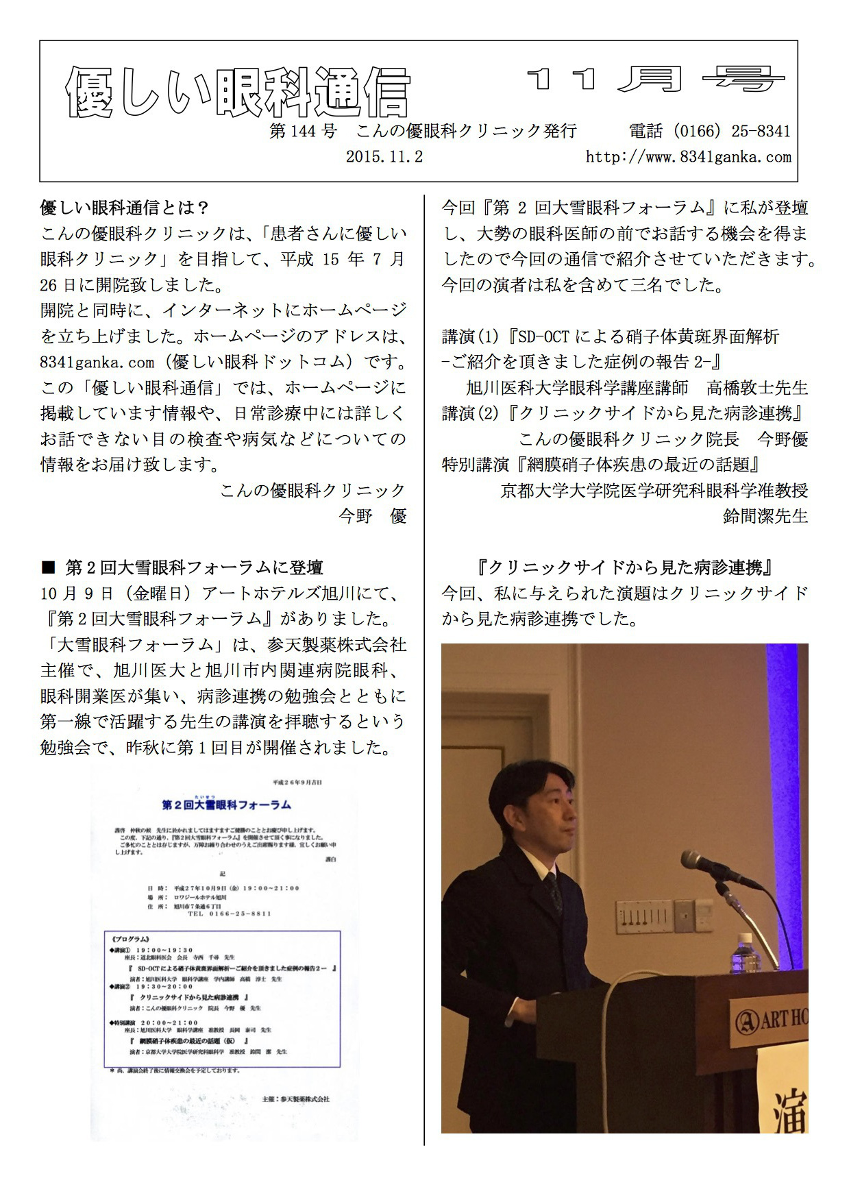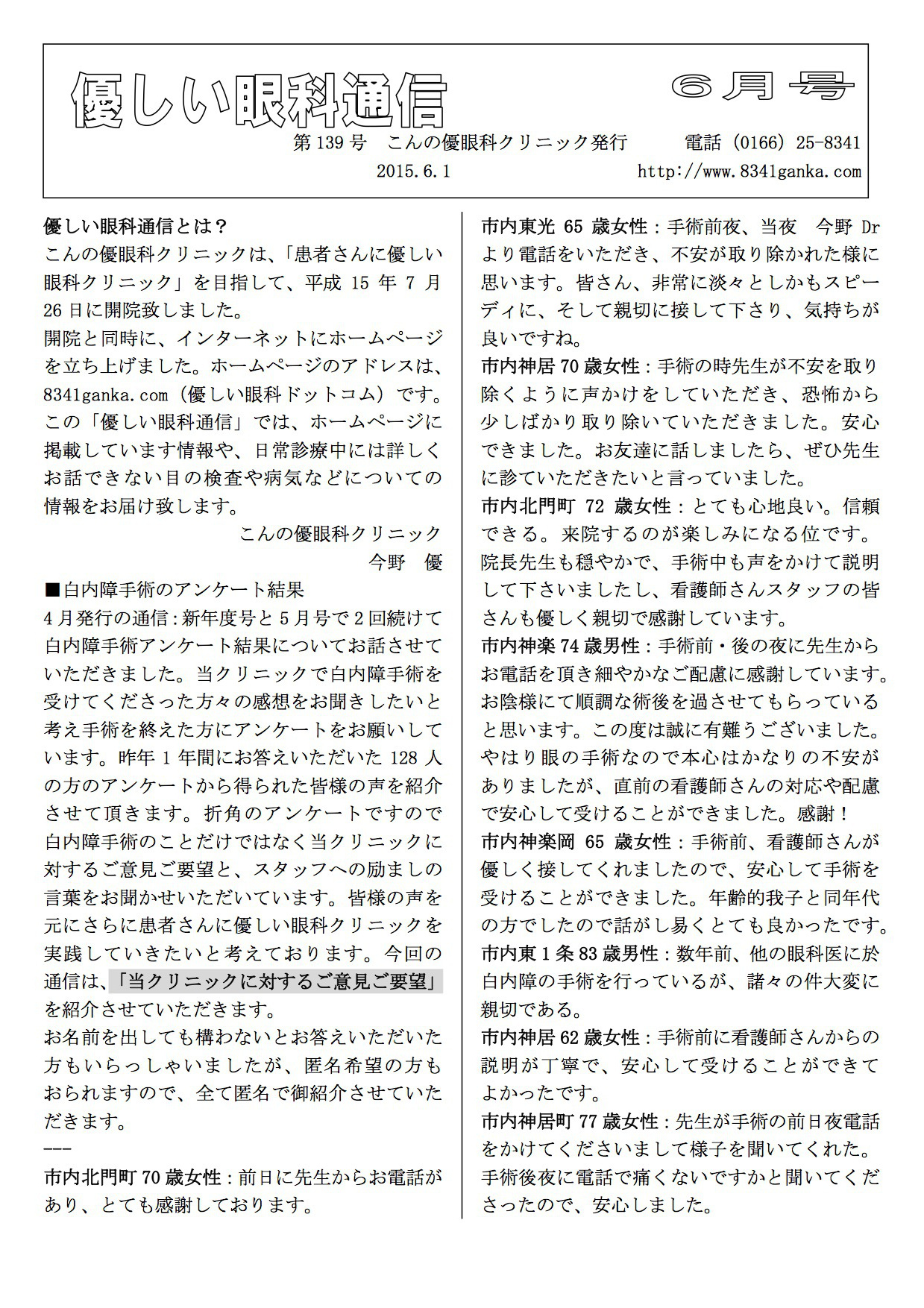 こんの優眼科クリニックは、「患者さんに優しい眼科クリニック」を目指して、平成15年7月26日に開院致しました。開院と同時に、インターネットにホームページを立ち上げました。ホームページのアドレスは8341ganka.com(優しい眼科ドットコム)です。この「優しい眼科通信」では、ホームページに掲載しています情報や、日常診療中には詳しくお話できない目の検査や目の病気などについての情報を、お届けいたします。
