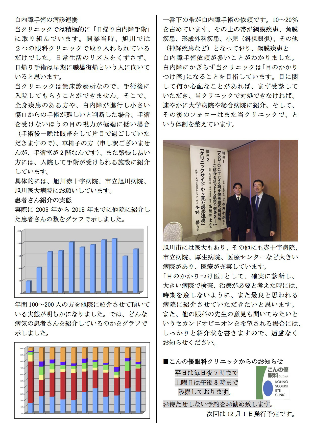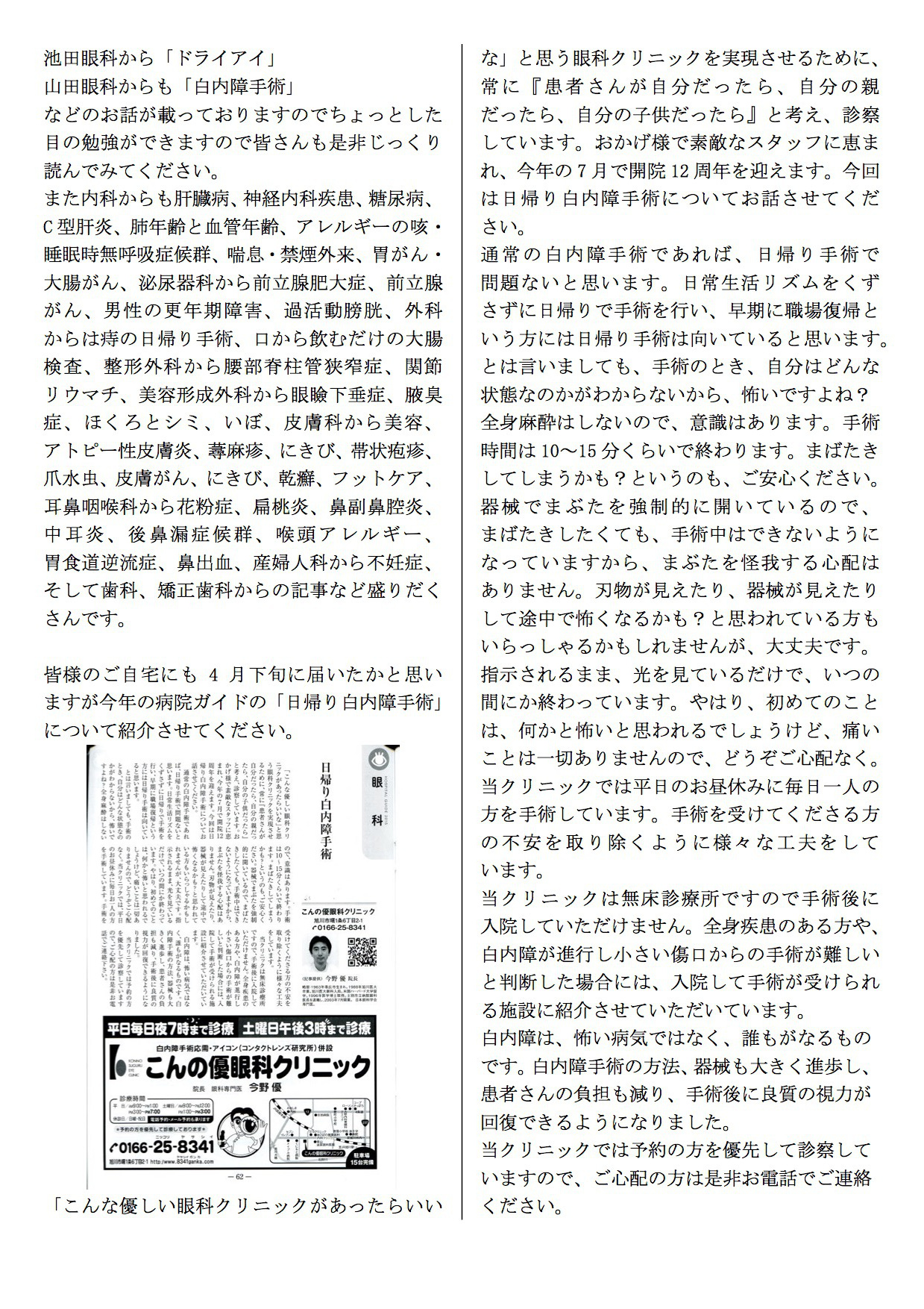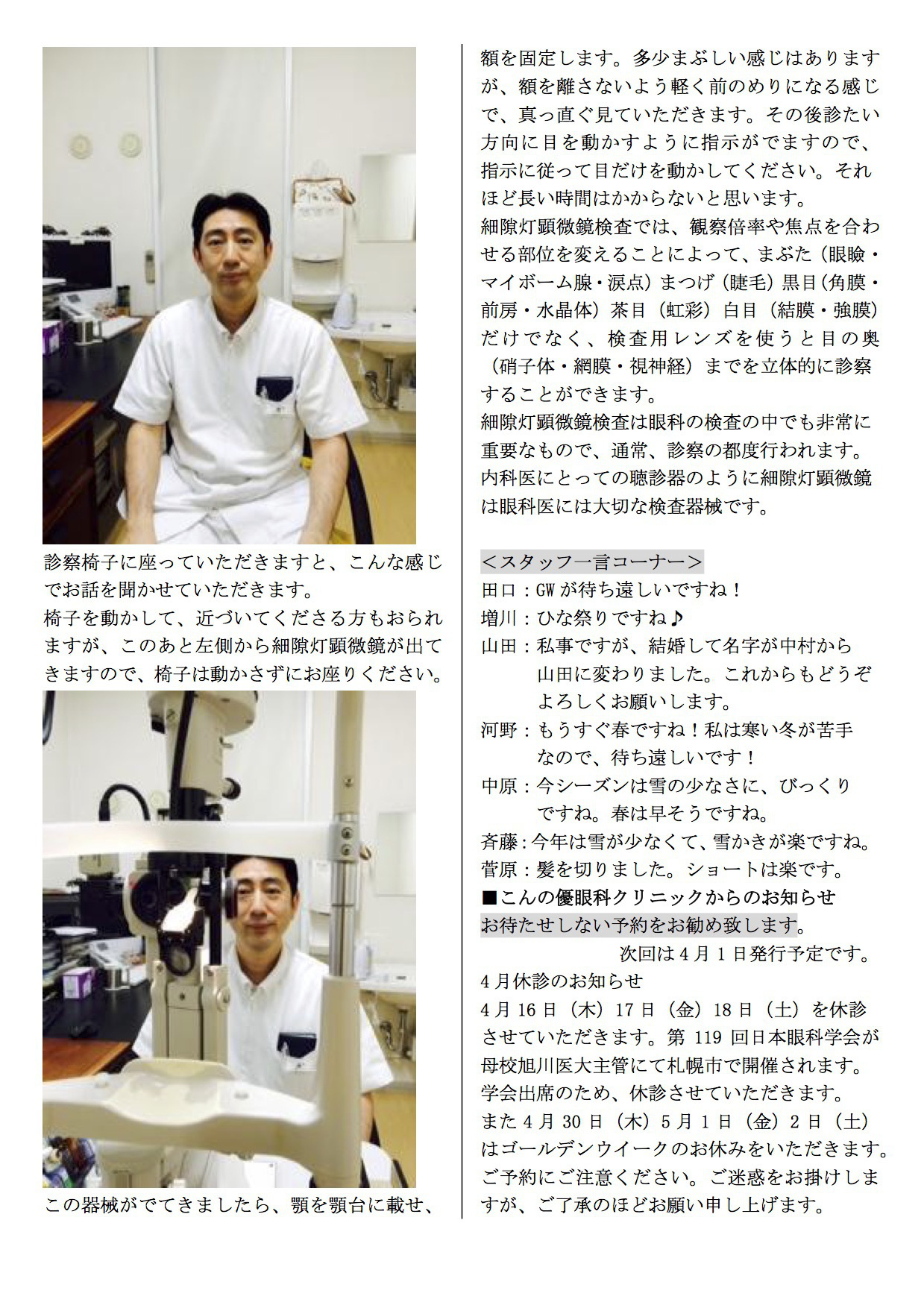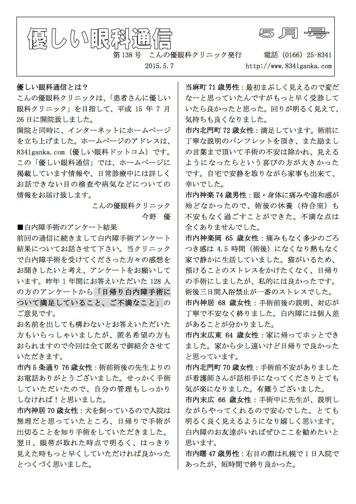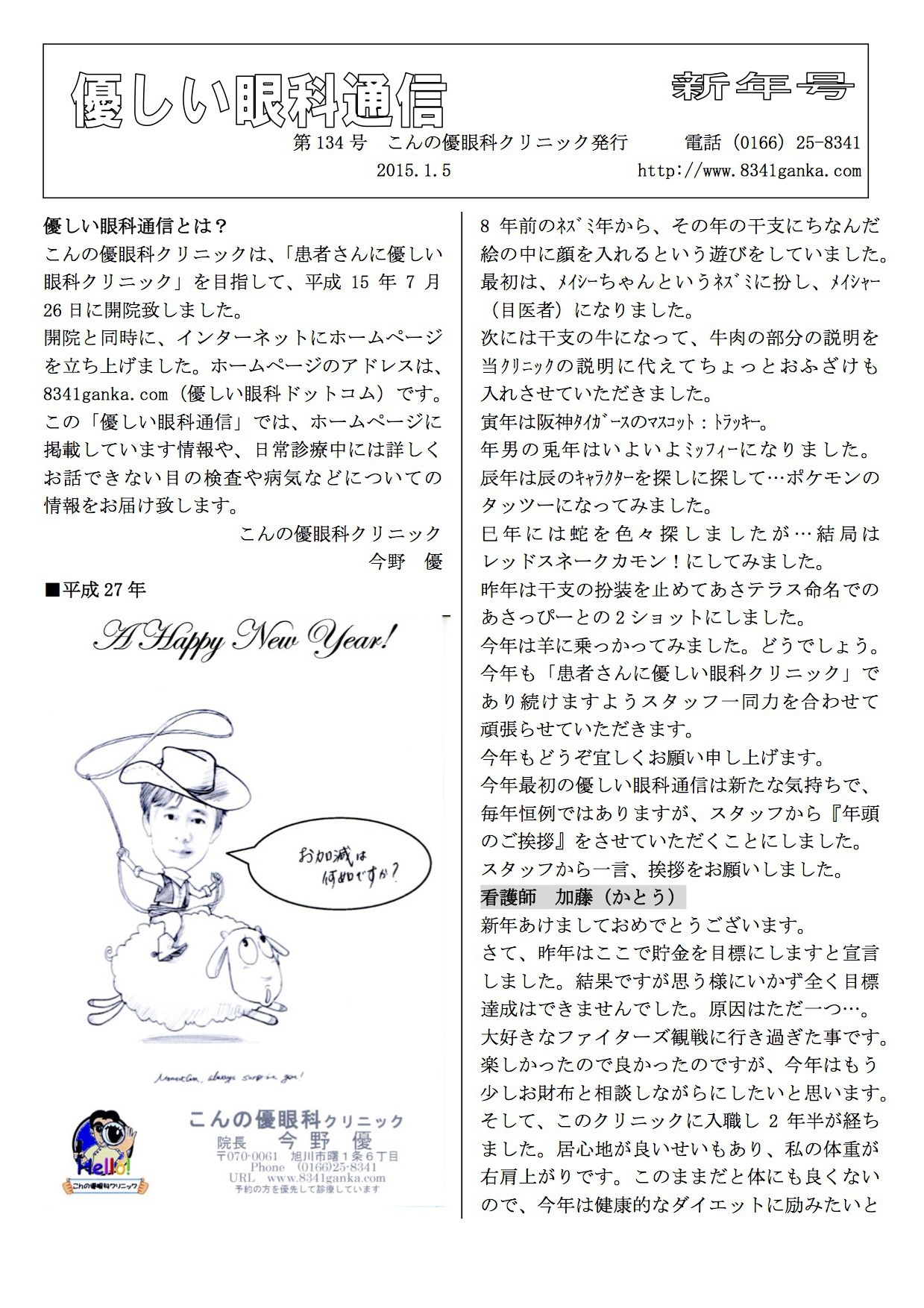 こんの優眼科クリニックは、「患者さんに優しい眼科クリニック」を目指して、平成15年7月26日に開院致しました。開院と同時に、インターネットにホームページを立ち上げました。ホームページのアドレスは8341ganka.com(優しい眼科ドットコム)です。この「優しい眼科通信」では、ホームページに掲載しています情報や、日常診療中には詳しくお話できない目の検査や目の病気などについての情報を、お届けいたします。