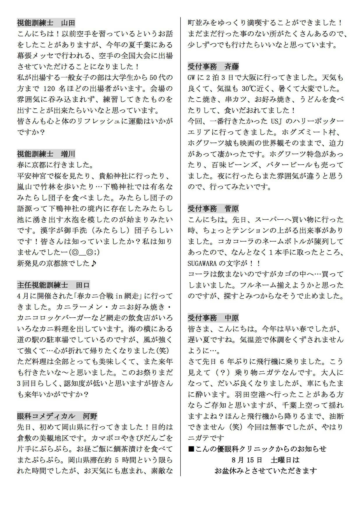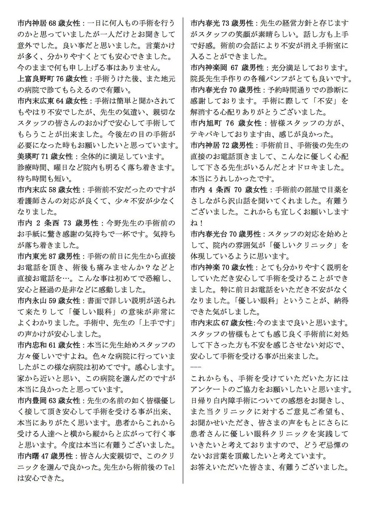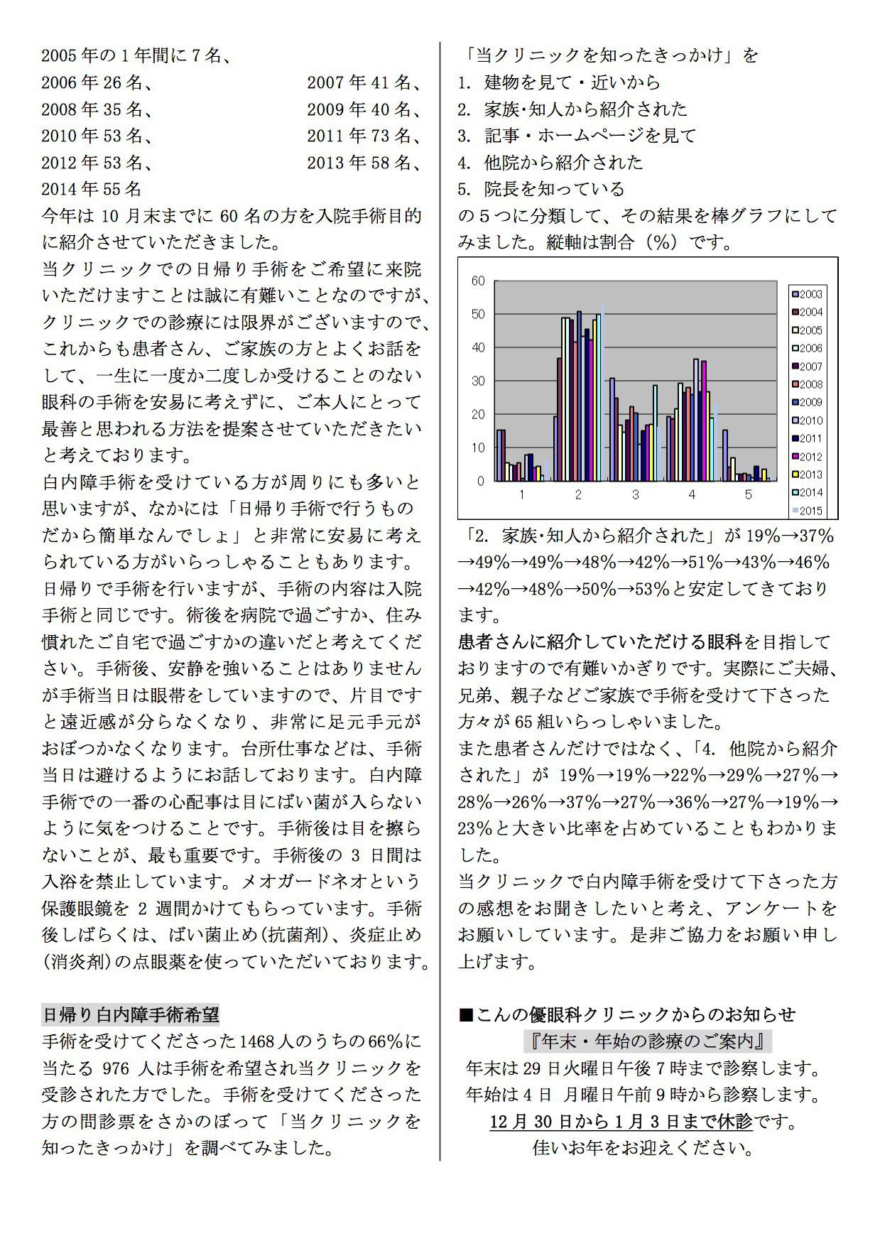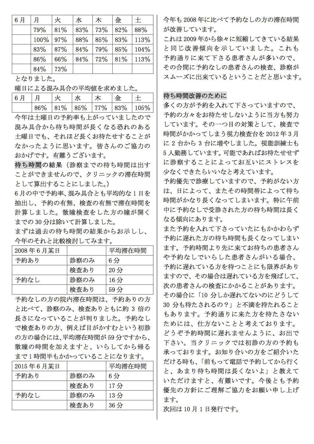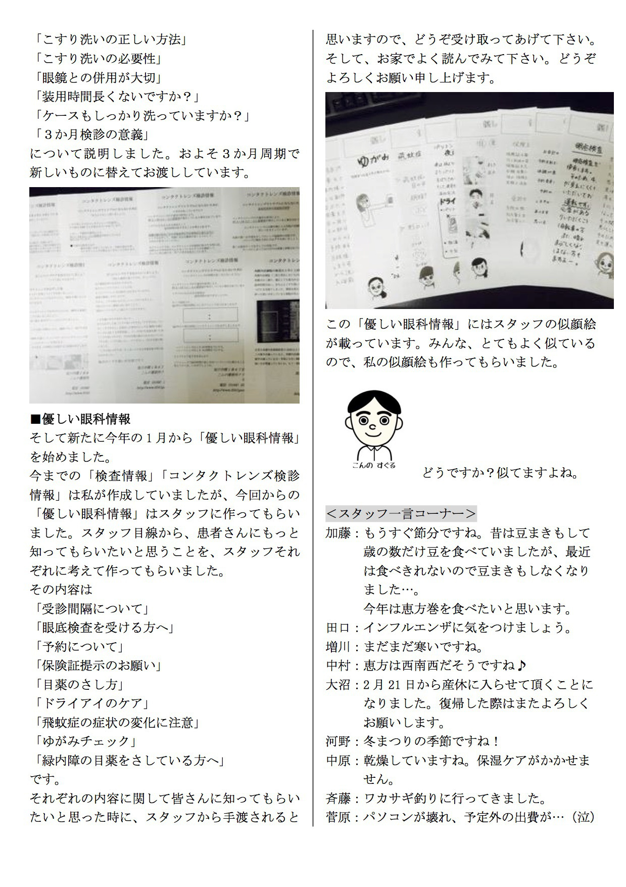 こんの優眼科クリニックは、「患者さんに優しい眼科クリニック」を目指して、平成15年7月26日に開院致しました。開院と同時に、インターネットにホームページを立ち上げました。ホームページのアドレスは8341ganka.com(優しい眼科ドットコム)です。この「優しい眼科通信」では、ホームページに掲載しています情報や、日常診療中には詳しくお話できない目の検査や目の病気などについての情報を、お届けいたします。