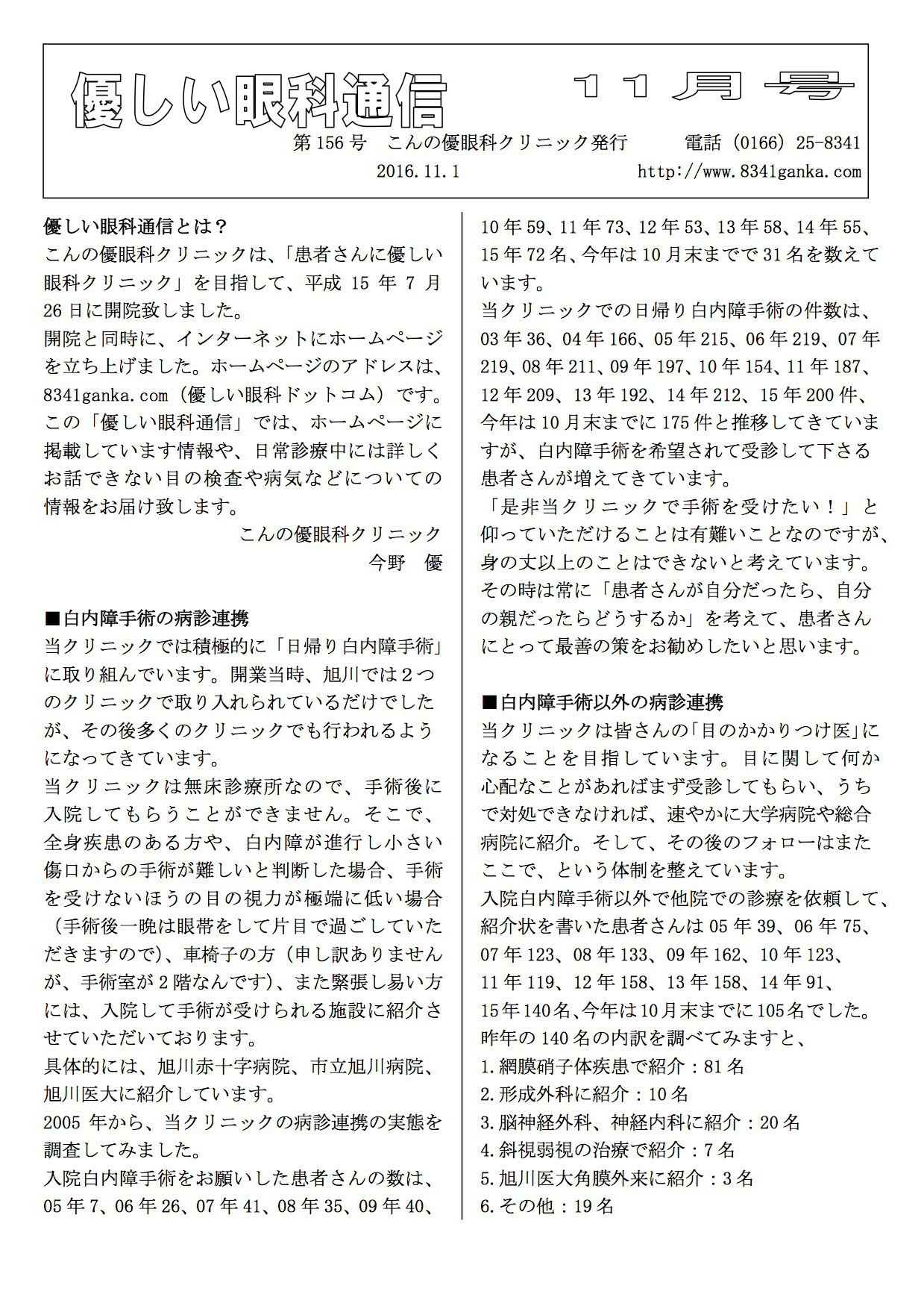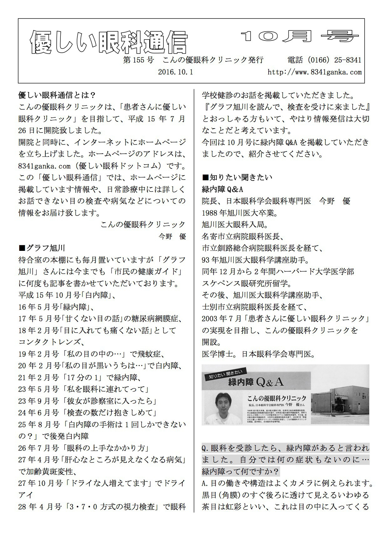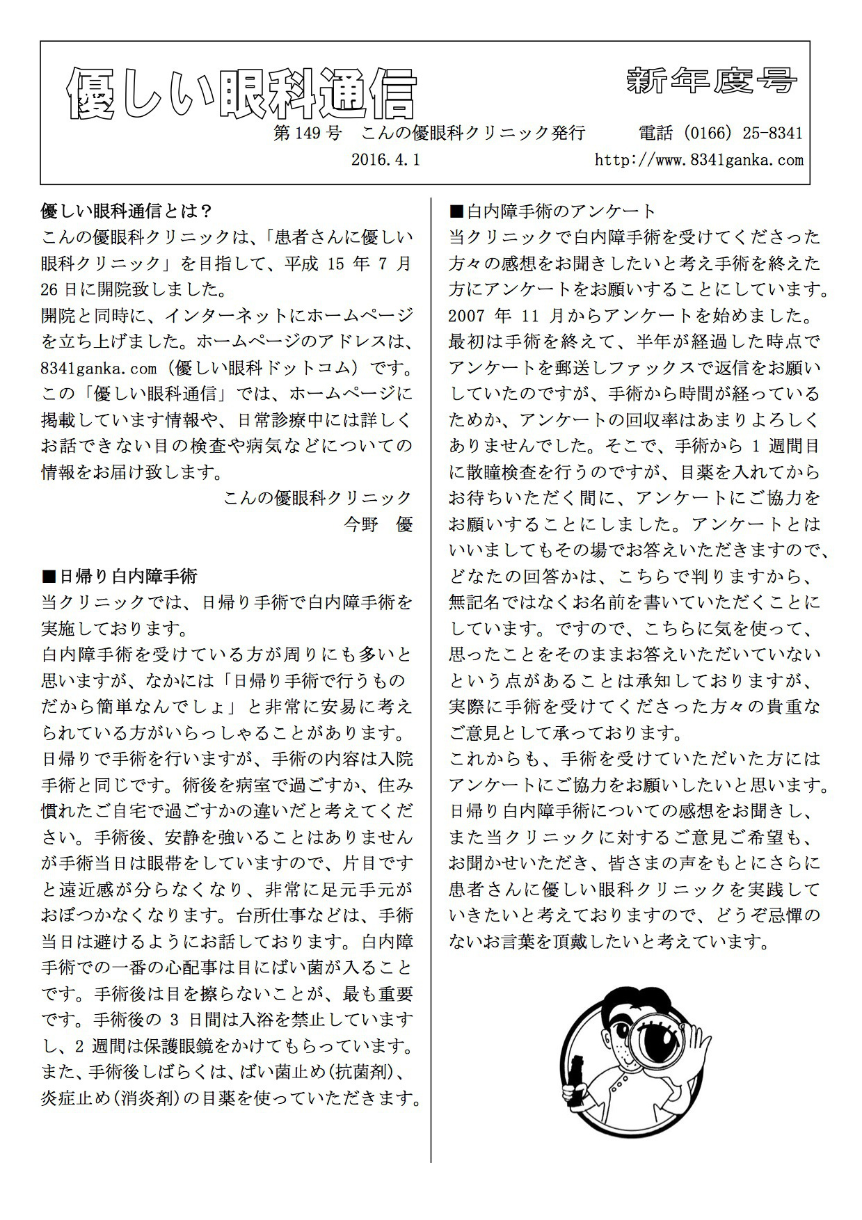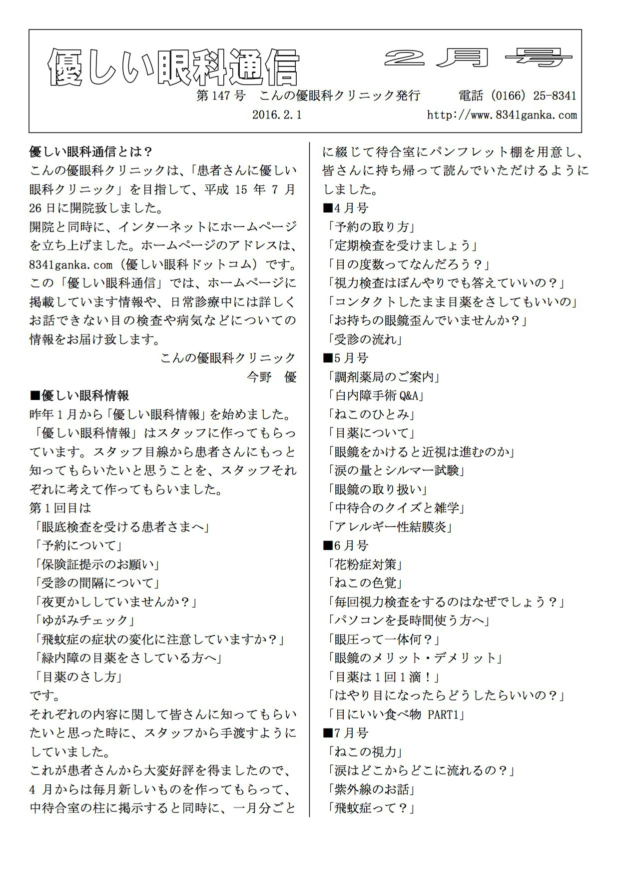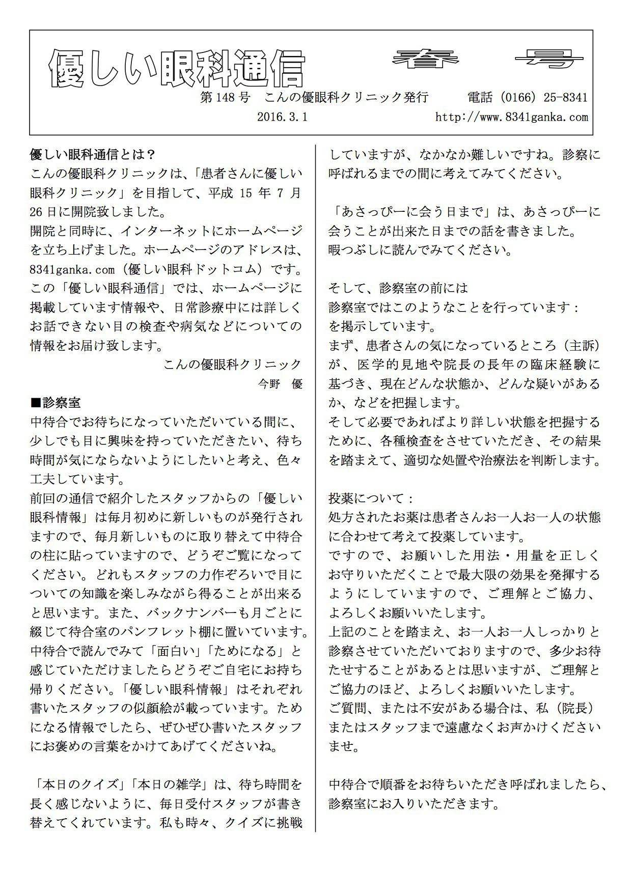 こんの優眼科クリニックは、「患者さんに優しい眼科クリニック」を目指して、平成15年7月26日に開院致しました。開院と同時に、インターネットにホームページを立ち上げました。ホームページのアドレスは8341ganka.com(優しい眼科ドットコム)です。この「優しい眼科通信」では、ホームページに掲載しています情報や、日常診療中には詳しくお話できない目の検査や目の病気などについての情報を、お届けいたします。