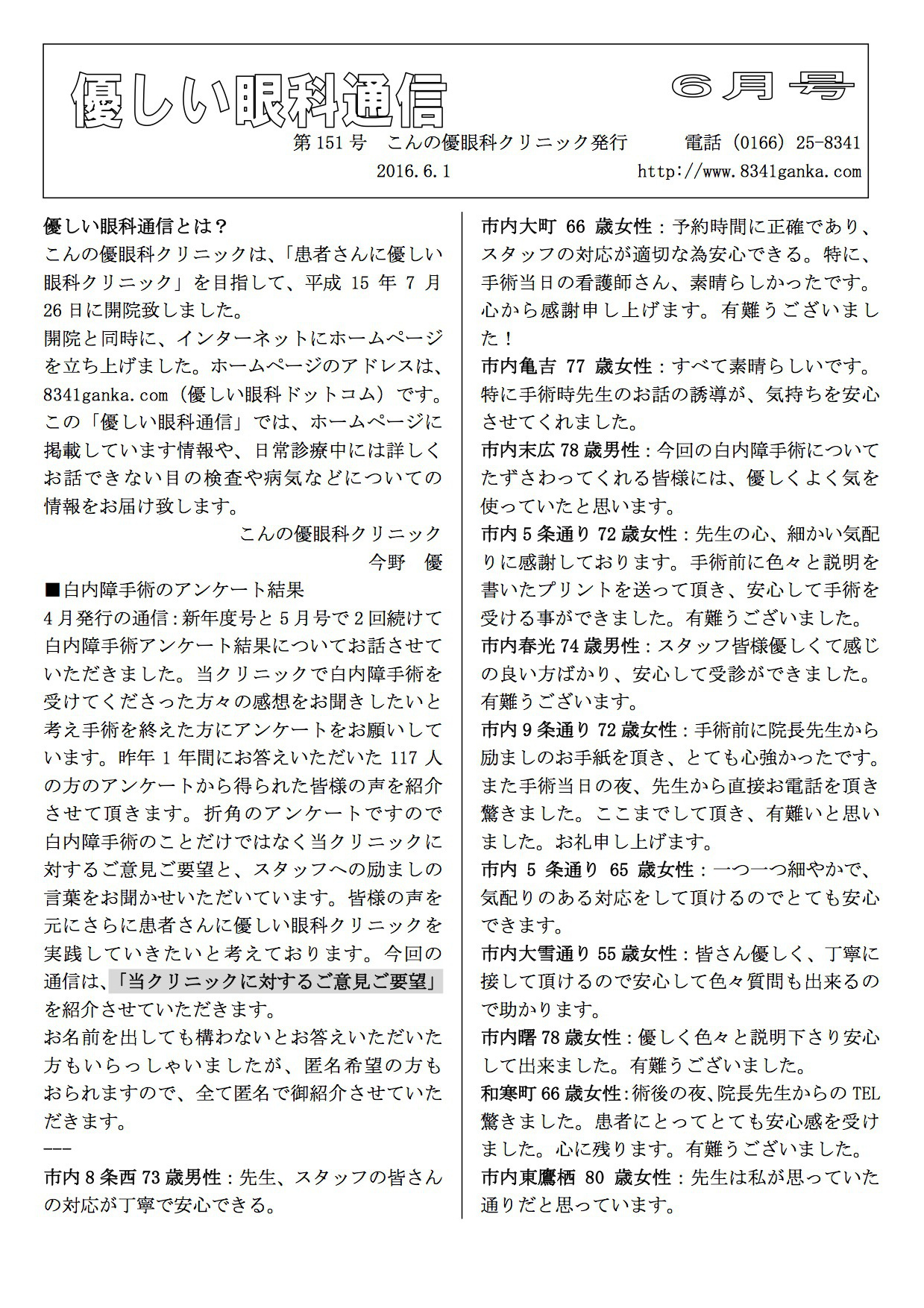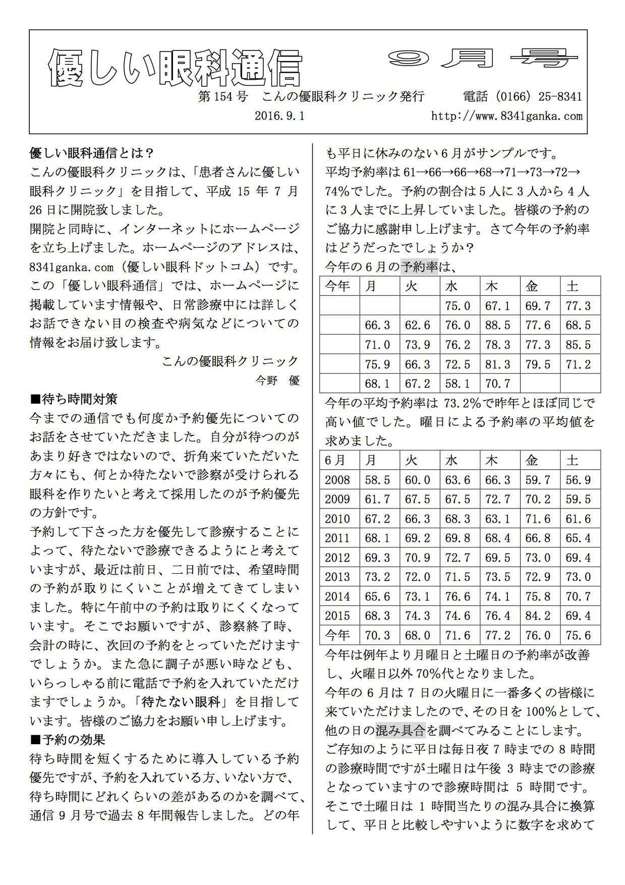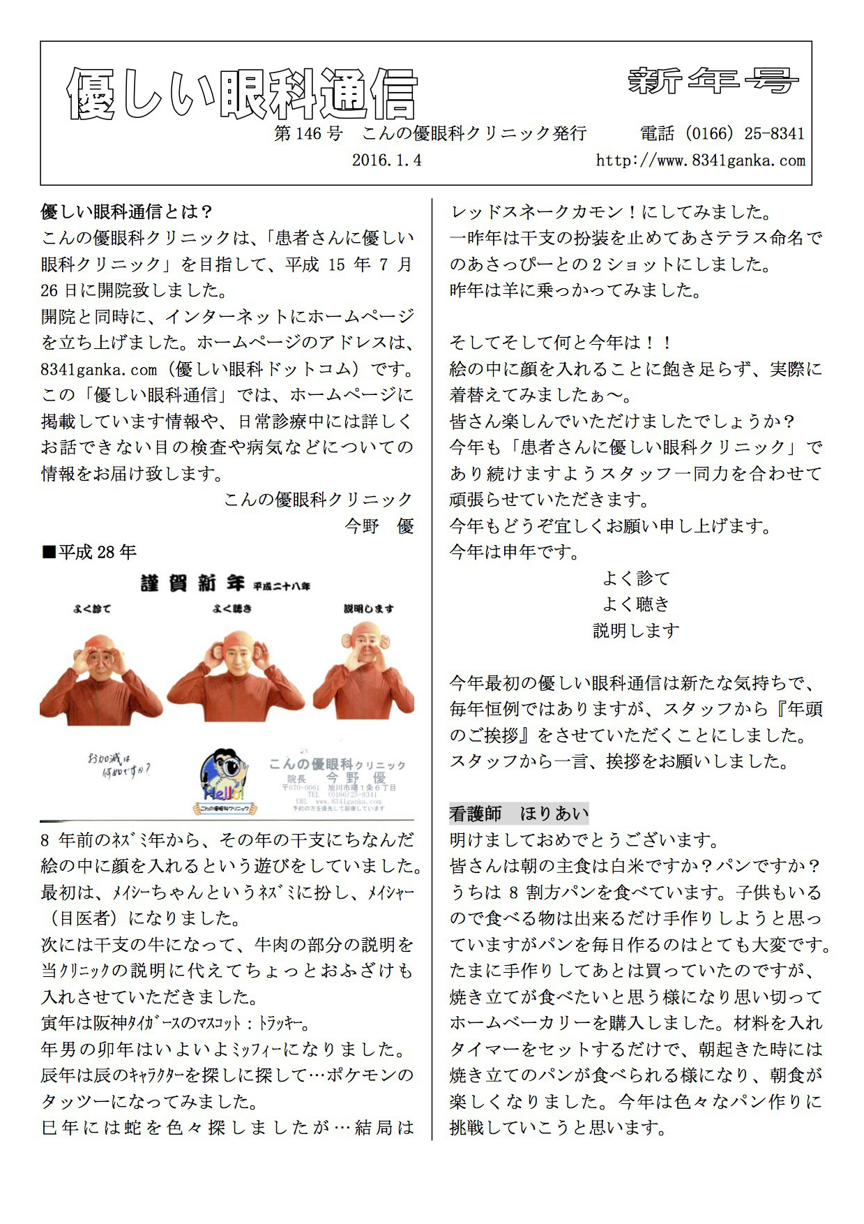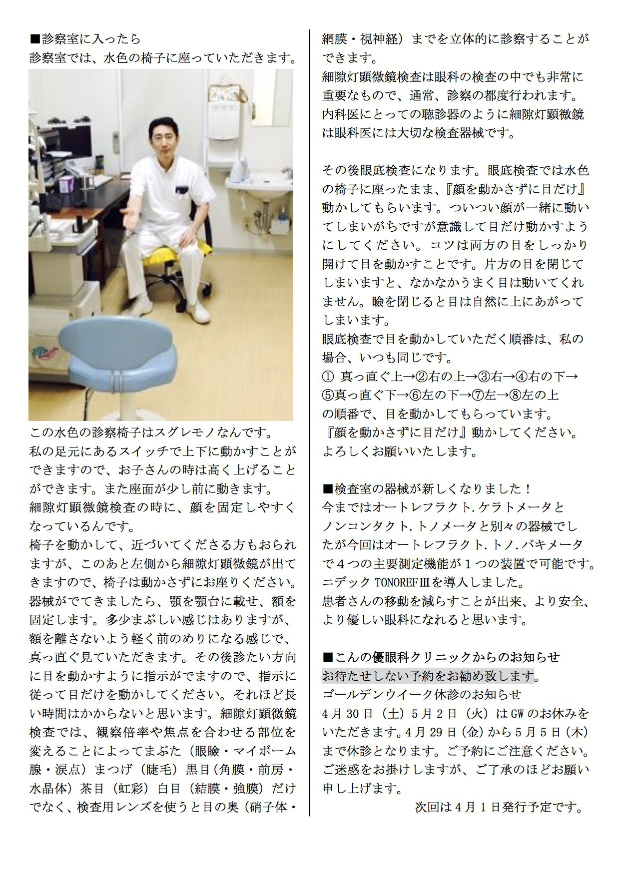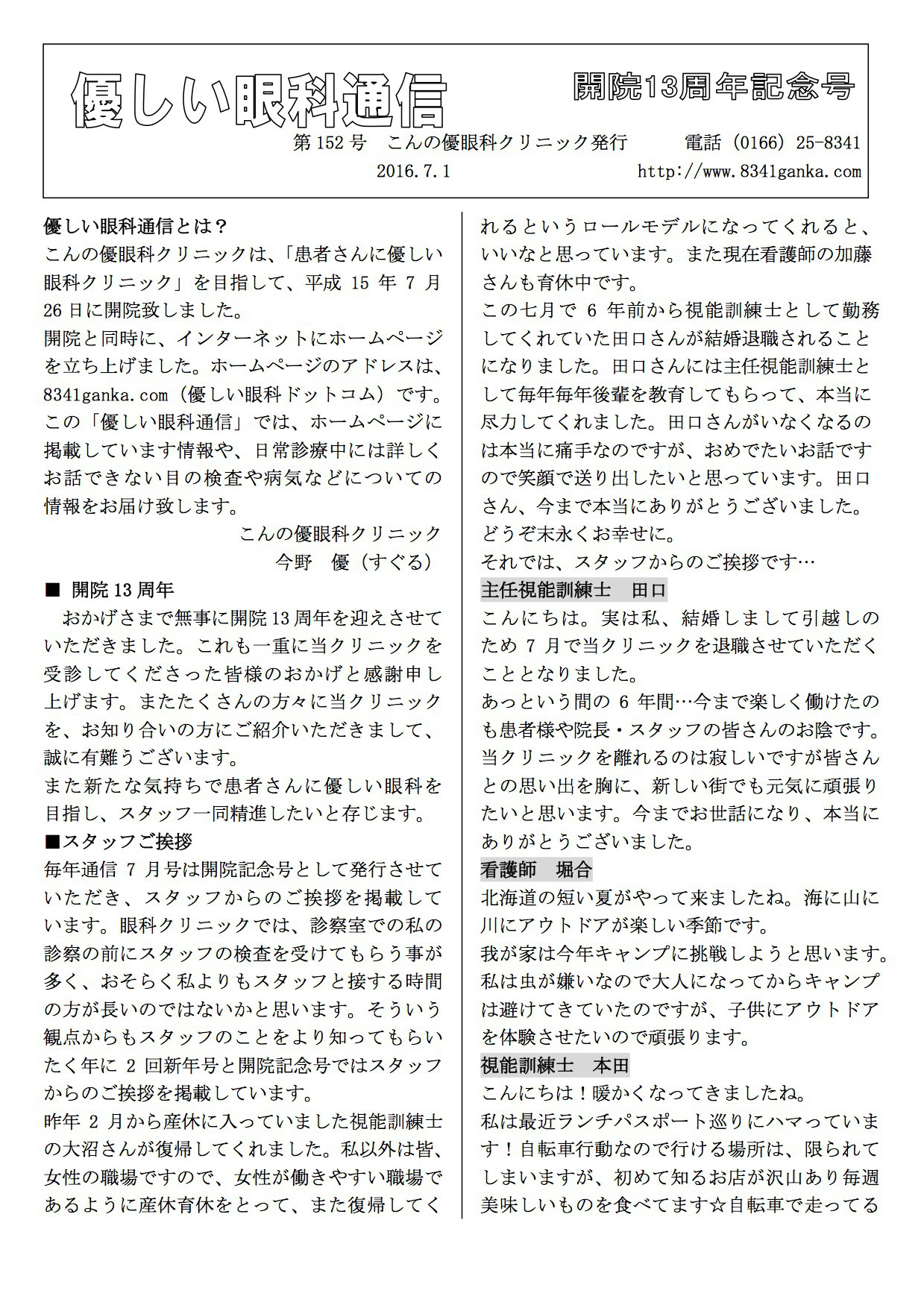 こんの優眼科クリニックは、「患者さんに優しい眼科クリニック」を目指して、平成15年7月26日に開院致しました。開院と同時に、インターネットにホームページを立ち上げました。ホームページのアドレスは8341ganka.com(優しい眼科ドットコム)です。この「優しい眼科通信」では、ホームページに掲載しています情報や、日常診療中には詳しくお話できない目の検査や目の病気などについての情報を、お届けいたします。
