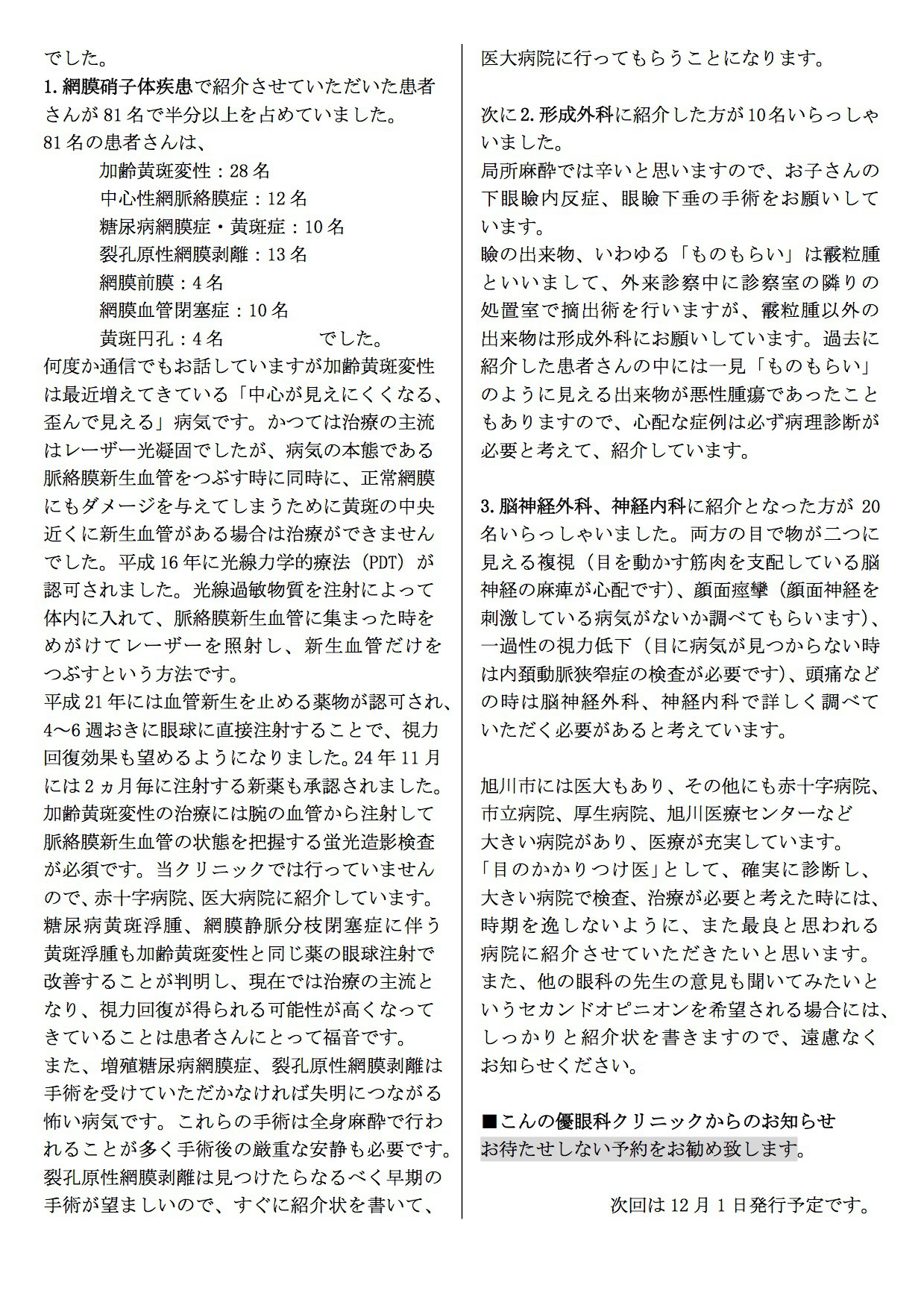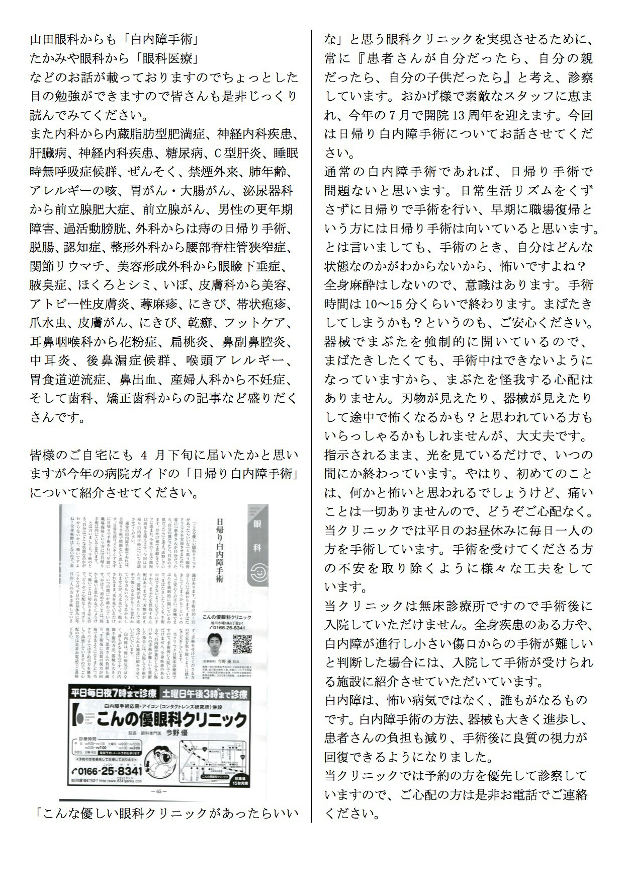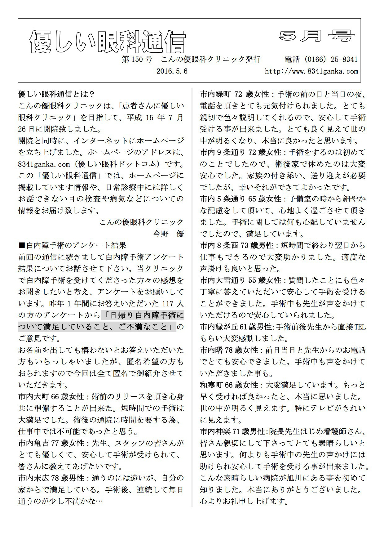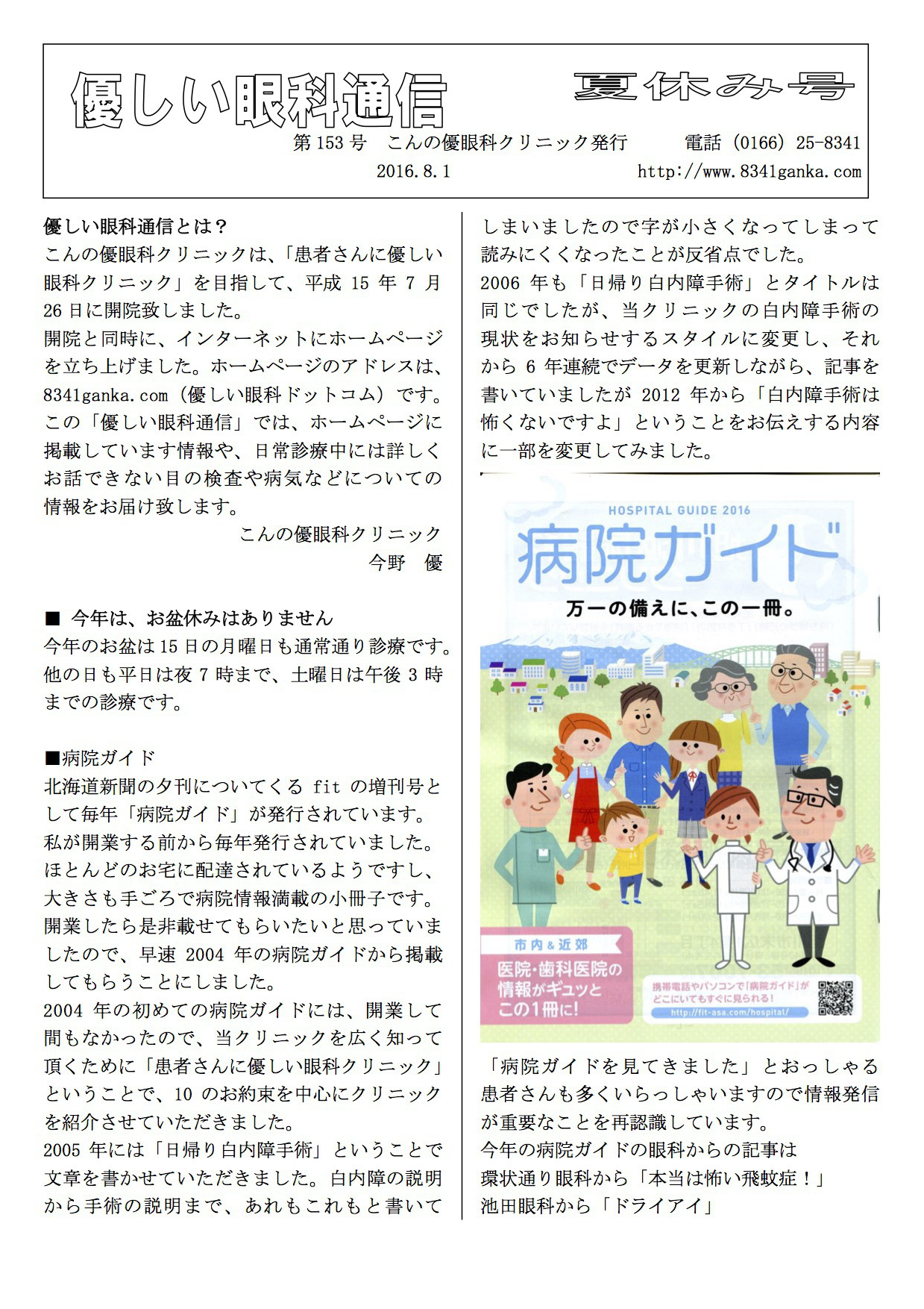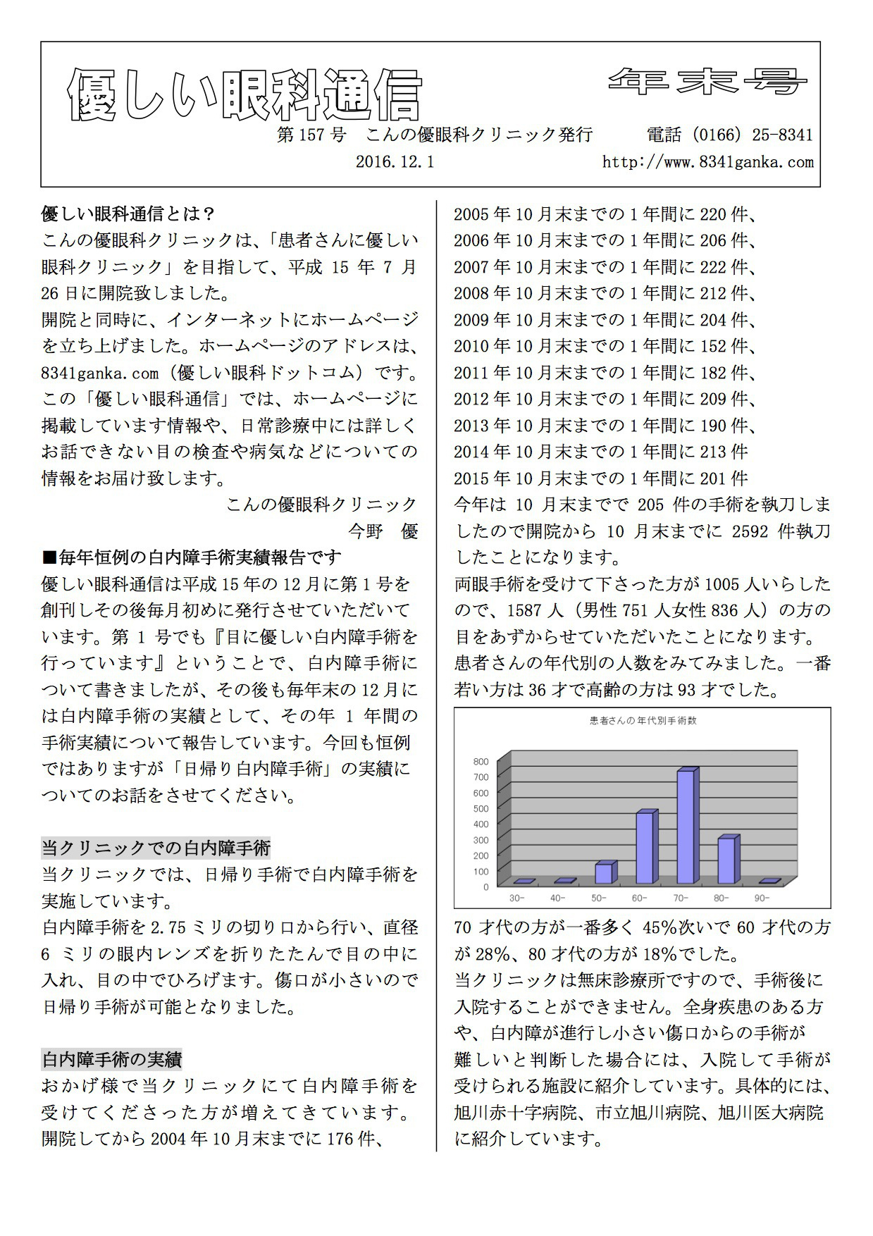 こんの優眼科クリニックは、「患者さんに優しい眼科クリニック」を目指して、平成15年7月26日に開院致しました。開院と同時に、インターネットにホームページを立ち上げました。ホームページのアドレスは8341ganka.com(優しい眼科ドットコム)です。この「優しい眼科通信」では、ホームページに掲載しています情報や、日常診療中には詳しくお話できない目の検査や目の病気などについての情報を、お届けいたします。