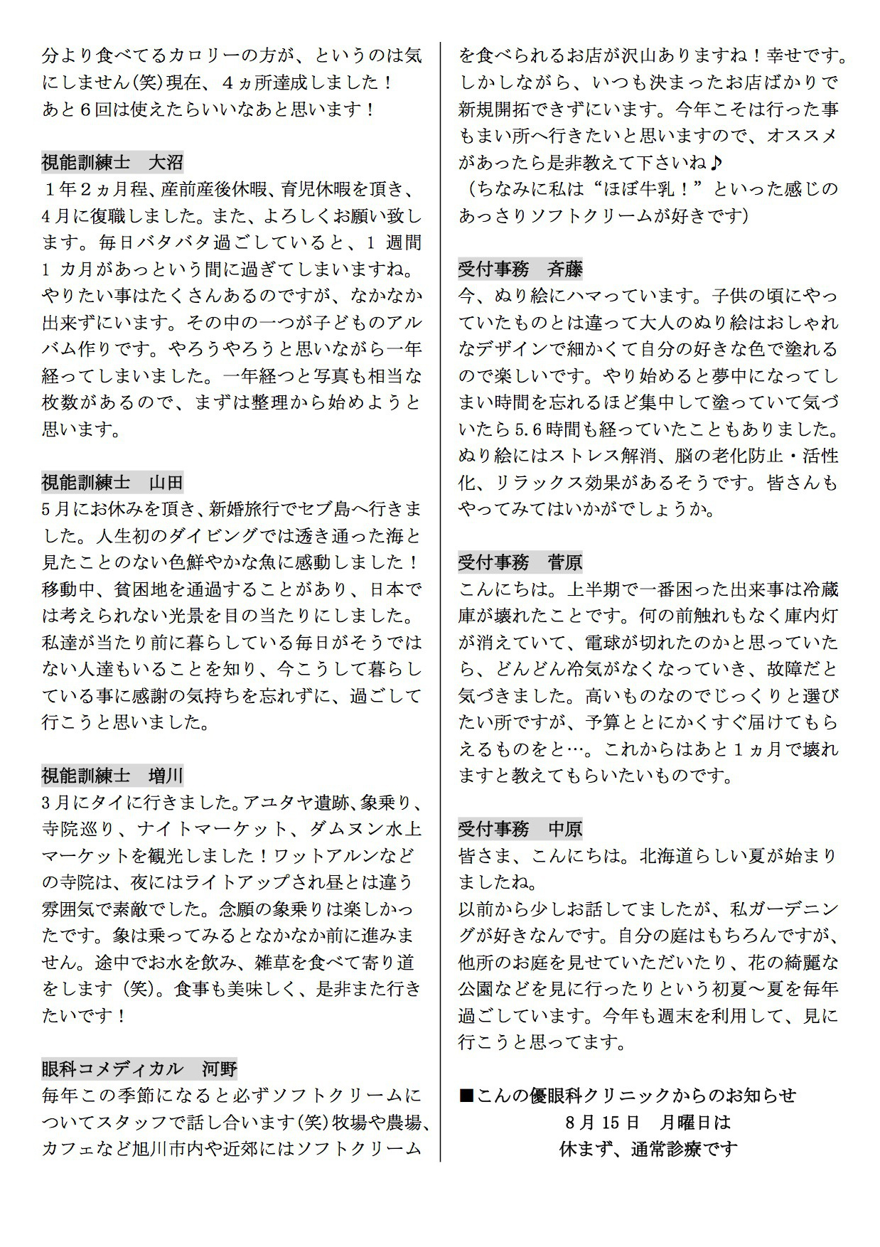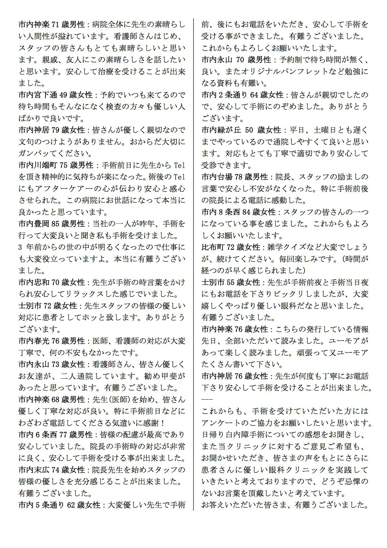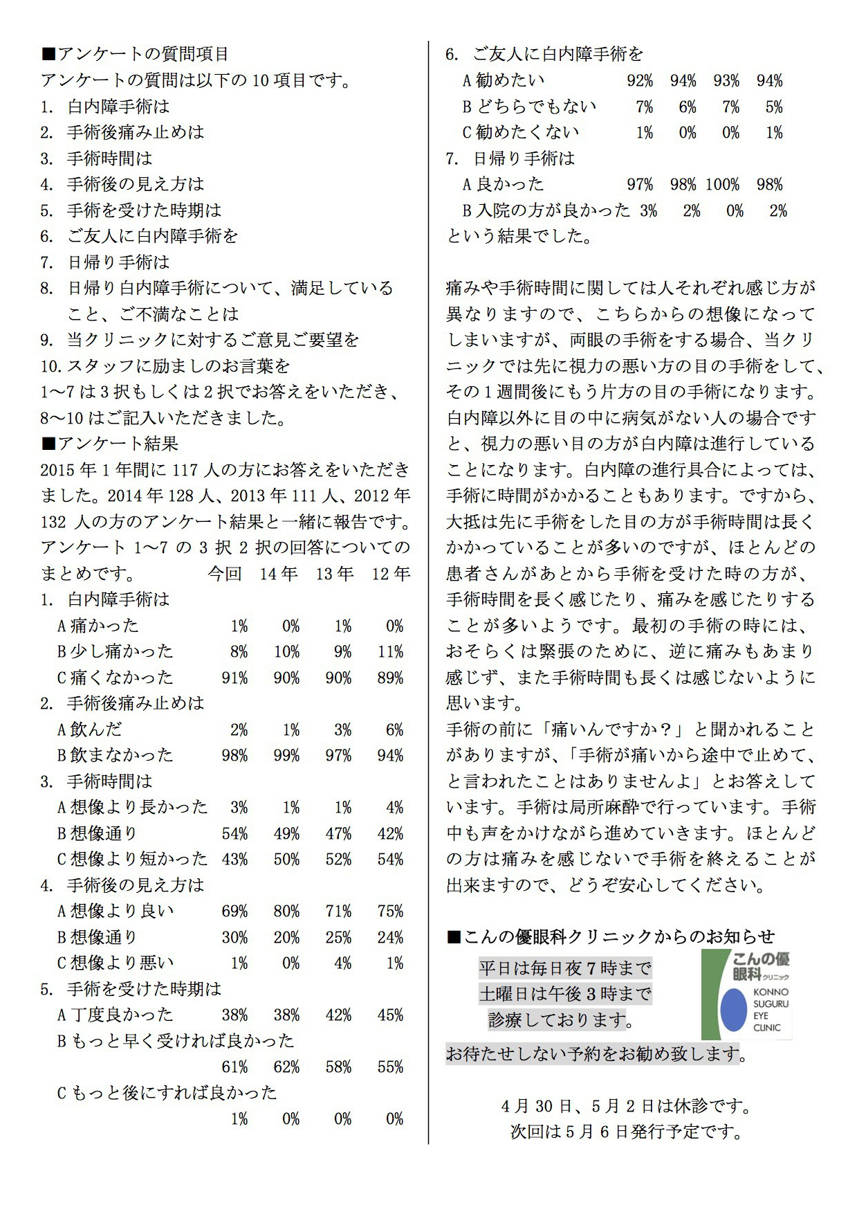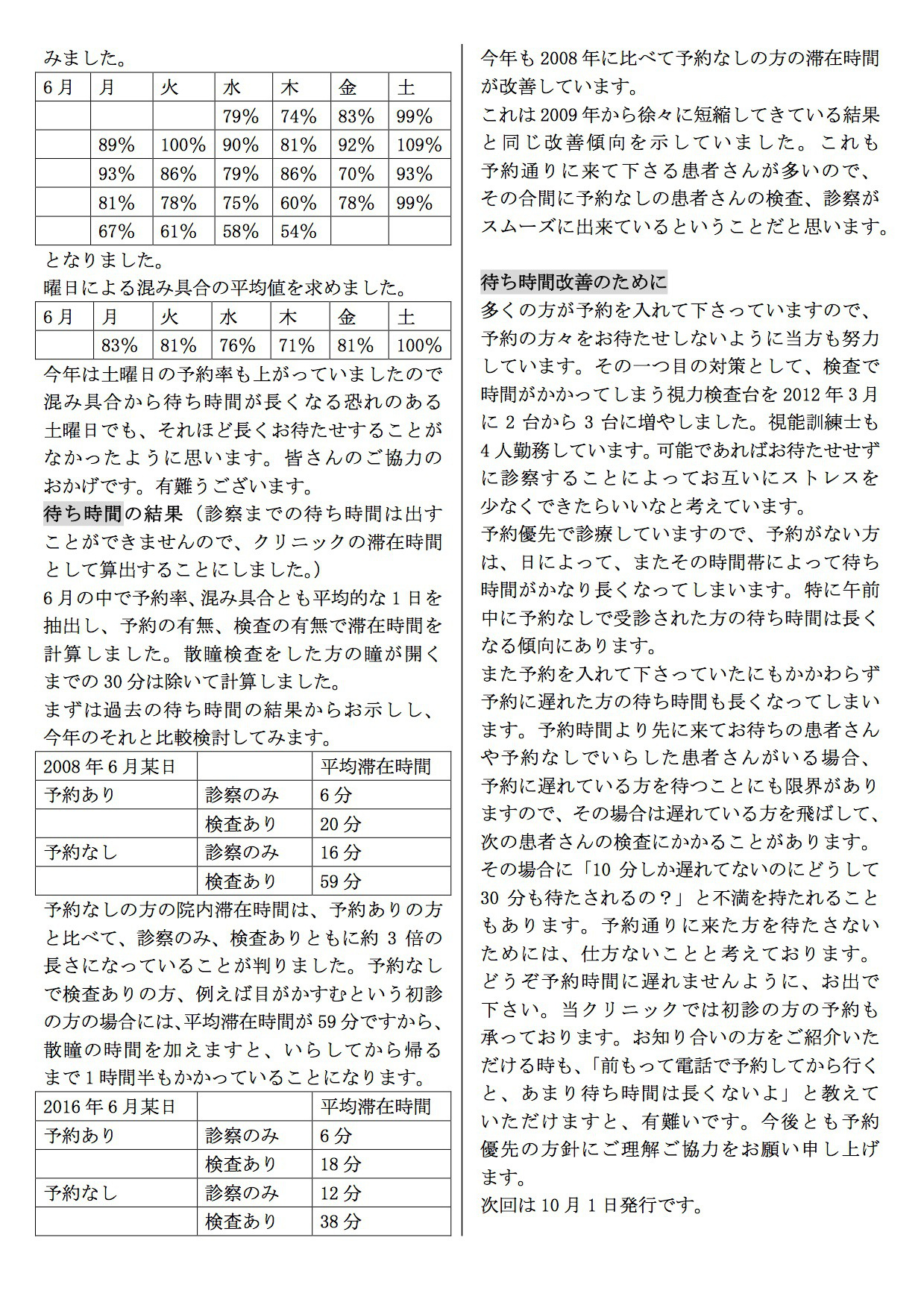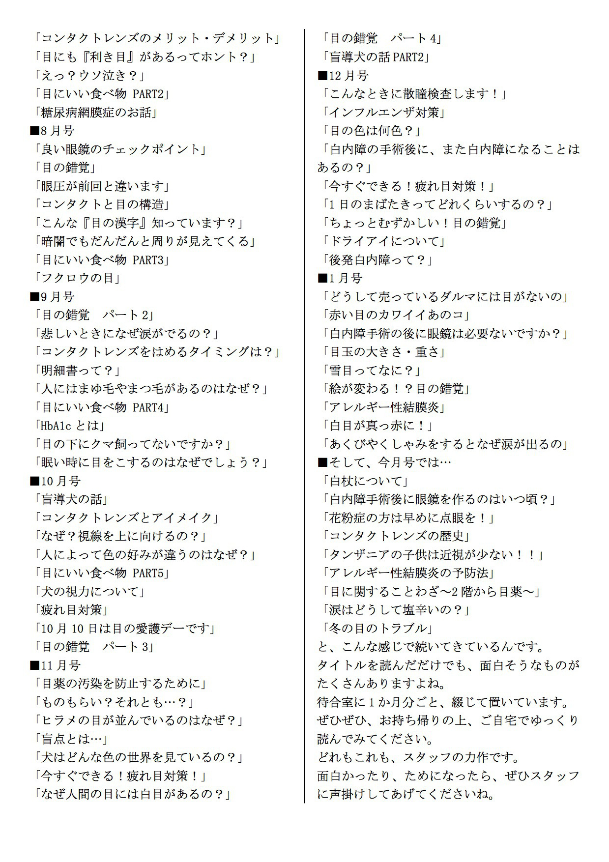 こんの優眼科クリニックは、「患者さんに優しい眼科クリニック」を目指して、平成15年7月26日に開院致しました。開院と同時に、インターネットにホームページを立ち上げました。ホームページのアドレスは8341ganka.com(優しい眼科ドットコム)です。この「優しい眼科通信」では、ホームページに掲載しています情報や、日常診療中には詳しくお話できない目の検査や目の病気などについての情報を、お届けいたします。