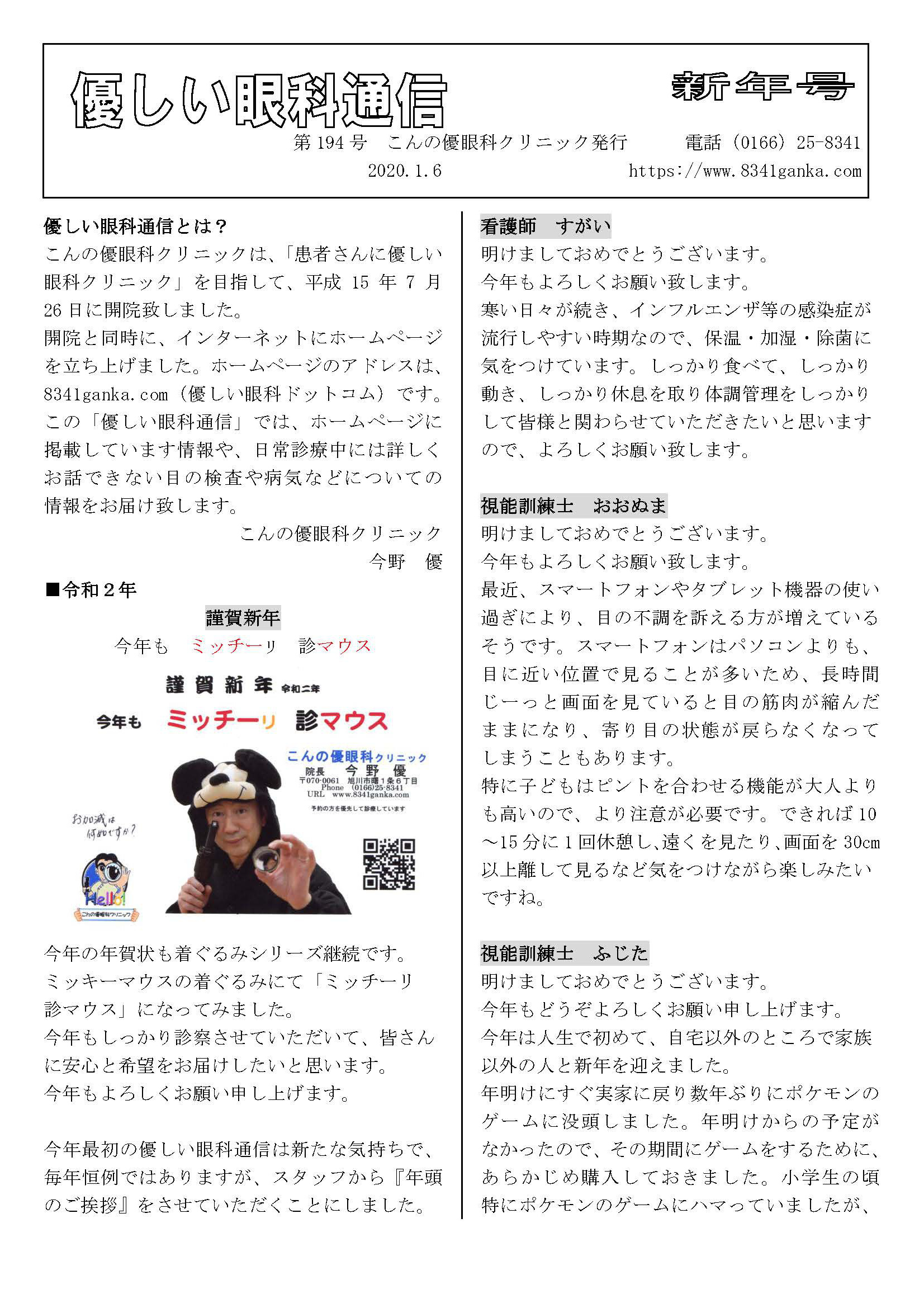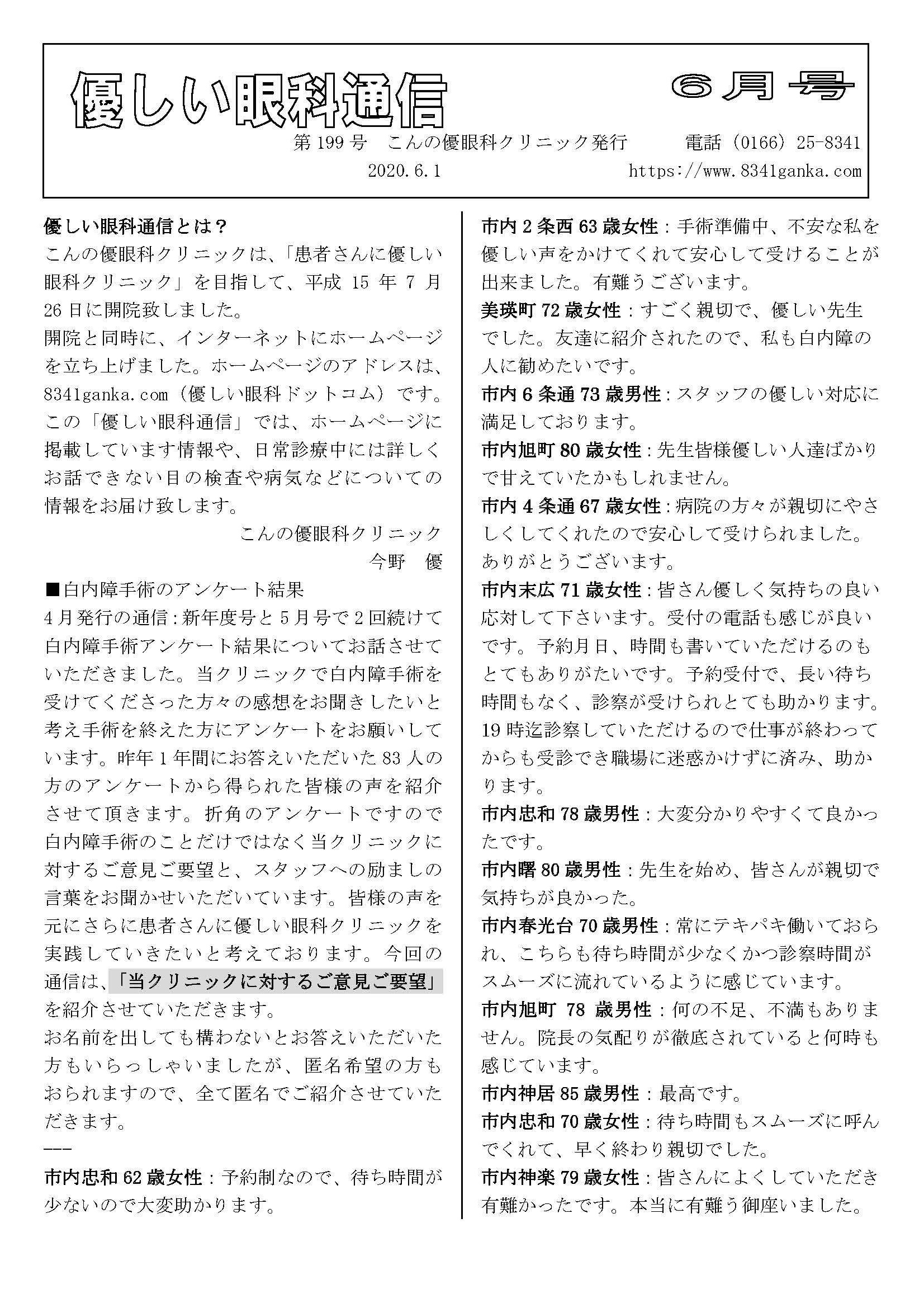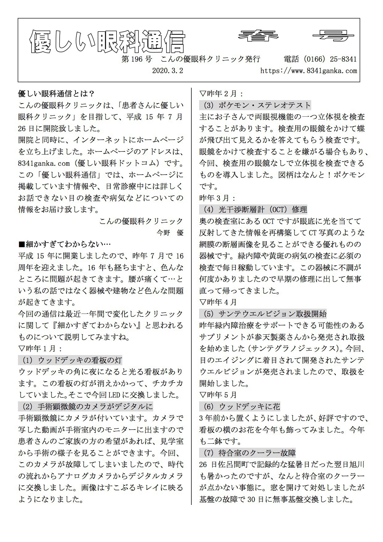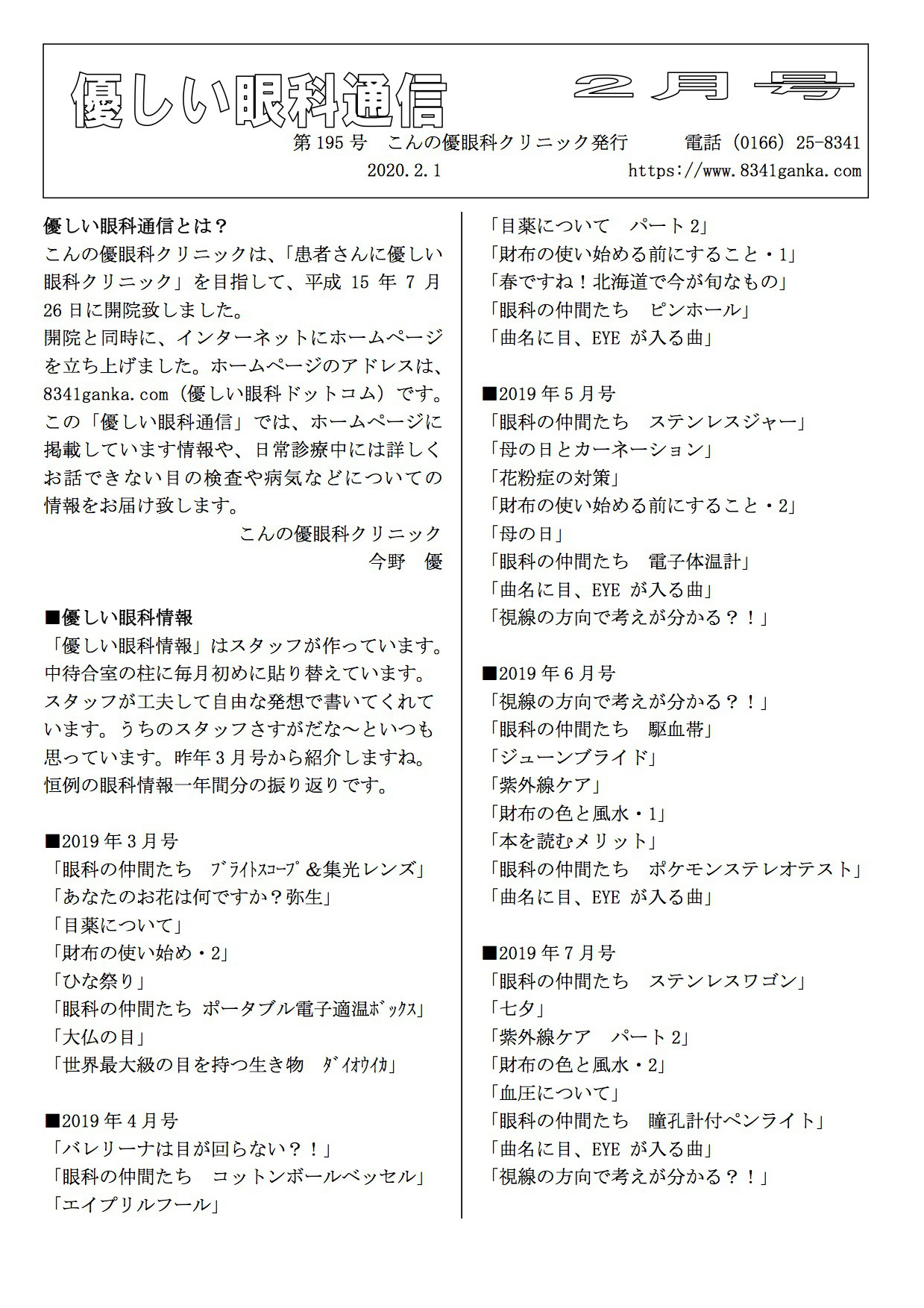 こんの優眼科クリニックは、「患者さんに優しい眼科クリニック」を目指して、平成15年7月26日に開院致しました。開院と同時に、インターネットにホームページを立ち上げました。ホームページのアドレスは8341ganka.com(優しい眼科ドットコム)です。この「優しい眼科通信」では、ホームページに掲載しています情報や、日常診療中には詳しくお話できない目の検査や目の病気などについての情報を、お届けいたします。