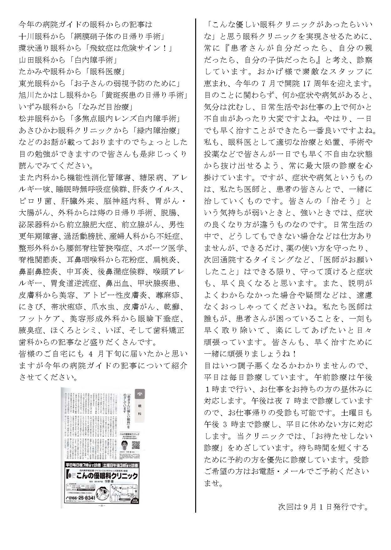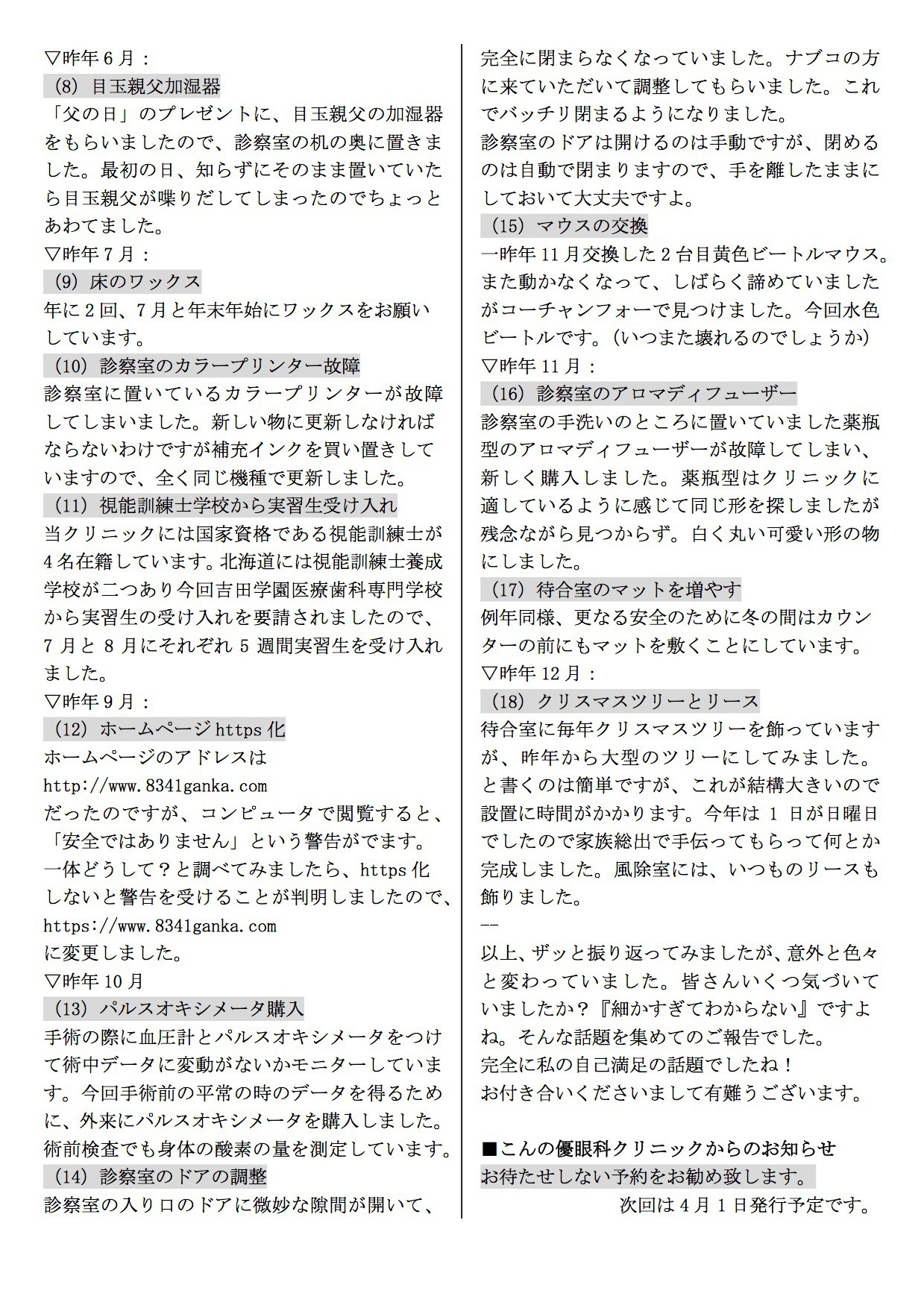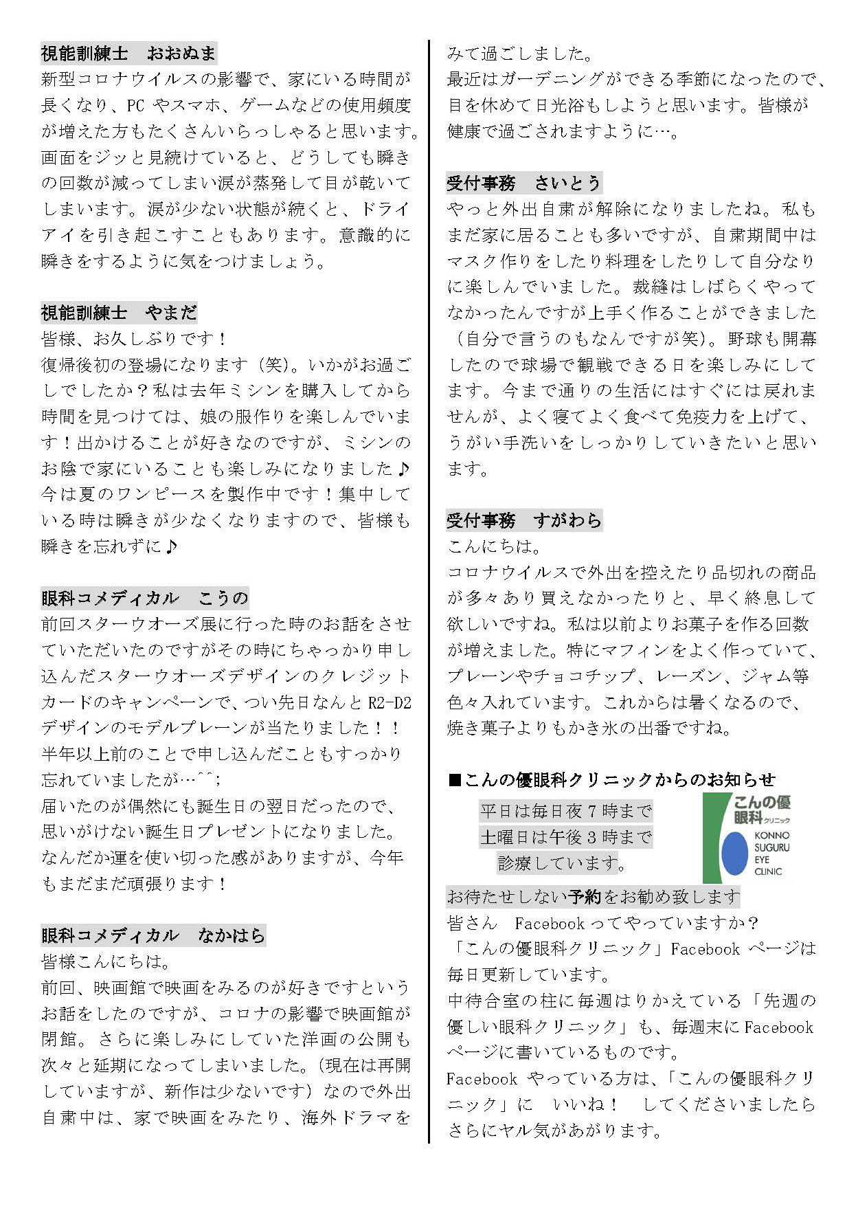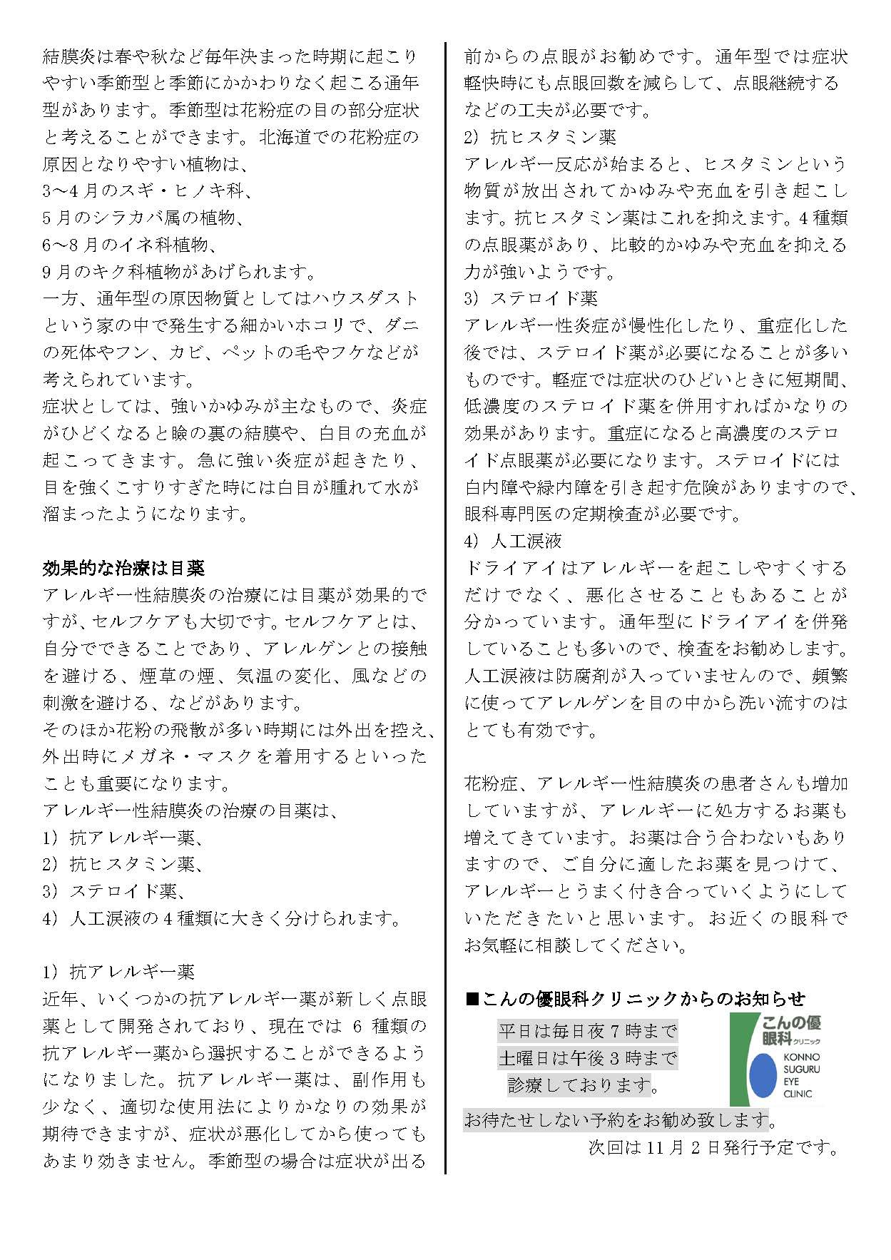 こんの優眼科クリニックは、「患者さんに優しい眼科クリニック」を目指して、平成15年7月26日に開院致しました。開院と同時に、インターネットにホームページを立ち上げました。ホームページのアドレスは8341ganka.com(優しい眼科ドットコム)です。この「優しい眼科通信」では、ホームページに掲載しています情報や、日常診療中には詳しくお話できない目の検査や目の病気などについての情報を、お届けいたします。