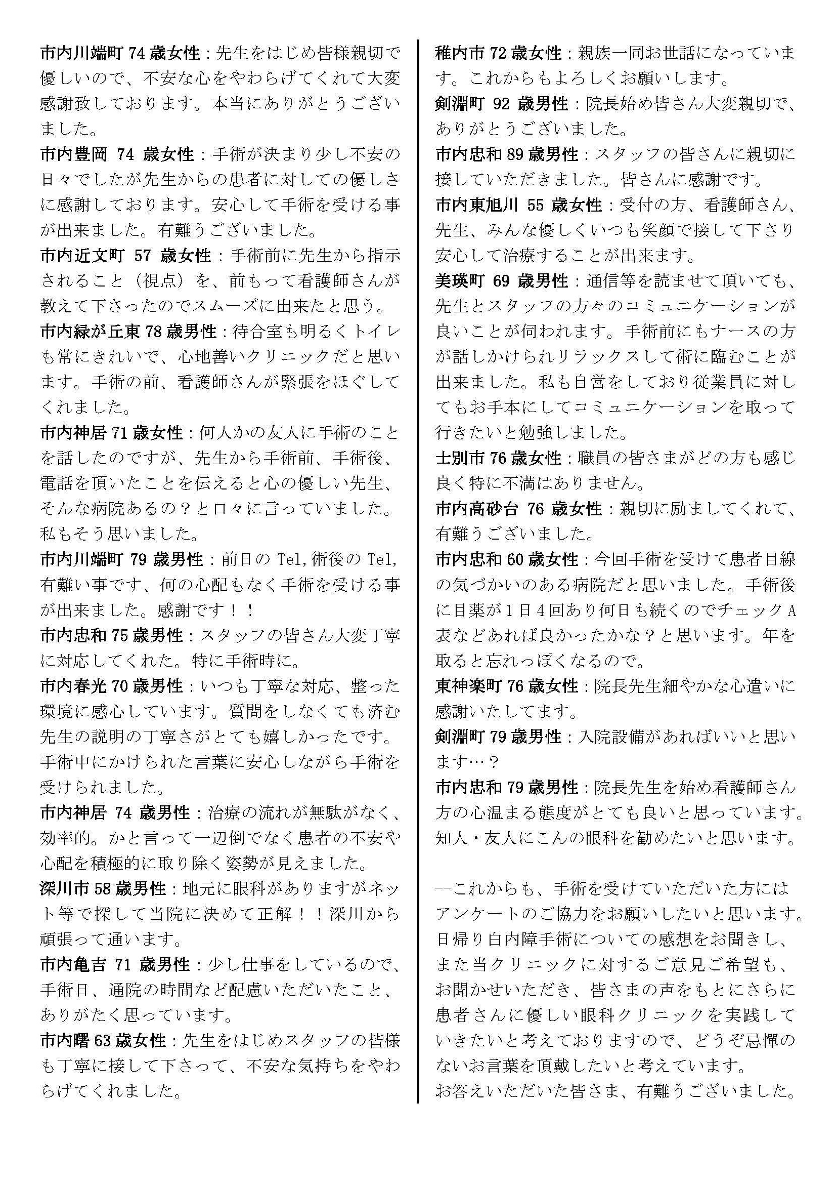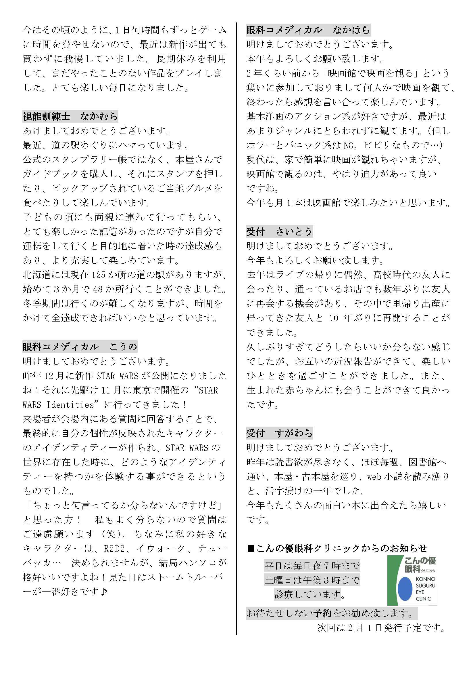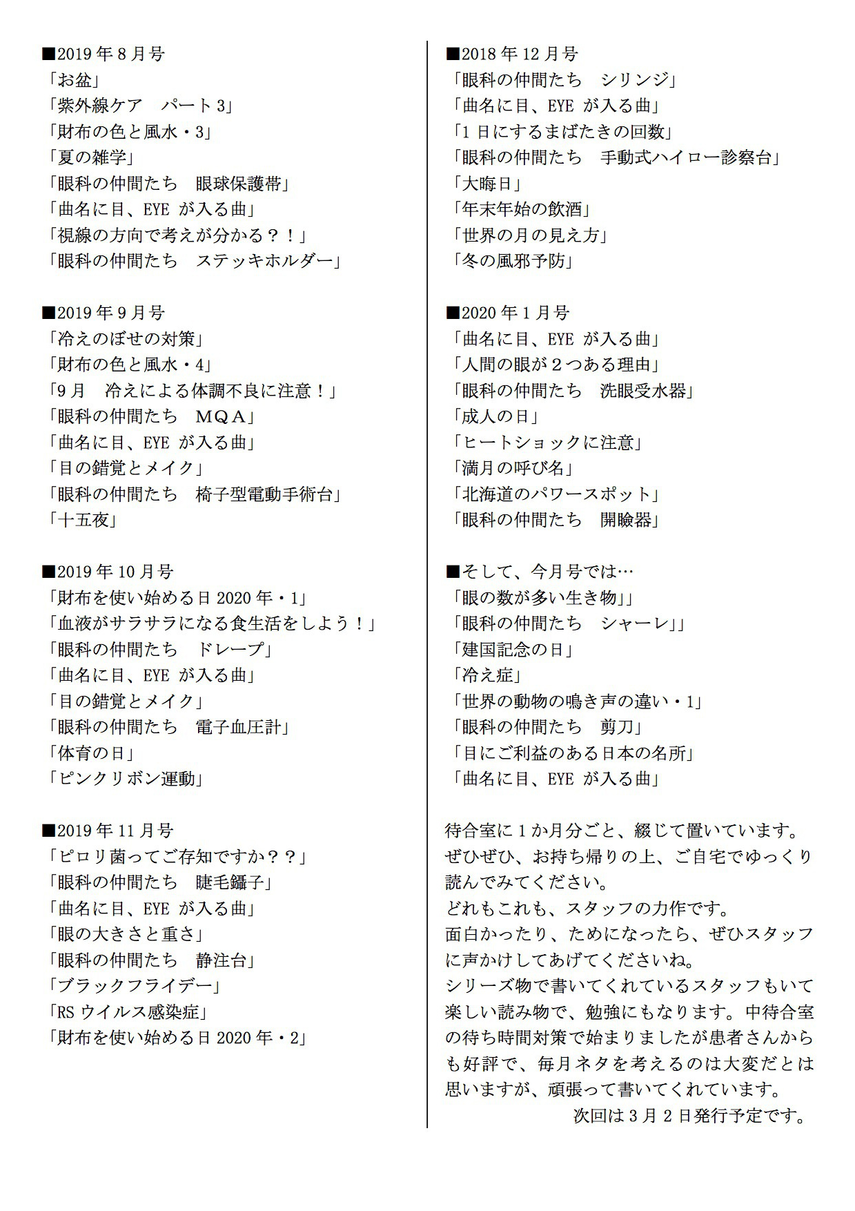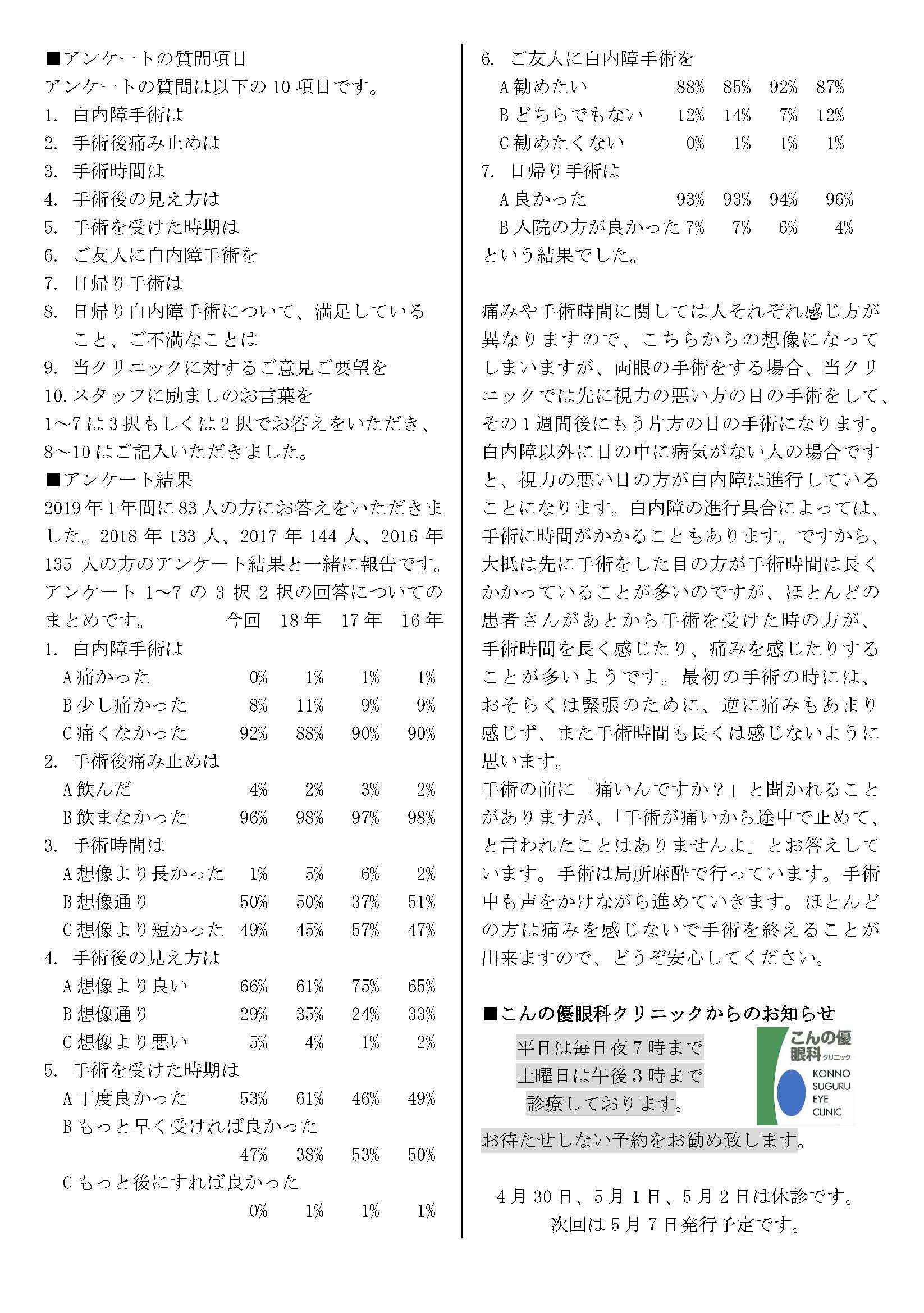 こんの優眼科クリニックは、「患者さんに優しい眼科クリニック」を目指して、平成15年7月26日に開院致しました。開院と同時に、インターネットにホームページを立ち上げました。ホームページのアドレスは8341ganka.com(優しい眼科ドットコム)です。この「優しい眼科通信」では、ホームページに掲載しています情報や、日常診療中には詳しくお話できない目の検査や目の病気などについての情報を、お届けいたします。