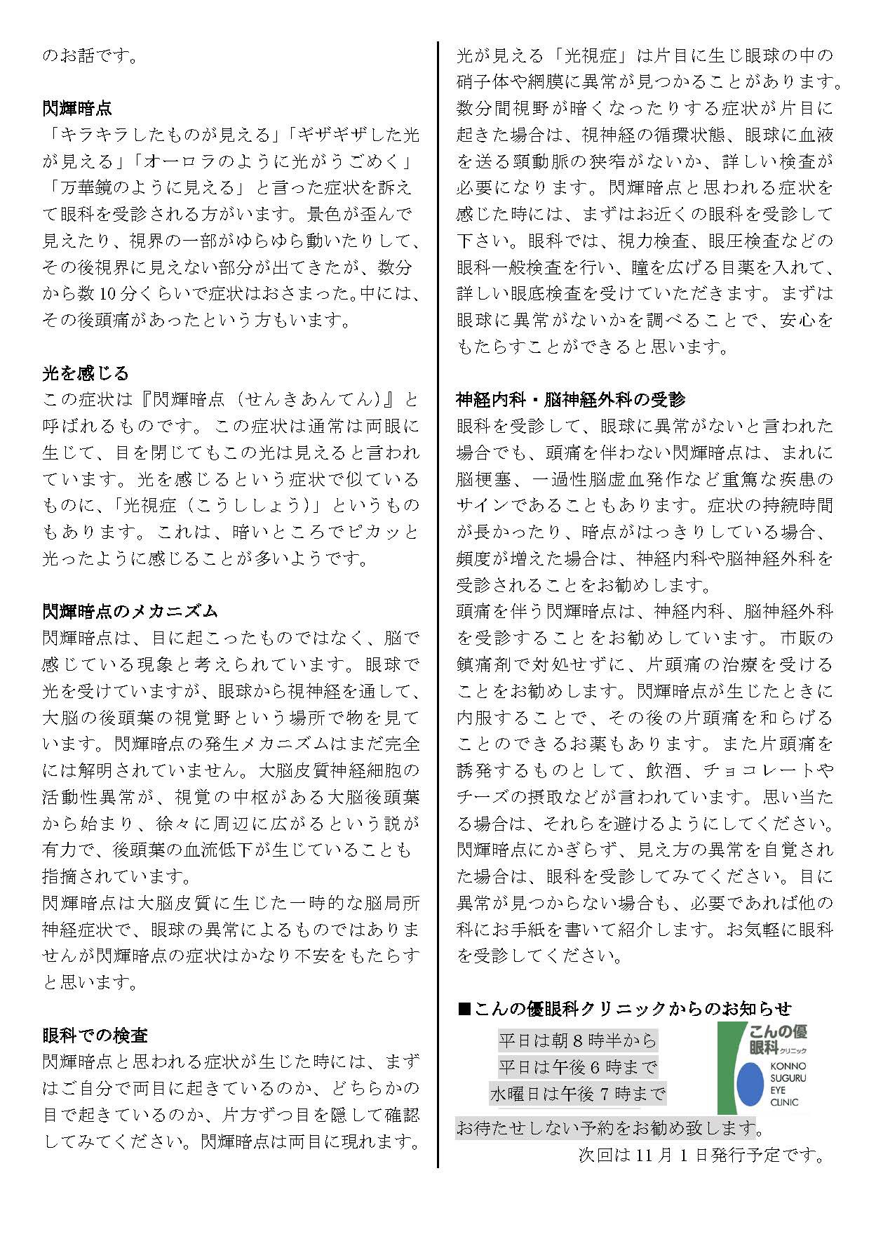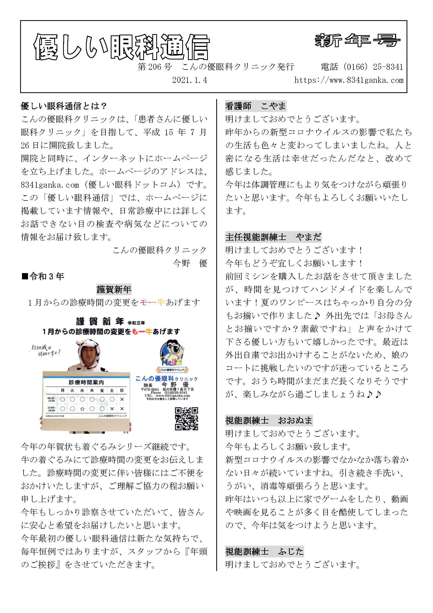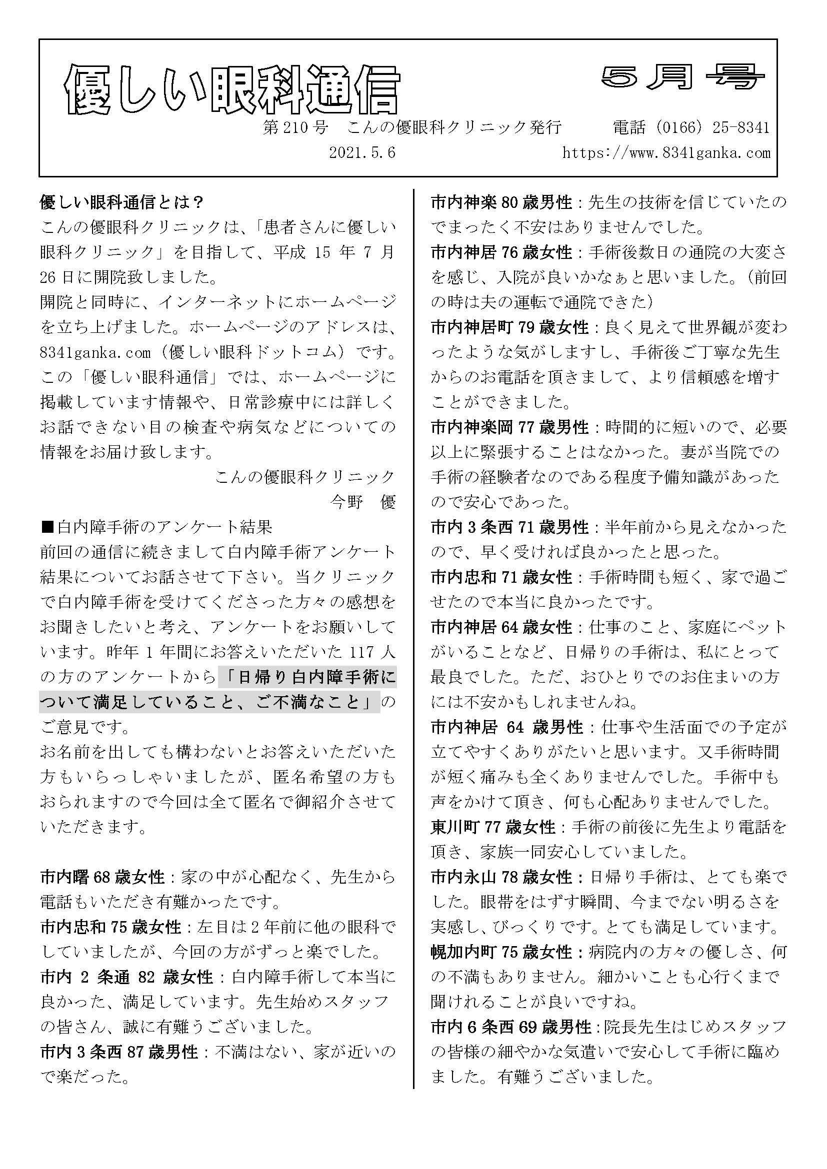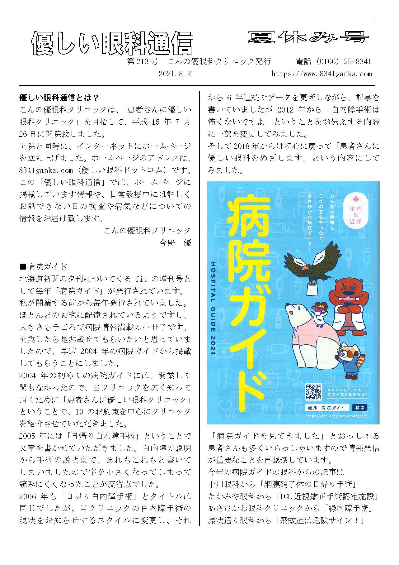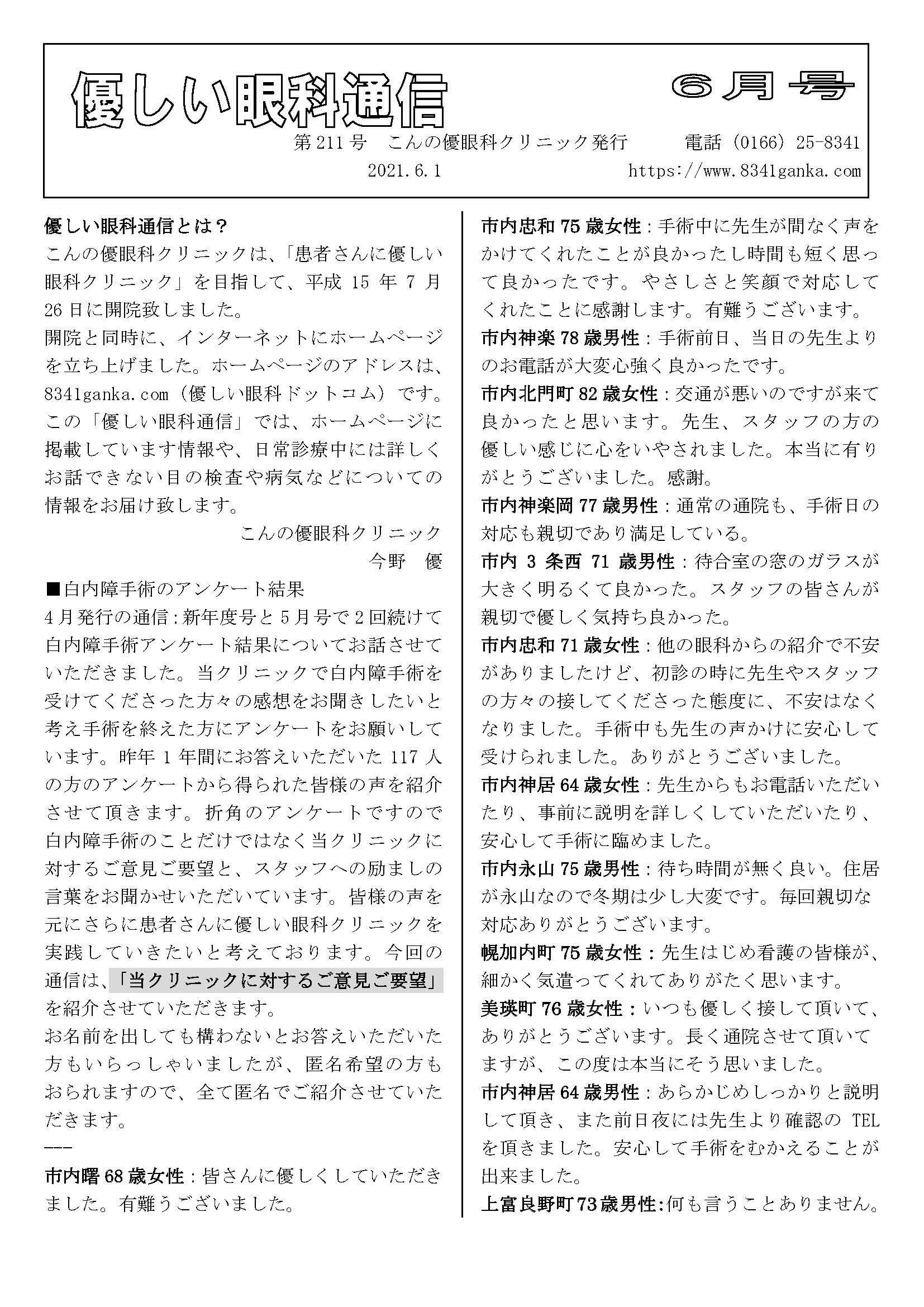 こんの優眼科クリニックは、「患者さんに優しい眼科クリニック」を目指して、平成15年7月26日に開院致しました。開院と同時に、インターネットにホームページを立ち上げました。ホームページのアドレスは8341ganka.com(優しい眼科ドットコム)です。この「優しい眼科通信」では、ホームページに掲載しています情報や、日常診療中には詳しくお話できない目の検査や目の病気などについての情報を、お届けいたします。