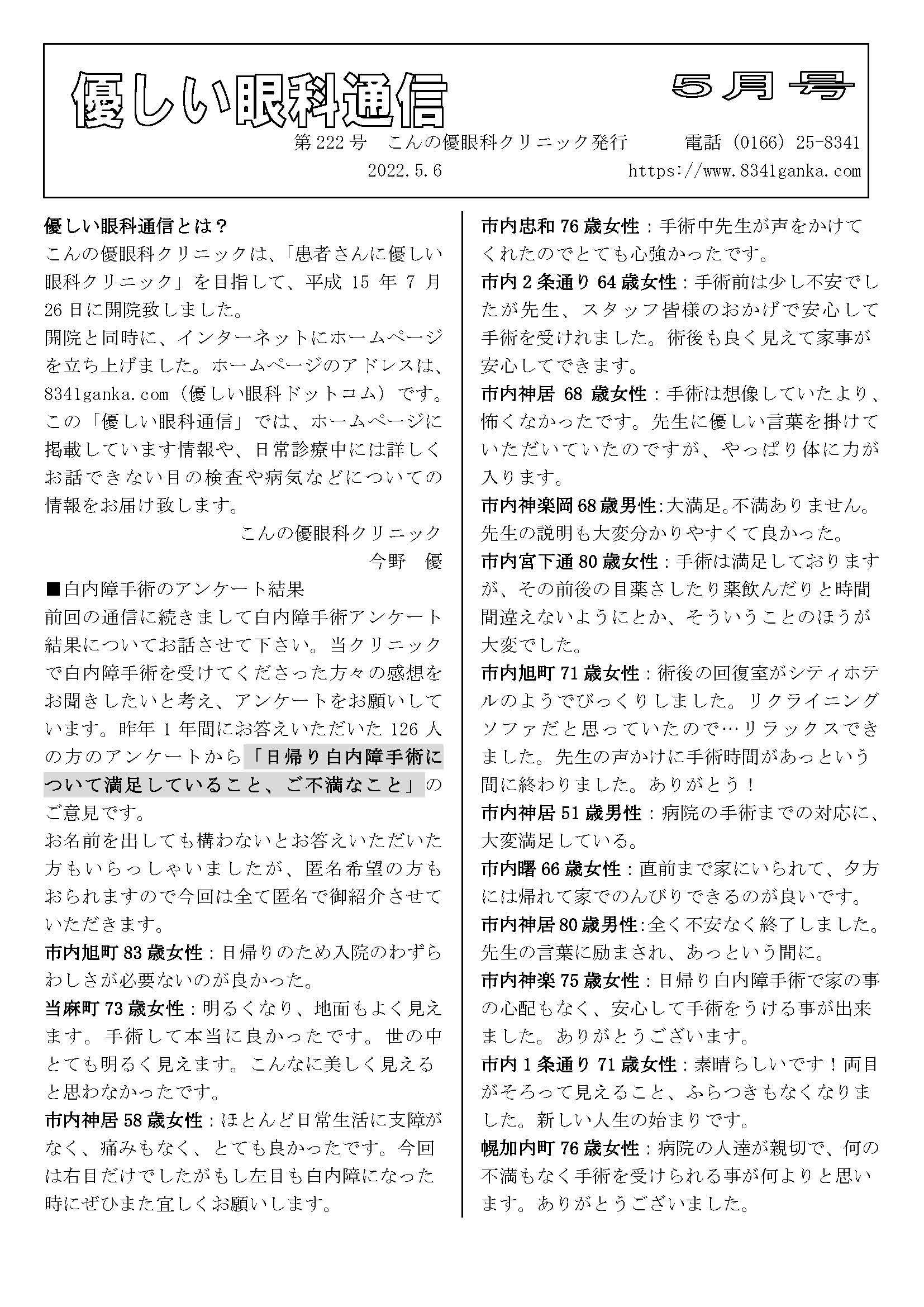 こんの優眼科クリニックは、「患者さんに優しい眼科クリニック」を目指して、平成15年7月26日に開院致しました。開院と同時に、インターネットにホームページを立ち上げました。ホームページのアドレスは8341ganka.com(優しい眼科ドットコム)です。この「優しい眼科通信」では、ホームページに掲載しています情報や、日常診療中には詳しくお話できない目の検査や目の病気などについての情報を、お届けいたします。