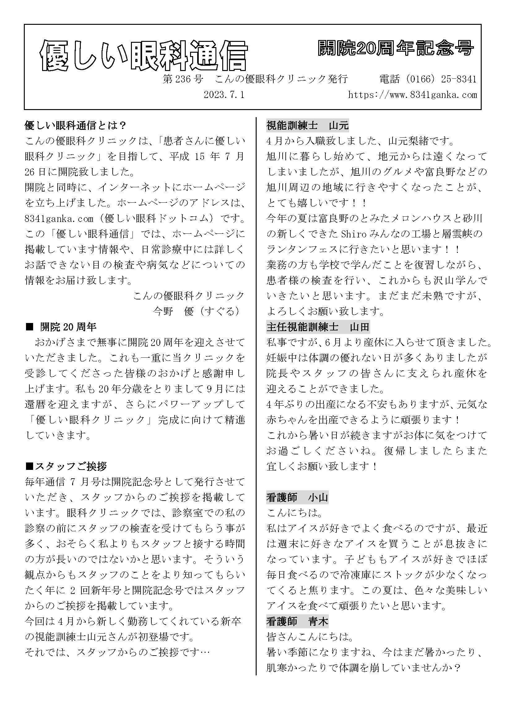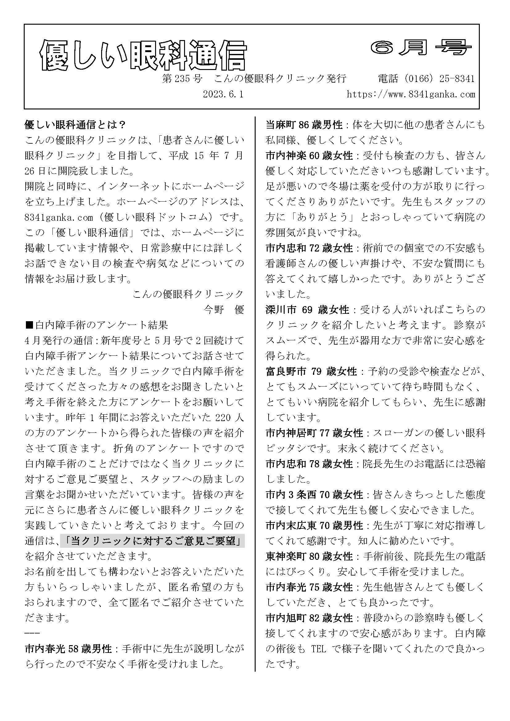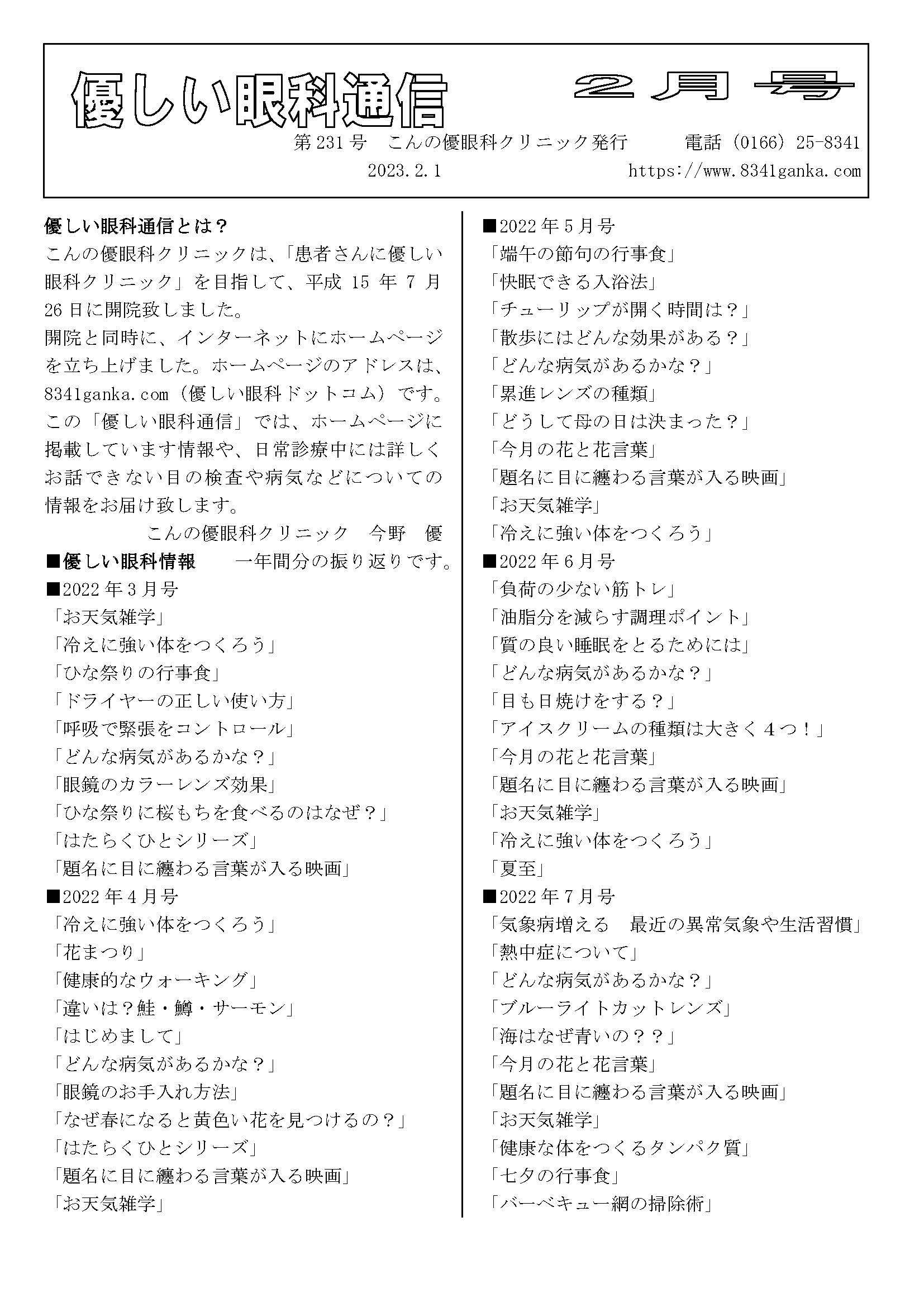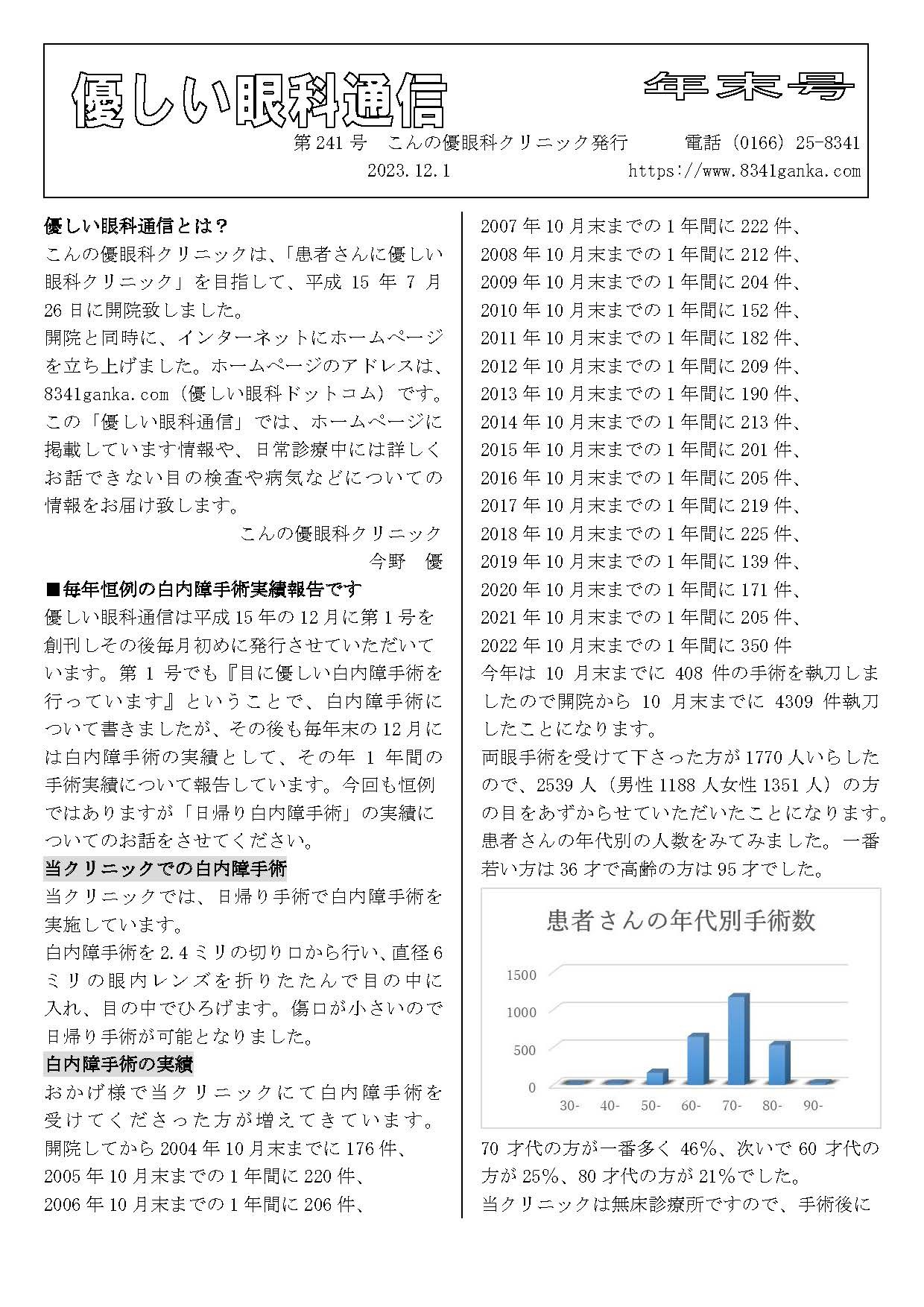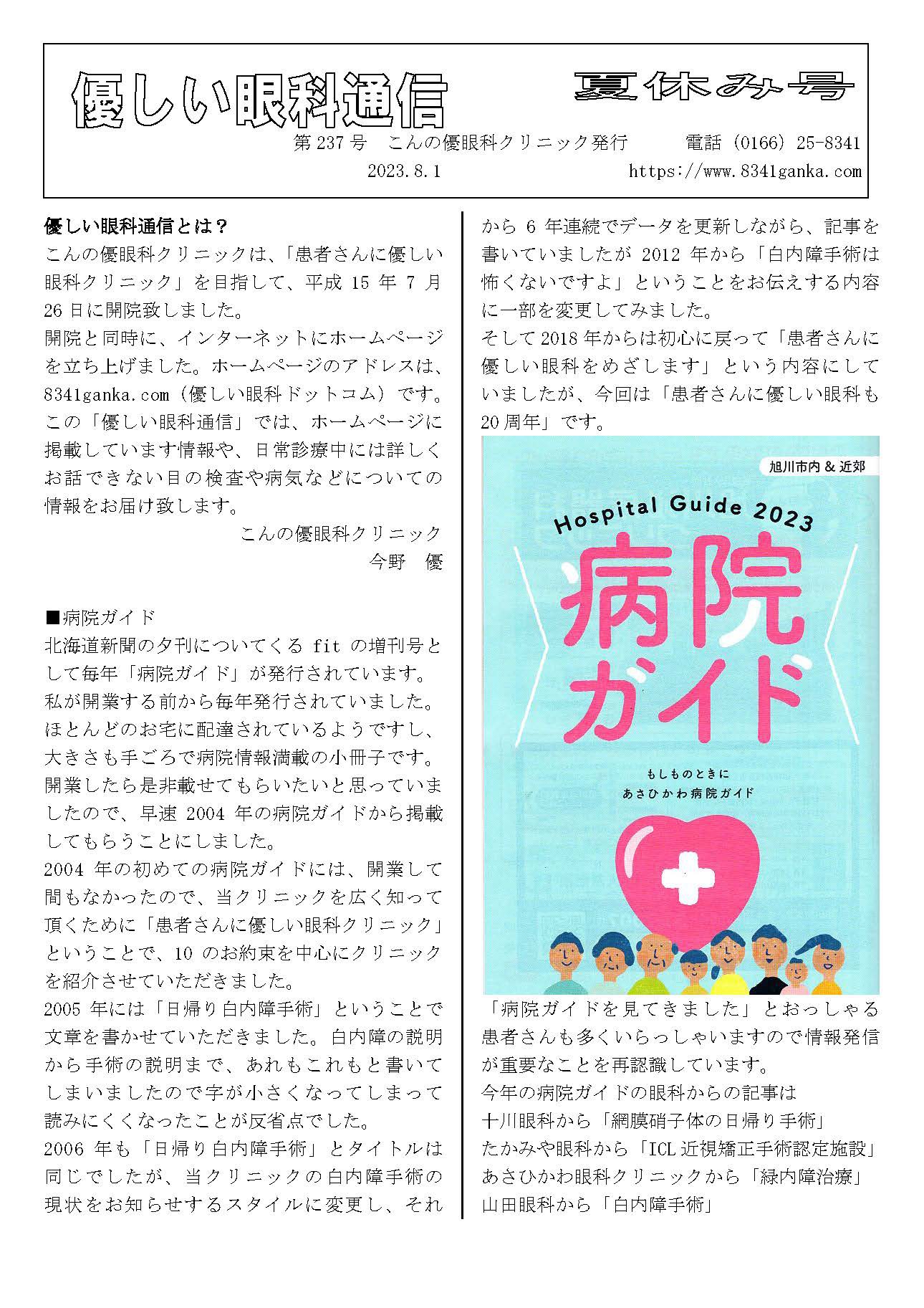 こんの優眼科クリニックは、「患者さんに優しい眼科クリニック」を目指して、平成15年7月26日に開院致しました。開院と同時に、インターネットにホームページを立ち上げました。ホームページのアドレスは8341ganka.com(優しい眼科ドットコム)です。この「優しい眼科通信」では、ホームページに掲載しています情報や、日常診療中には詳しくお話できない目の検査や目の病気などについての情報を、お届けいたします。