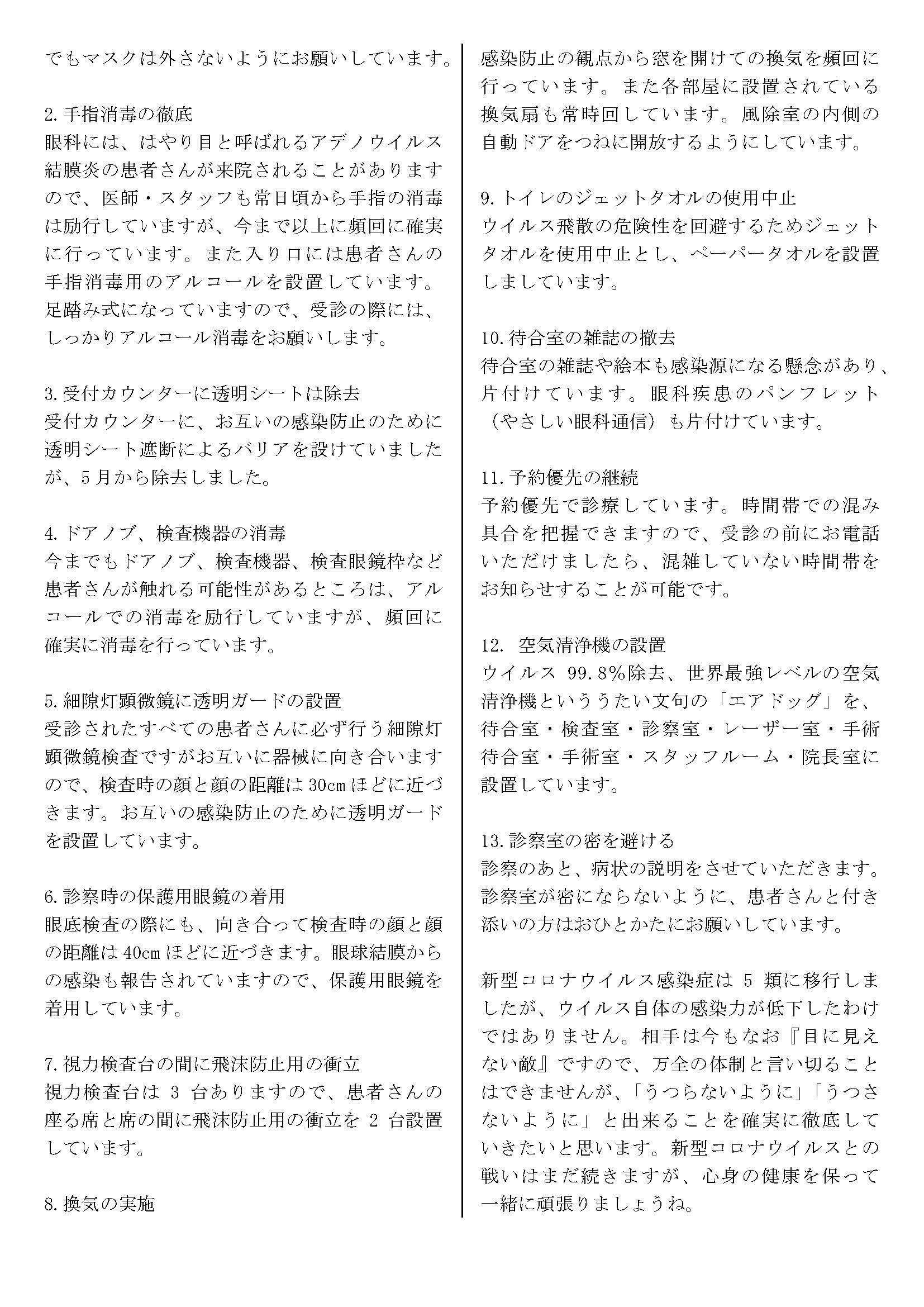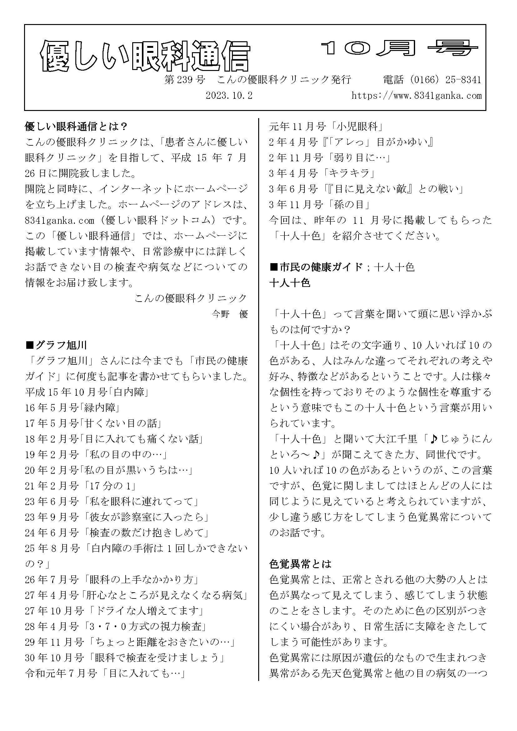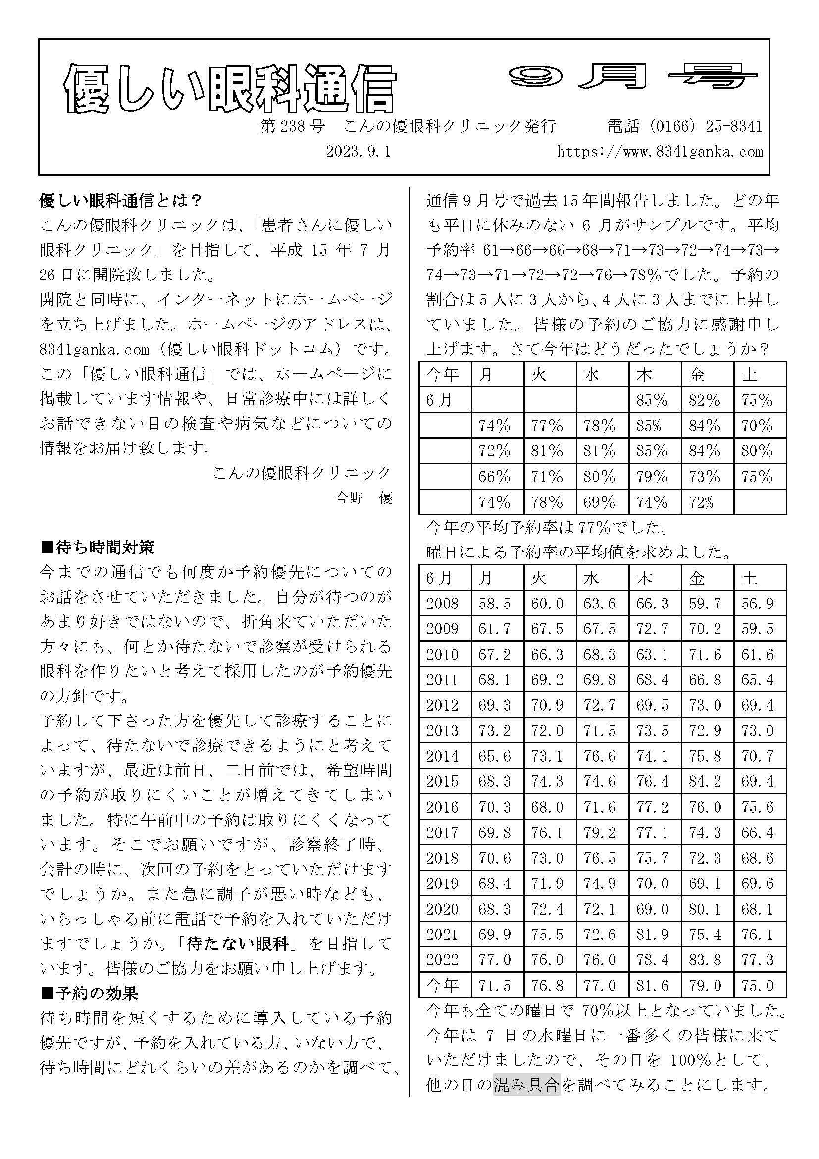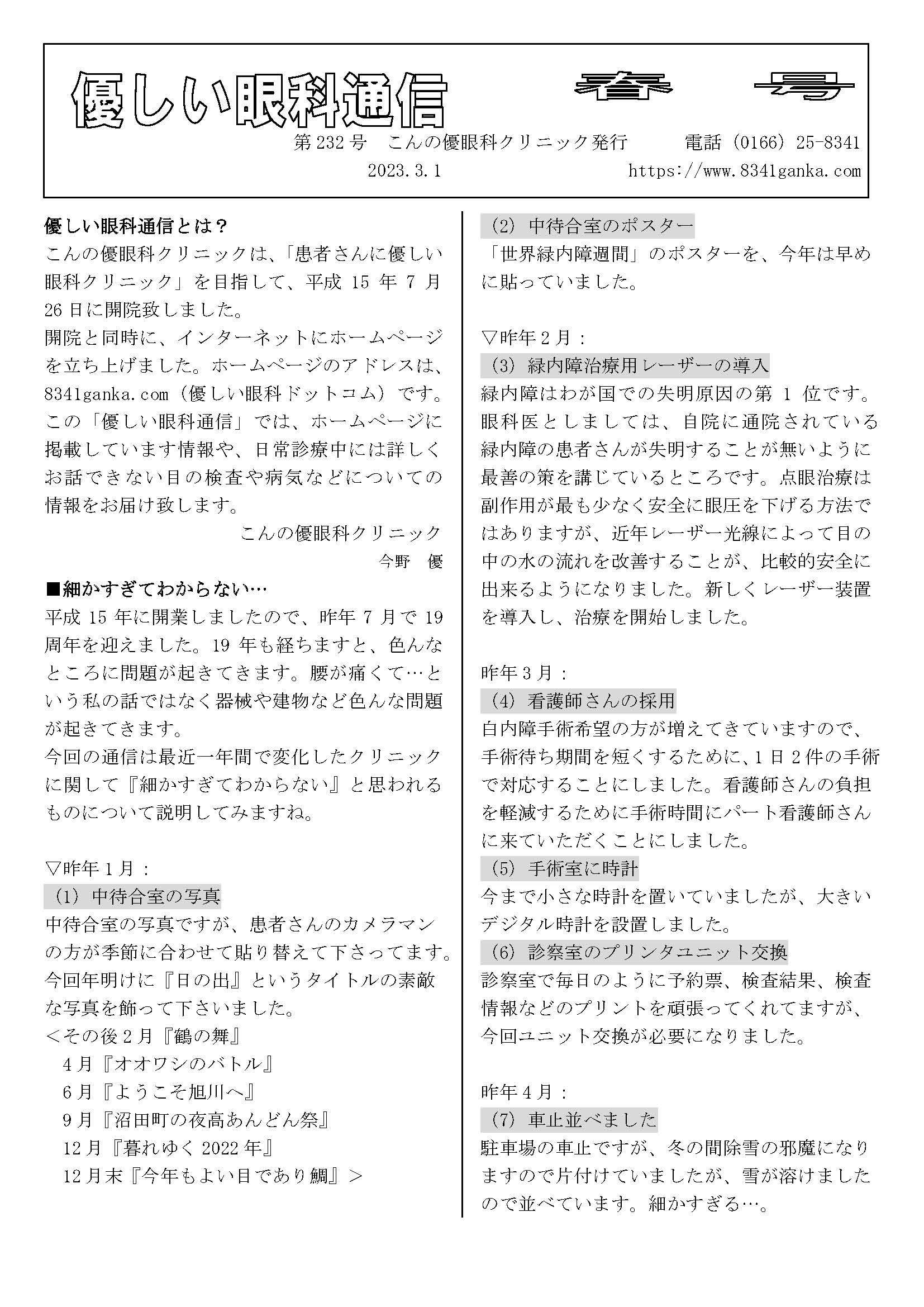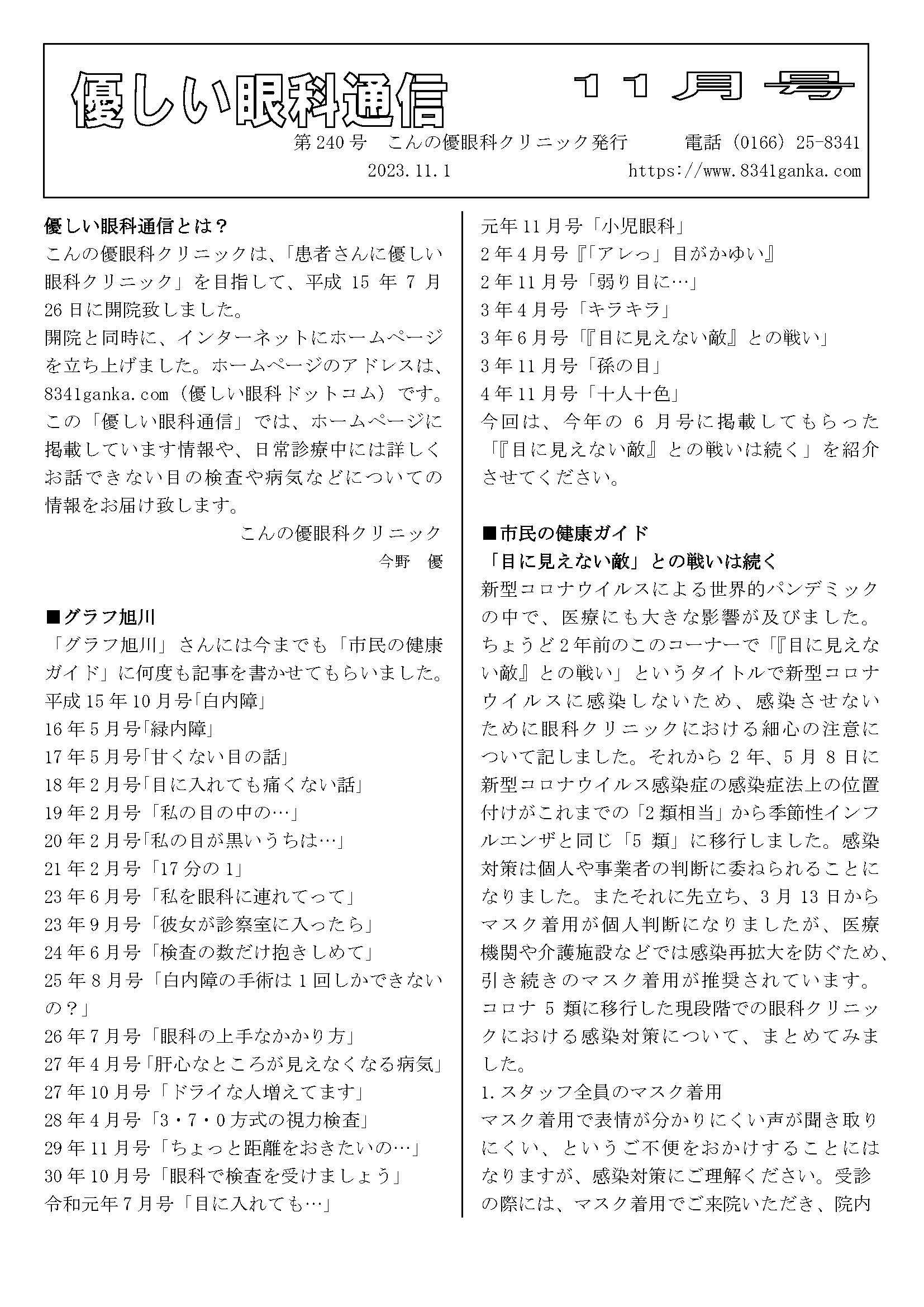 こんの優眼科クリニックは、「患者さんに優しい眼科クリニック」を目指して、平成15年7月26日に開院致しました。開院と同時に、インターネットにホームページを立ち上げました。ホームページのアドレスは8341ganka.com(優しい眼科ドットコム)です。この「優しい眼科通信」では、ホームページに掲載しています情報や、日常診療中には詳しくお話できない目の検査や目の病気などについての情報を、お届けいたします。