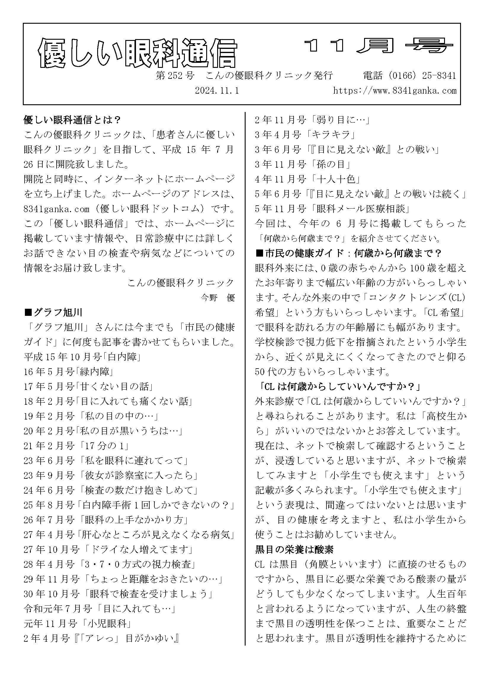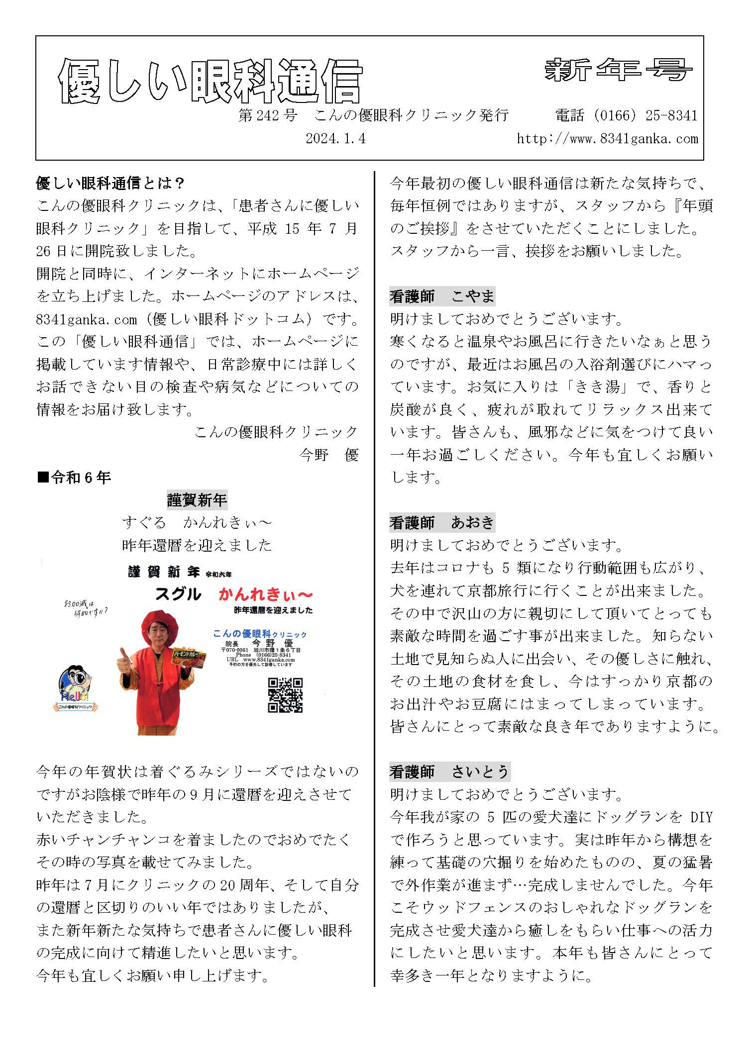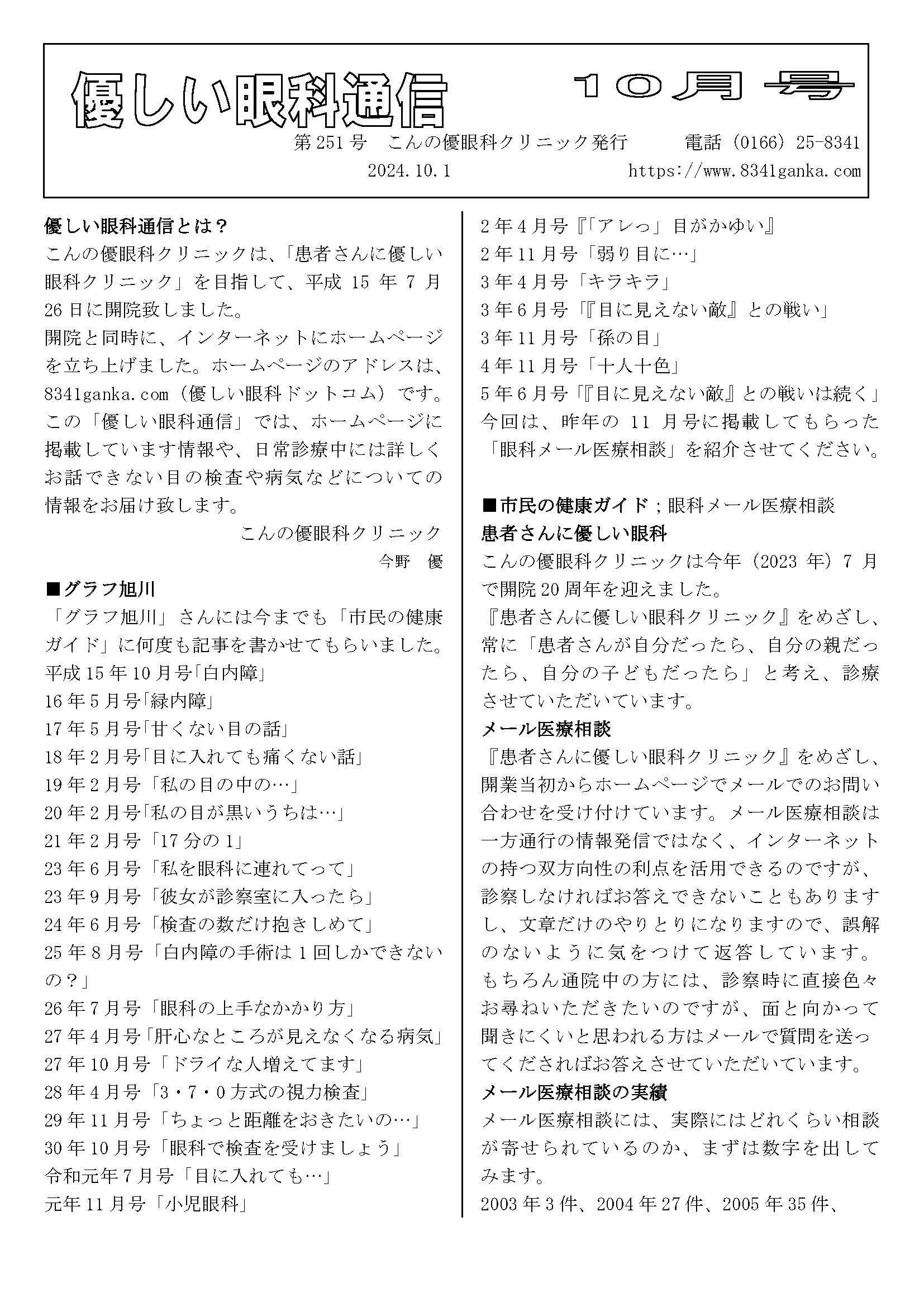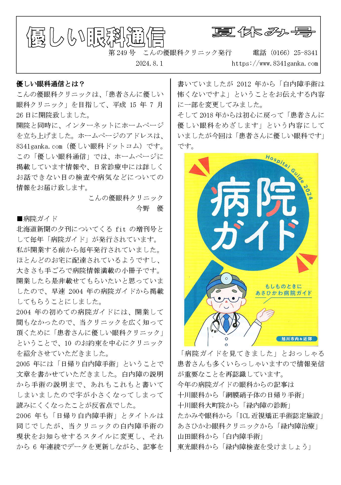 こんの優眼科クリニックは、「患者さんに優しい眼科クリニック」を目指して、平成15年7月26日に開院致しました。開院と同時に、インターネットにホームページを立ち上げました。ホームページのアドレスは8341ganka.com(優しい眼科ドットコム)です。この「優しい眼科通信」では、ホームページに掲載しています情報や、日常診療中には詳しくお話できない目の検査や目の病気などについての情報を、お届けいたします。