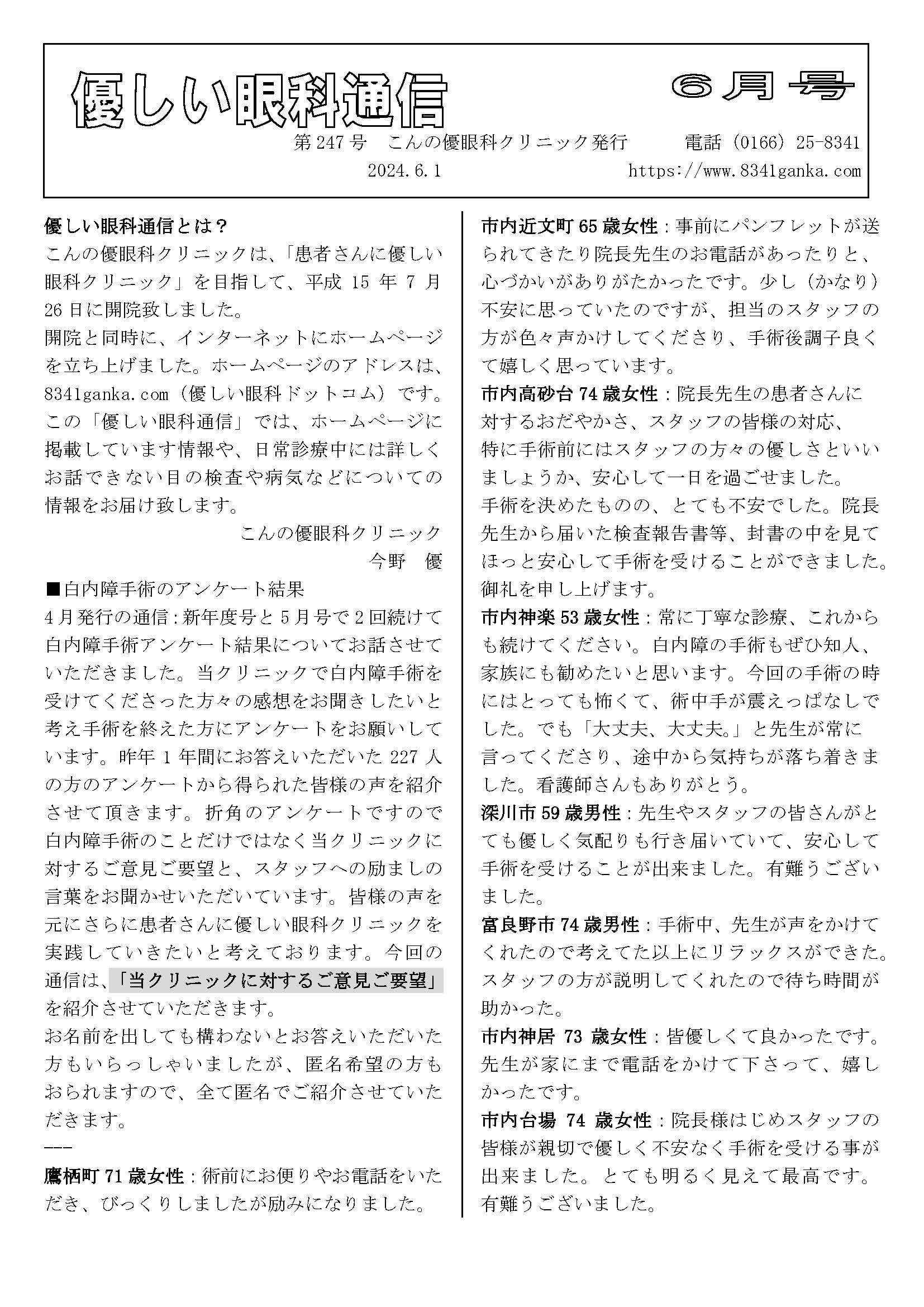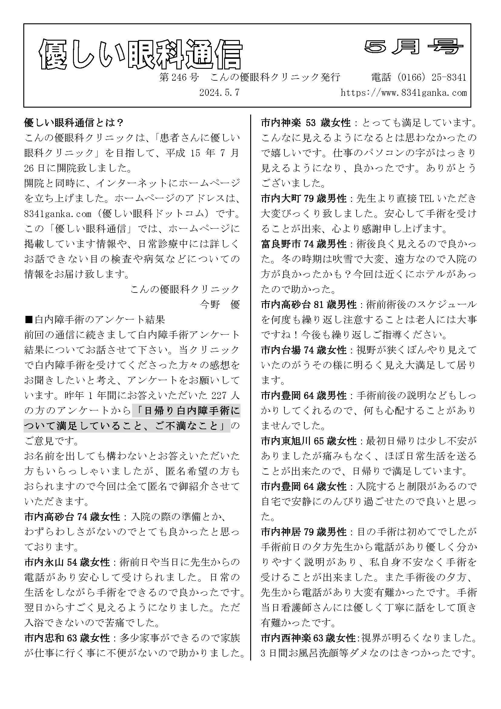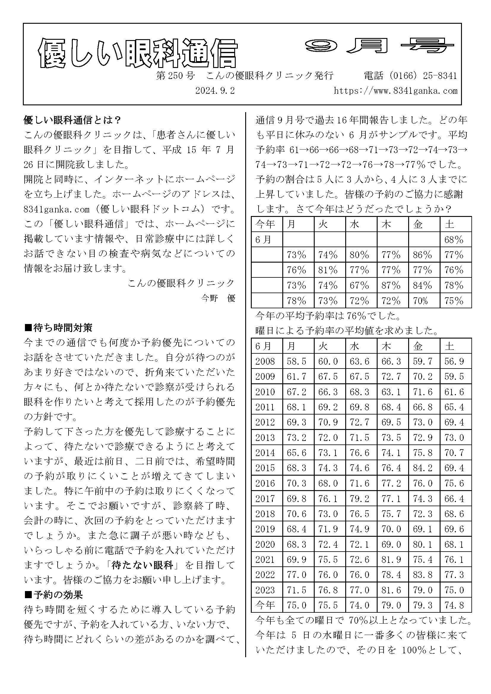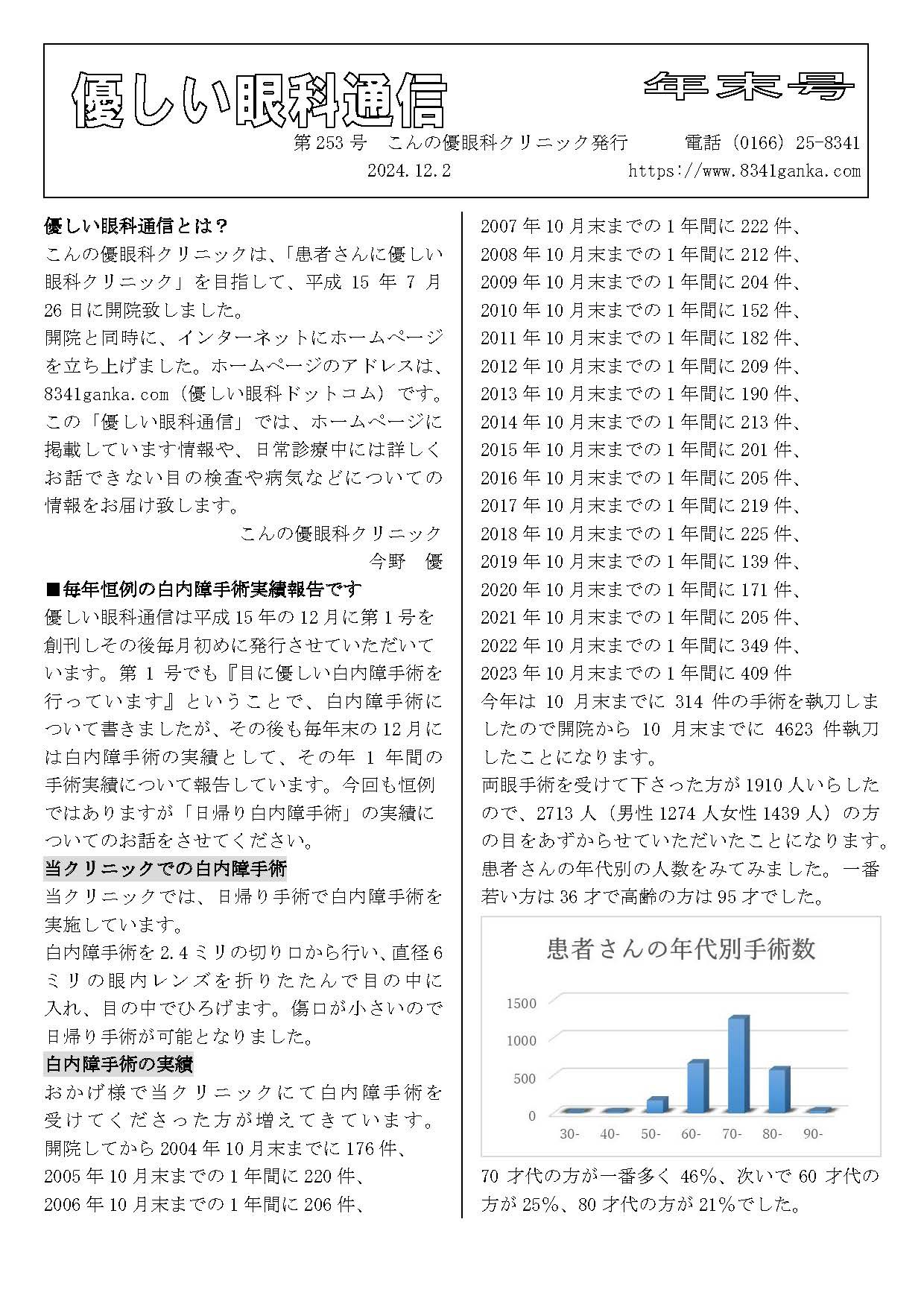 こんの優眼科クリニックは、「患者さんに優しい眼科クリニック」を目指して、平成15年7月26日に開院致しました。開院と同時に、インターネットにホームページを立ち上げました。ホームページのアドレスは8341ganka.com(優しい眼科ドットコム)です。この「優しい眼科通信」では、ホームページに掲載しています情報や、日常診療中には詳しくお話できない目の検査や目の病気などについての情報を、お届けいたします。