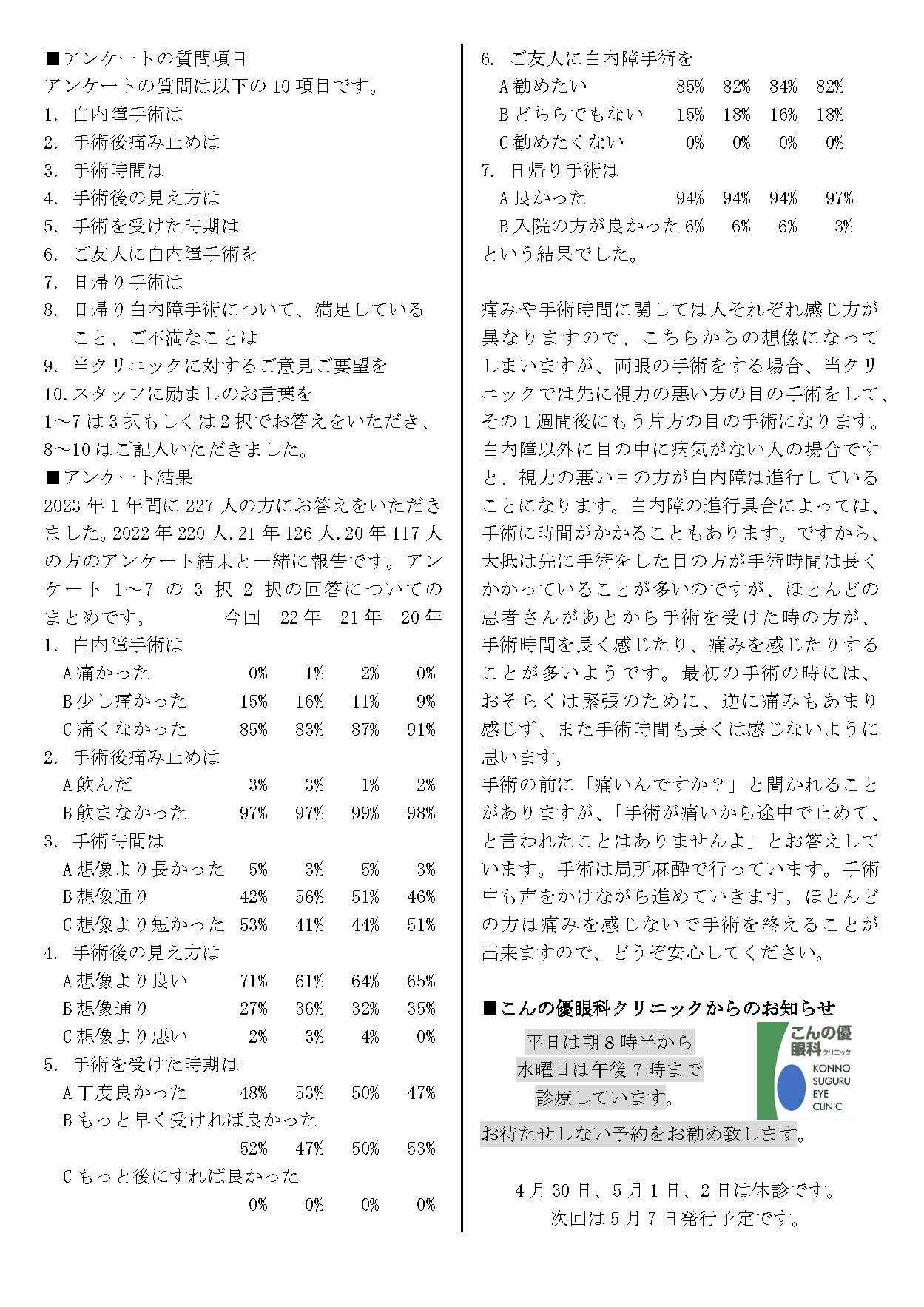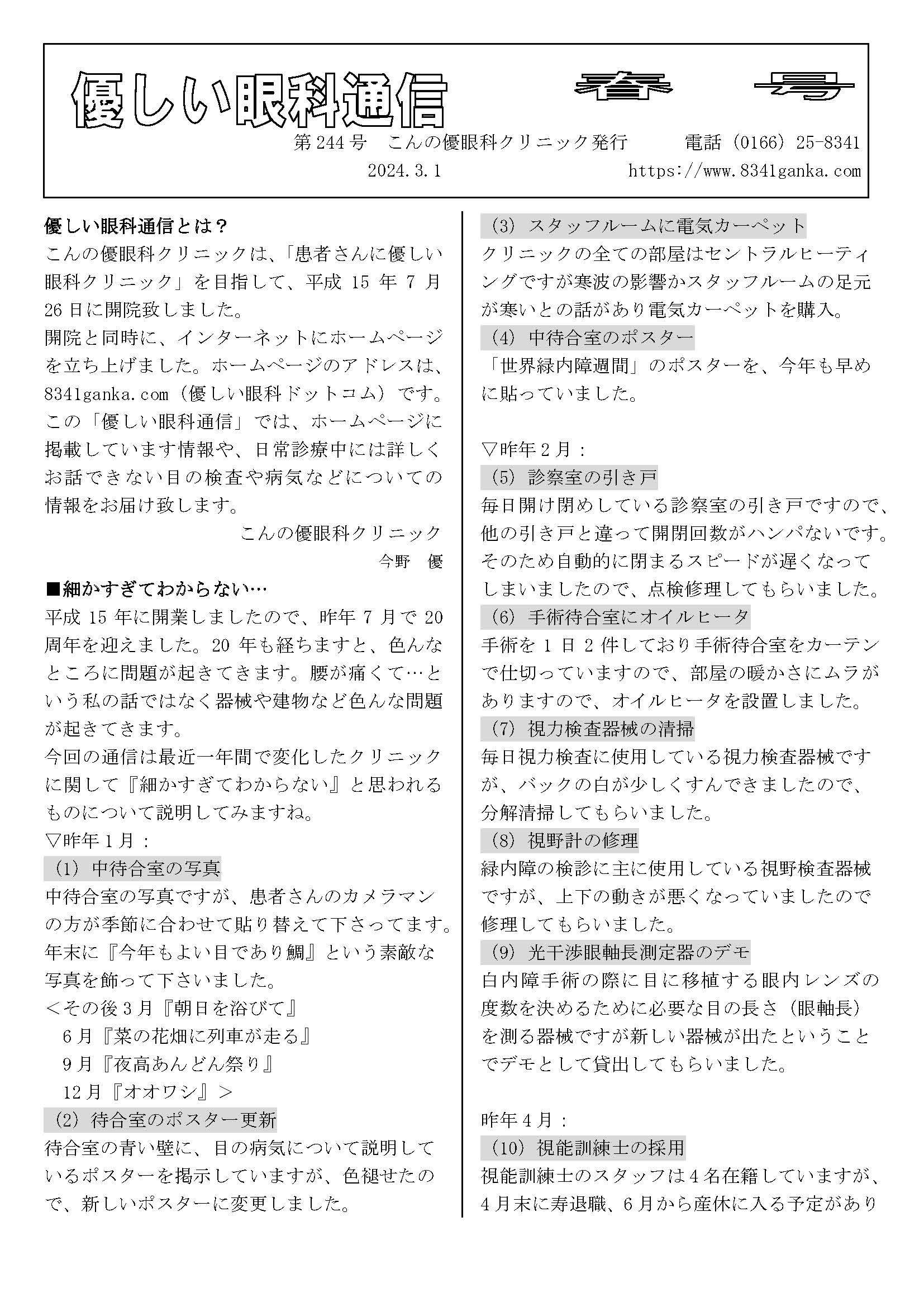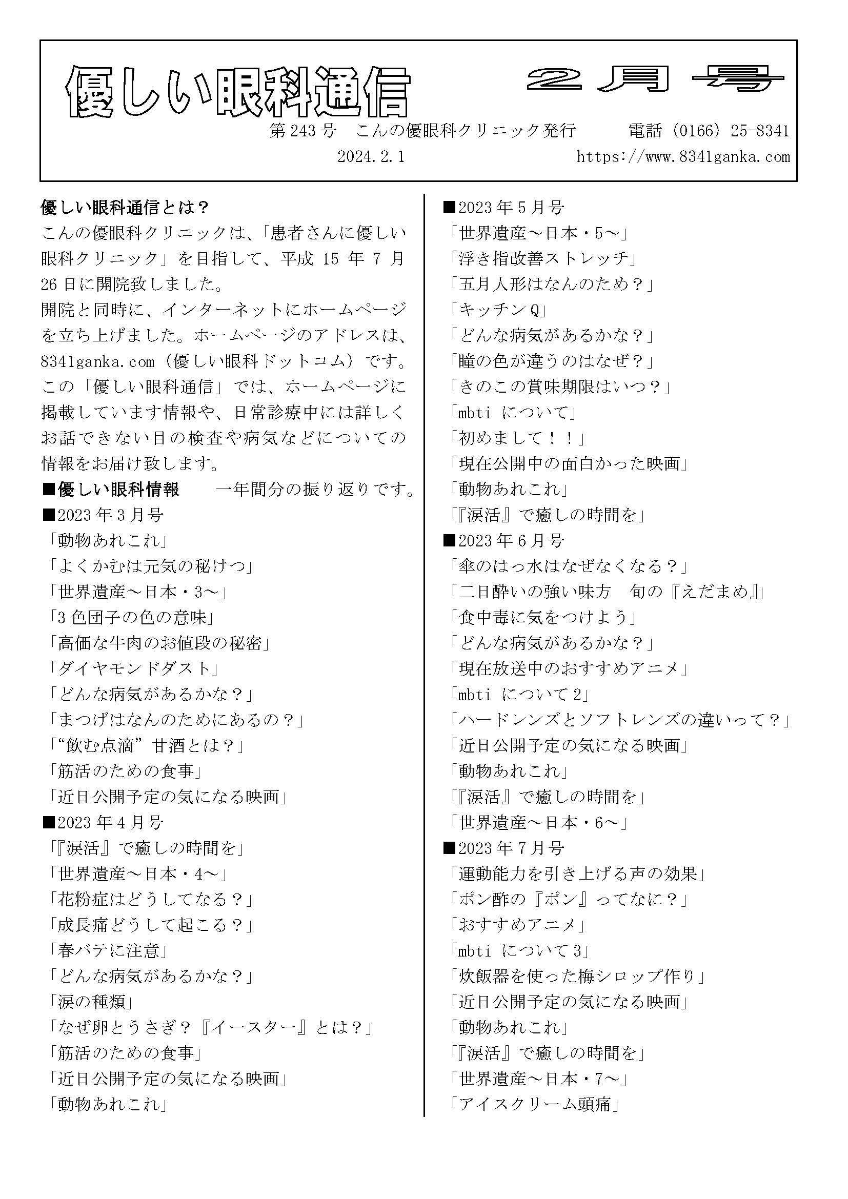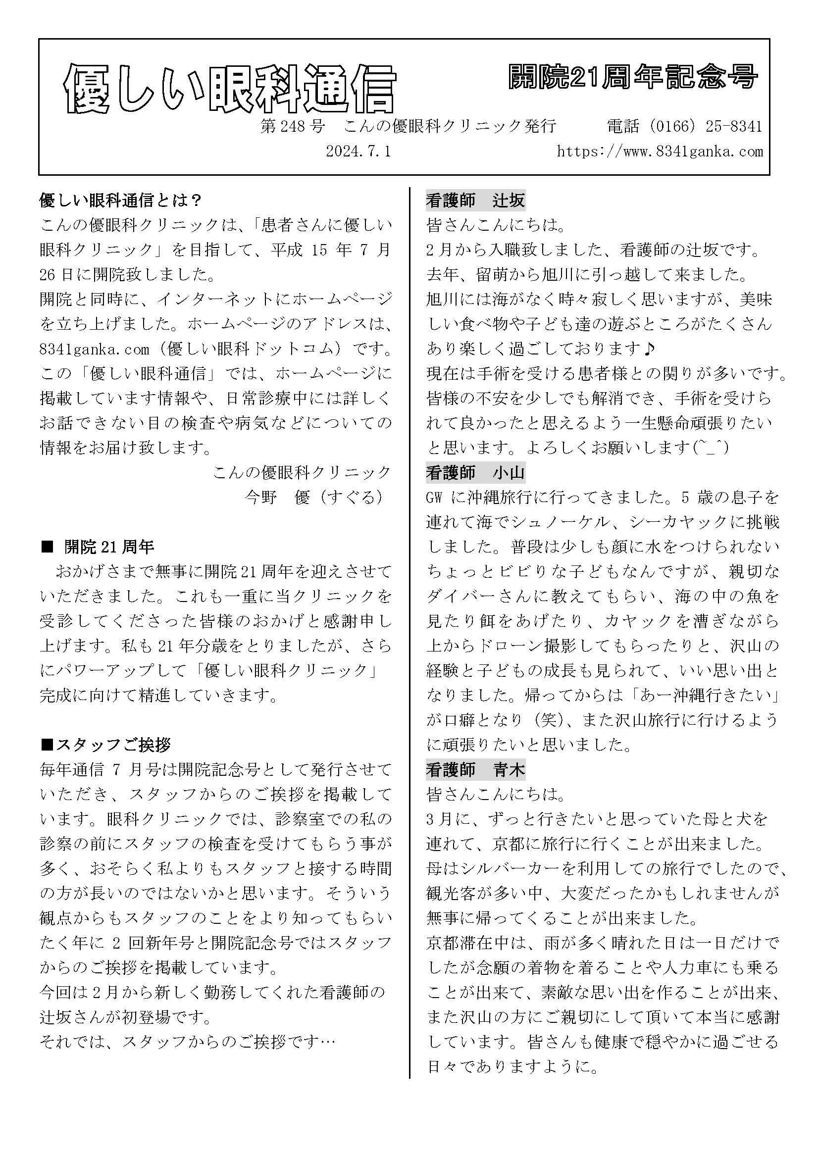 こんの優眼科クリニックは、「患者さんに優しい眼科クリニック」を目指して、平成15年7月26日に開院致しました。開院と同時に、インターネットにホームページを立ち上げました。ホームページのアドレスは8341ganka.com(優しい眼科ドットコム)です。この「優しい眼科通信」では、ホームページに掲載しています情報や、日常診療中には詳しくお話できない目の検査や目の病気などについての情報を、お届けいたします。